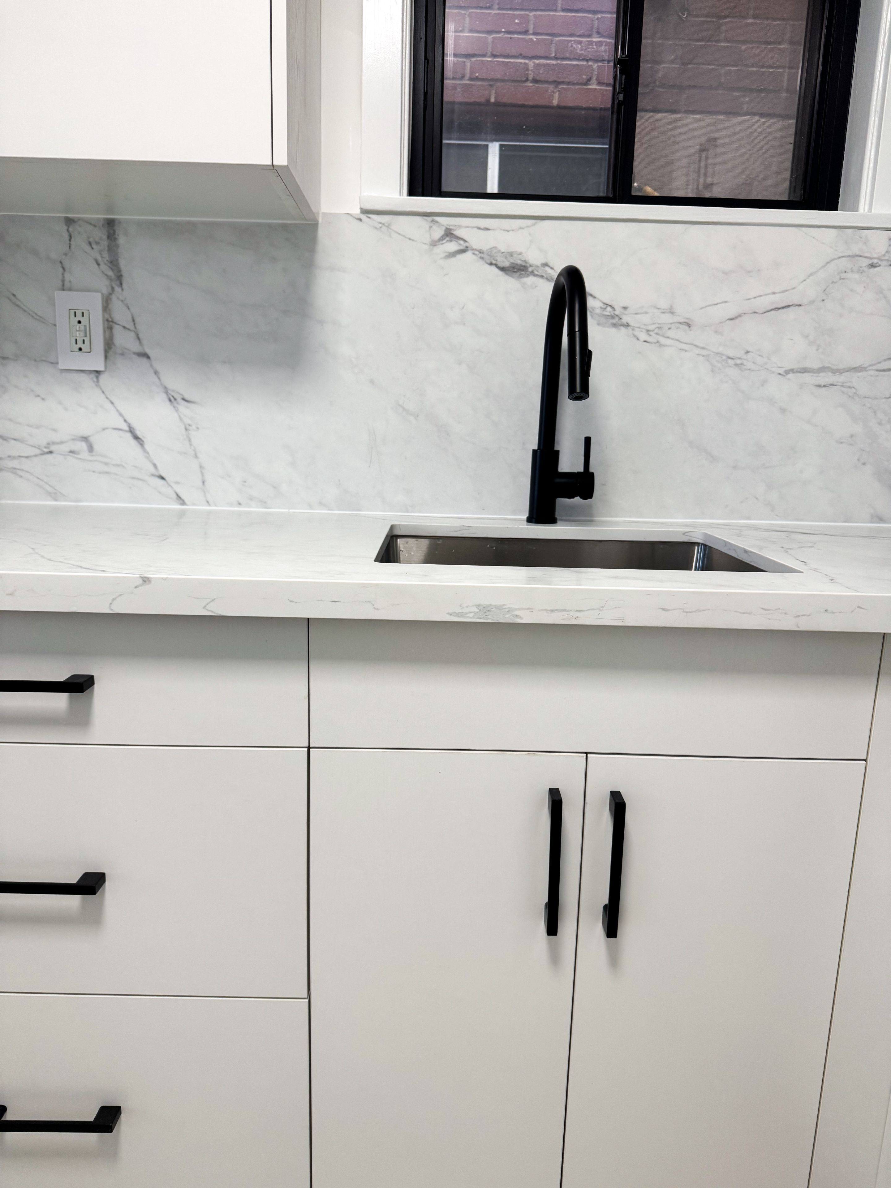 • Modern kitchen featuring sleek quartz countertops for cooking.