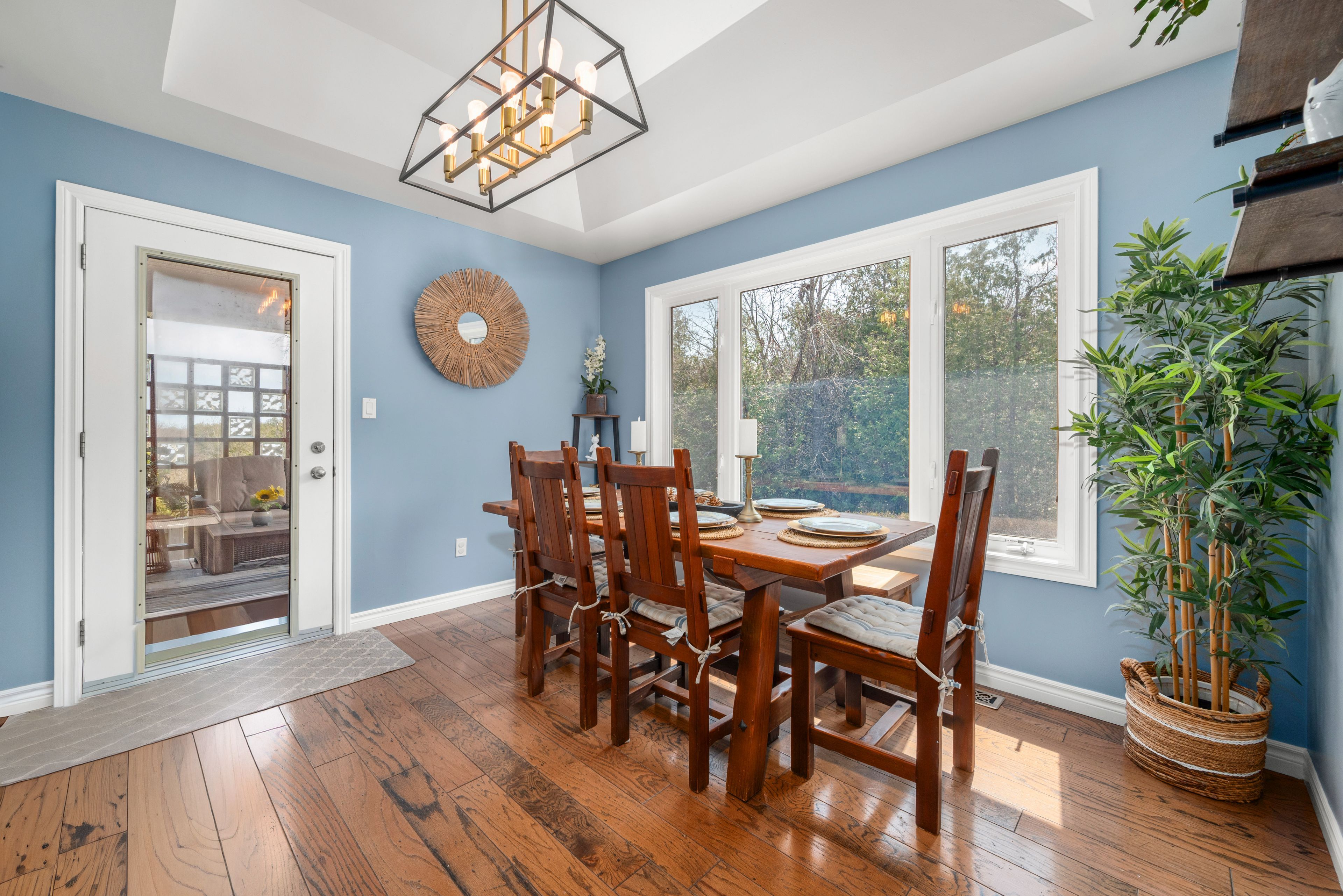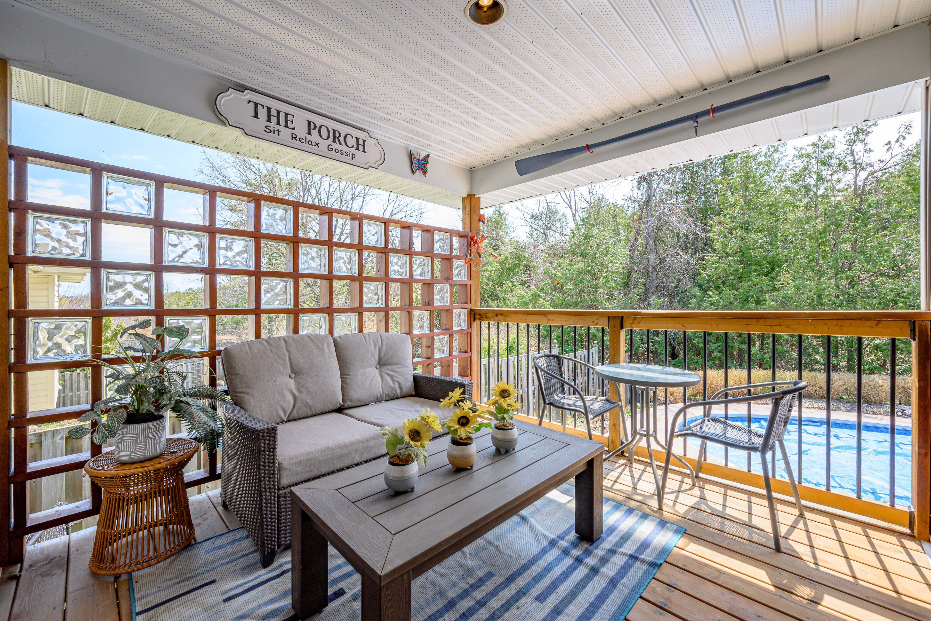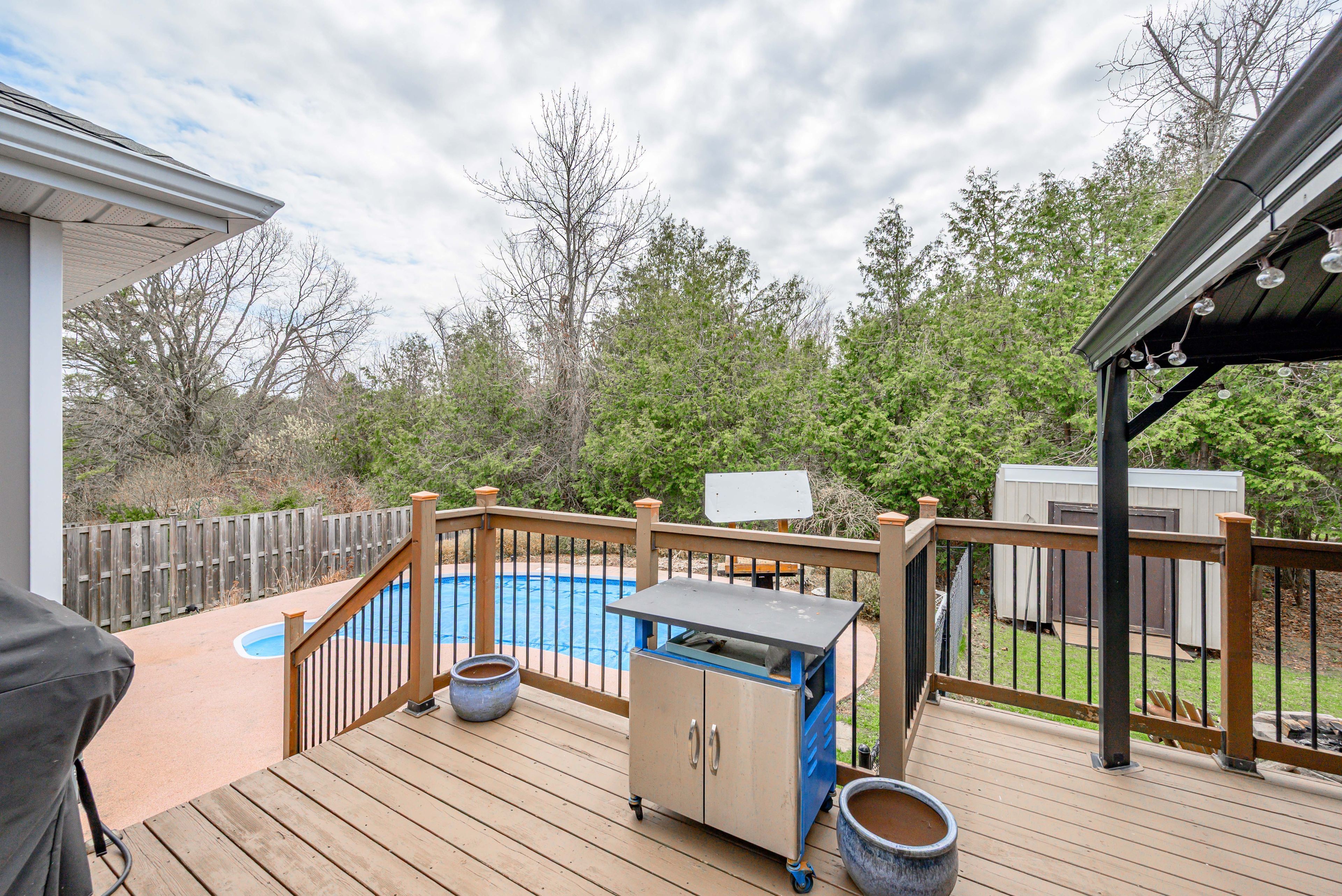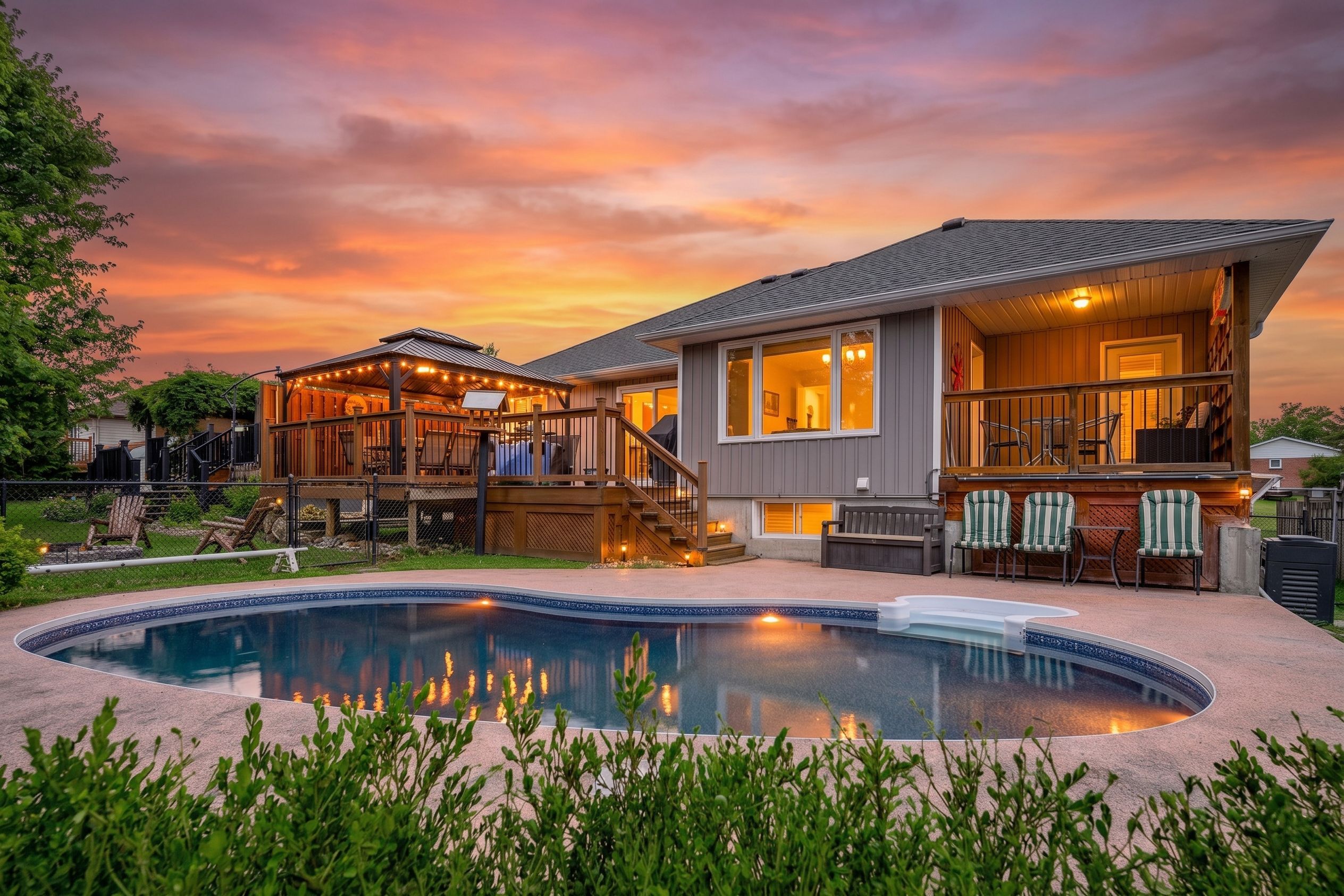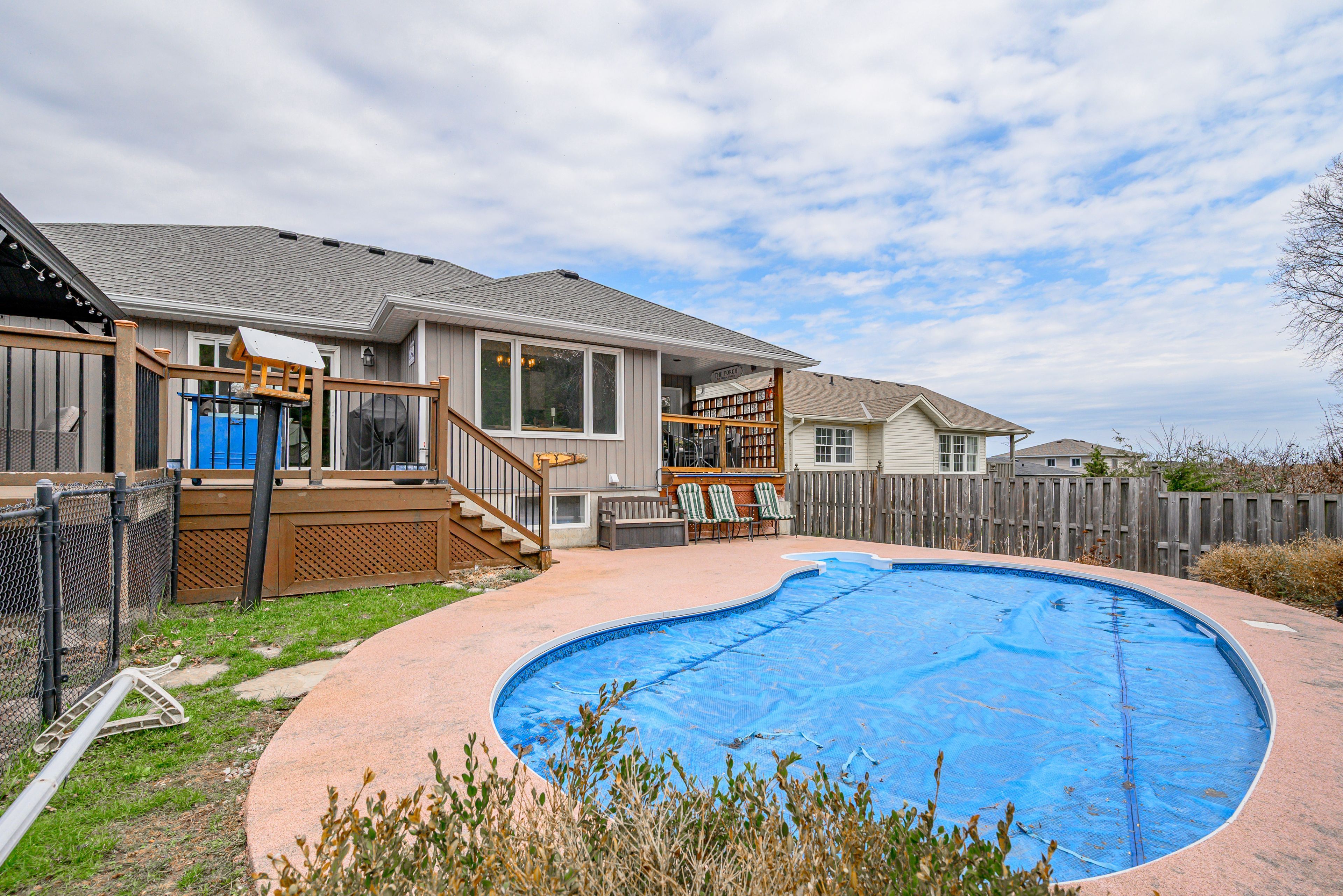 Welcome to this beautifully crafted custom-built bungalow, where comfort meets thoughtful design and everyday living feels just a little more special. The living room invites you to step outside onto your private deck-perfect for summer evenings and entertaining family and friends. The updated kitchen is the heart of the home, featuring quartz countertops, a generous breakfast bar with seating for four, and pantry-ideal for both busy mornings and relaxed weekend gatherings. Sun filled dining area and rich hardwood flooring throughout the main level add warmth and timeless appeal. Designed for both privacy and relaxation, the primary bedroom is set apart from the additional main floor bedrooms by the main living space and offers it's own private covered deck-your own quiet escape at the end of the day. The peaceful retreat offers a spa-like ensuite with a modern stand alone tub, separate shower, and a walk-in closet. The fully finished basement expands your living space with a welcoming family room and two additional bedrooms, plus a separate in-law suite with its own private entrance-ideal for extended family. The heated and insulated garage ensures year-round comfort and has high ceilings, while the premium lot with no homes behind provides a rare sense of space and privacy. Major exterior updates, including new siding, shingles, fascia, and soffits, offer added peace of mind. Step into your own backyard oasis, complete with an inground pool featuring an updated liner, heater, filter, and pump-perfect for making the most of warm summer days. Located handy to trail system and many amenities. Some photos are ai rendered.