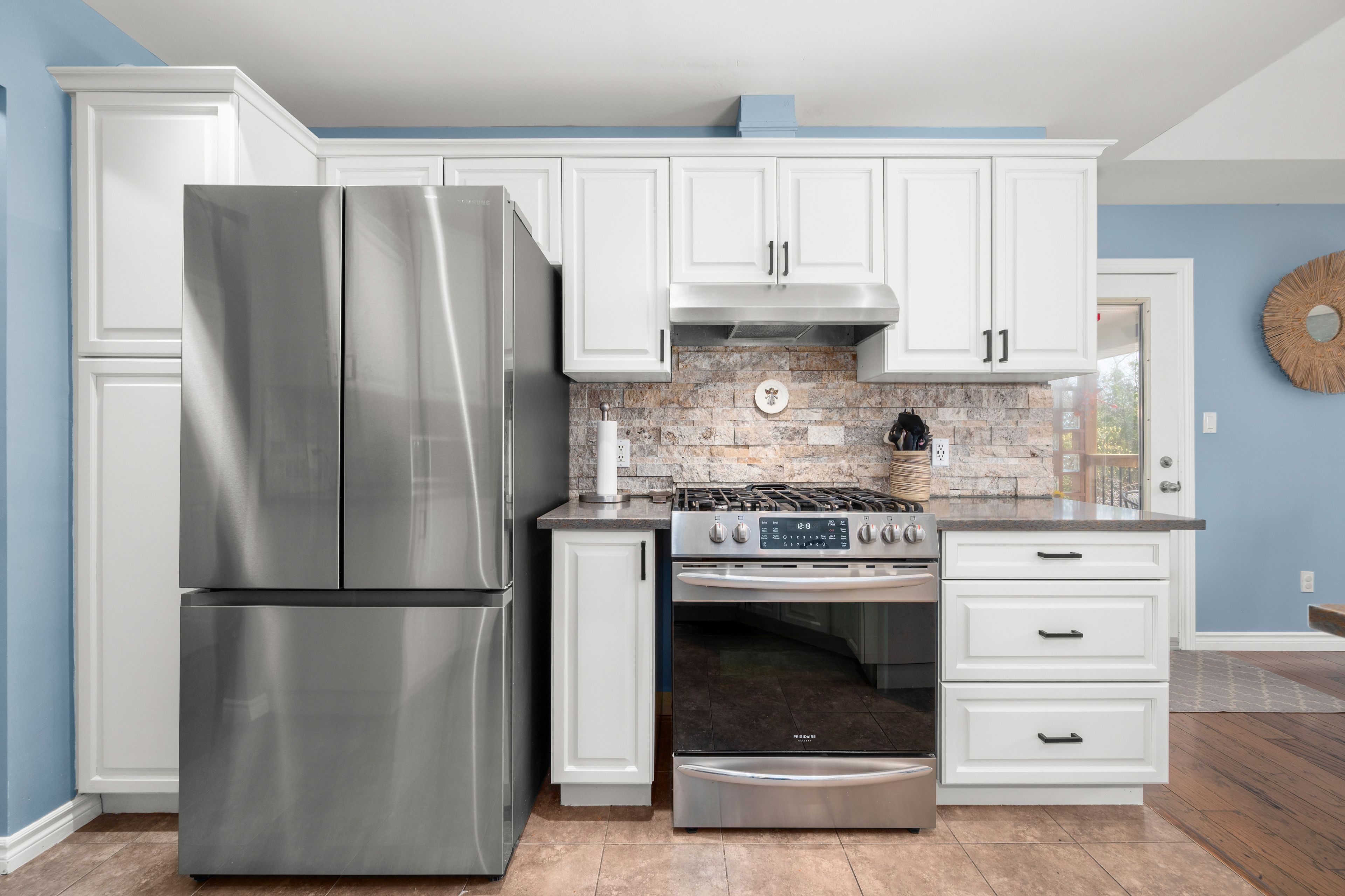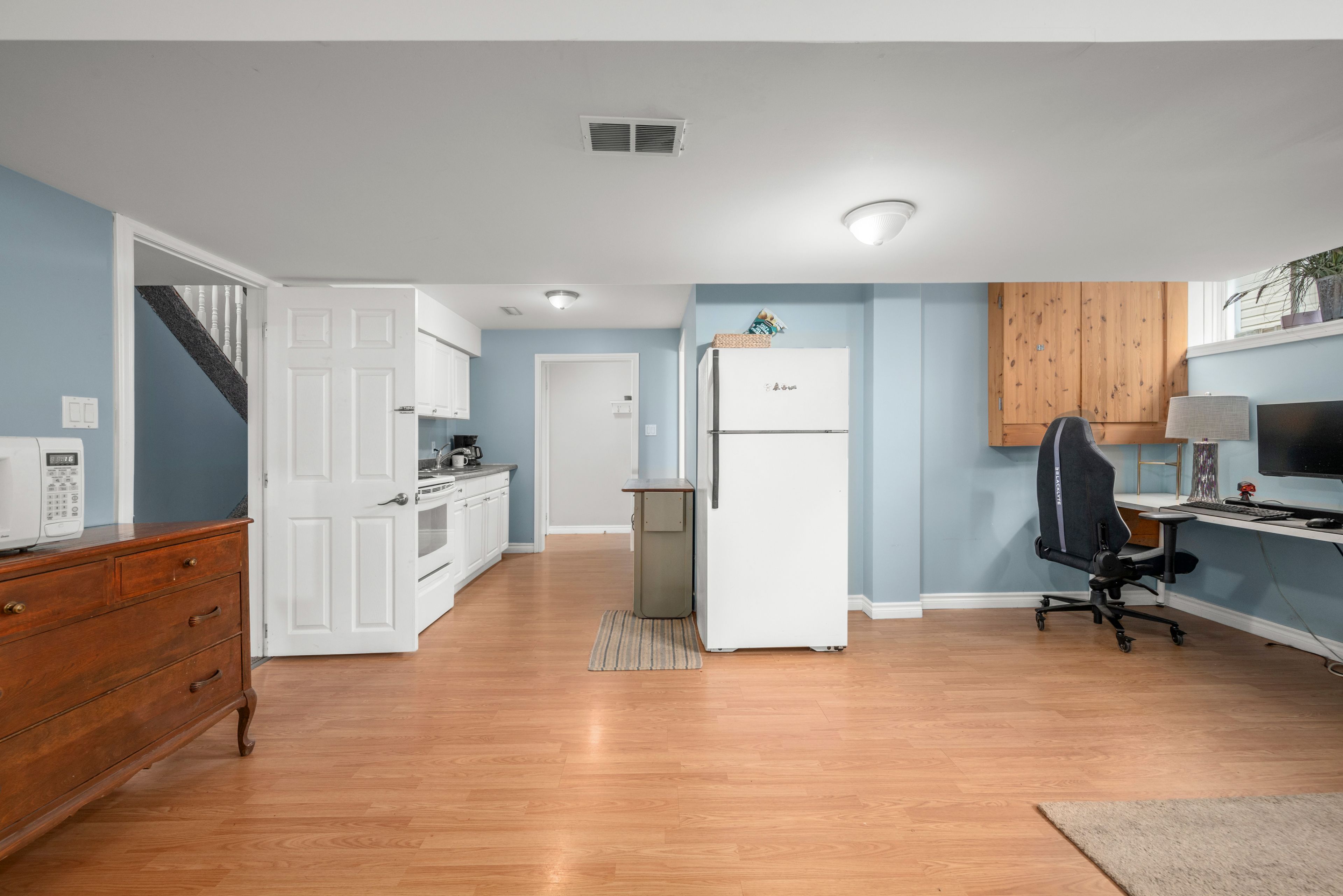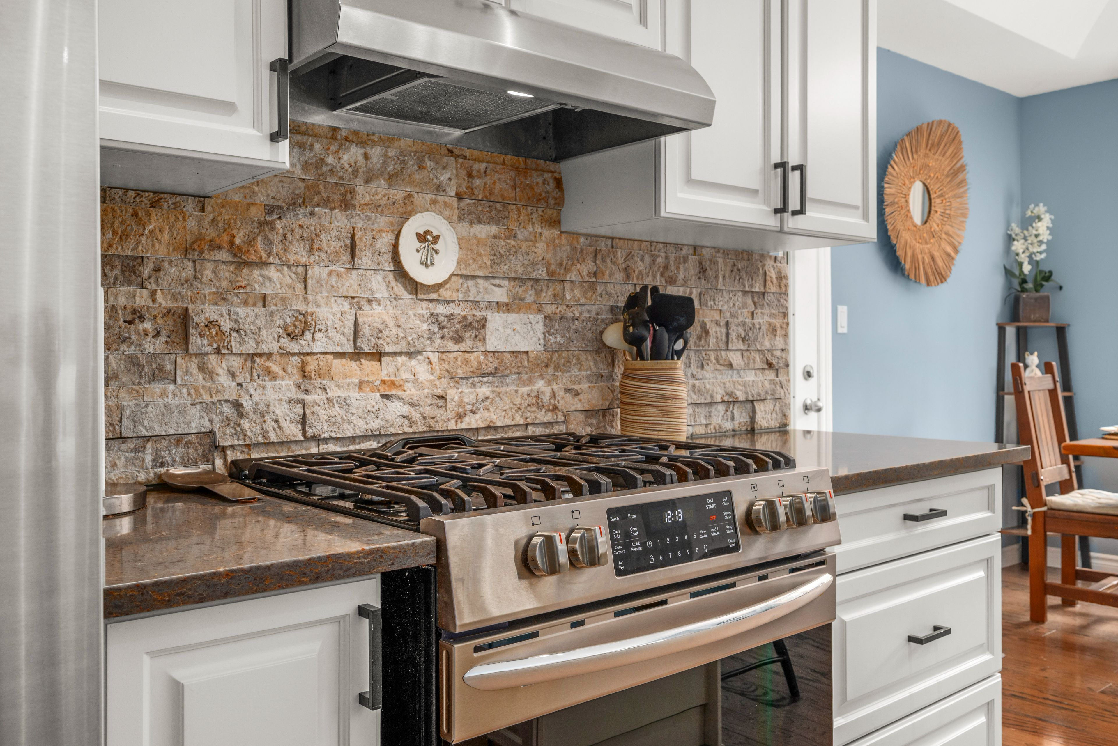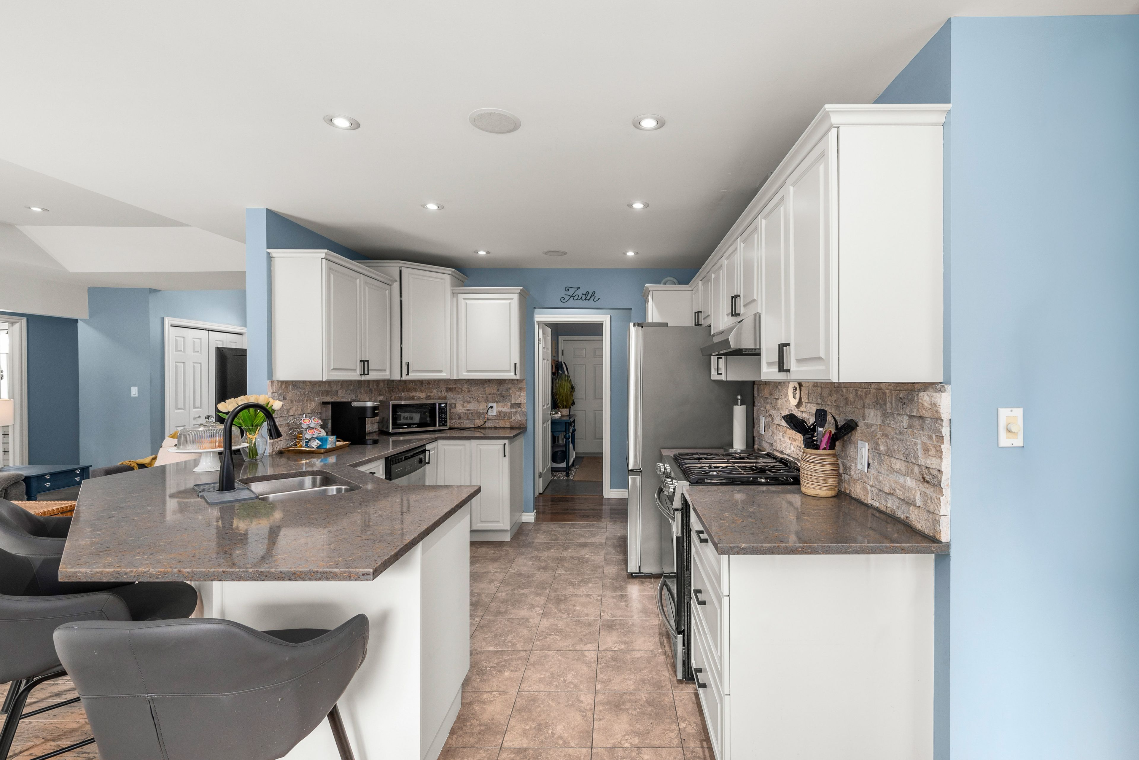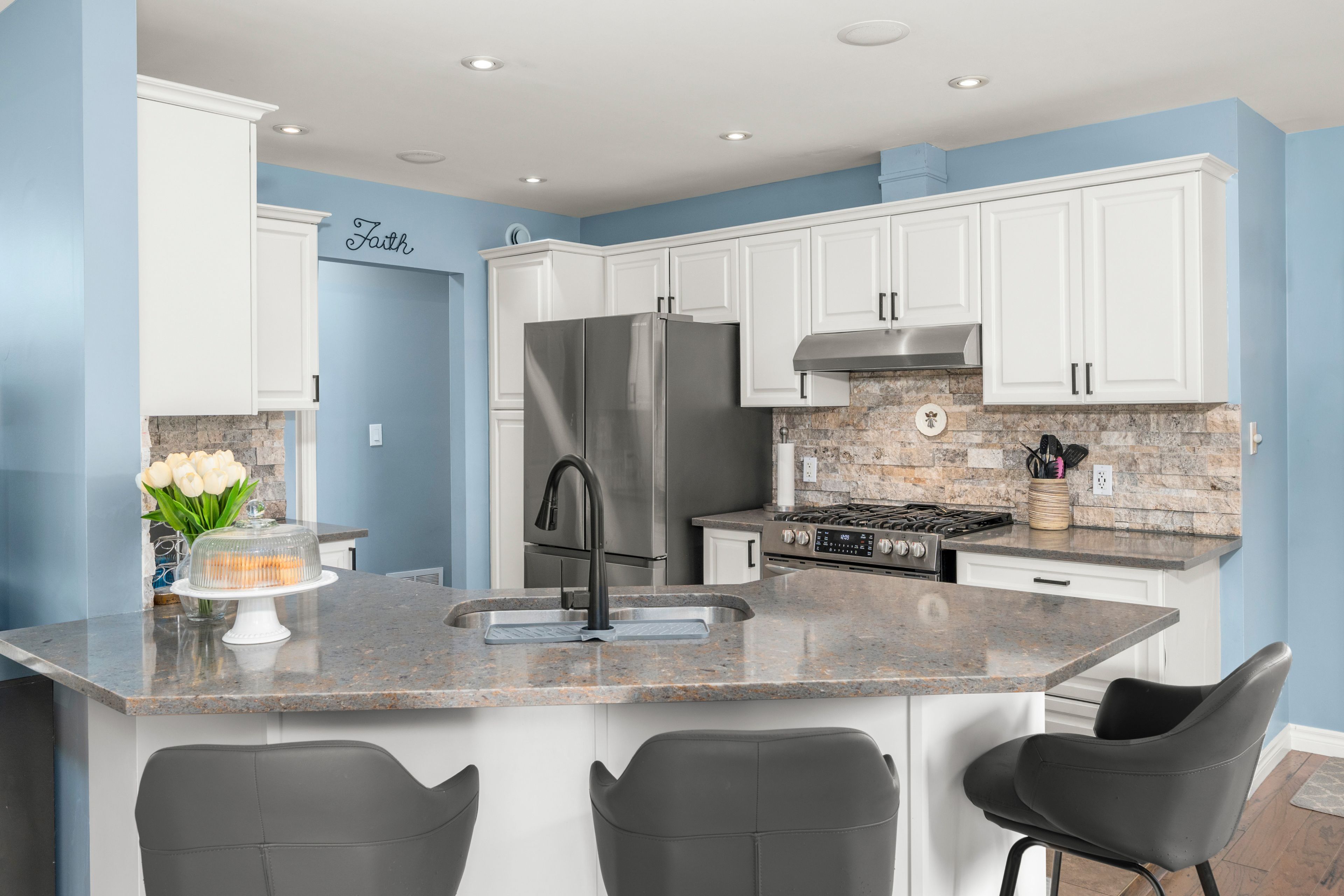 • Spacious updated kitchen with quartz countertops and breakfast bar.
