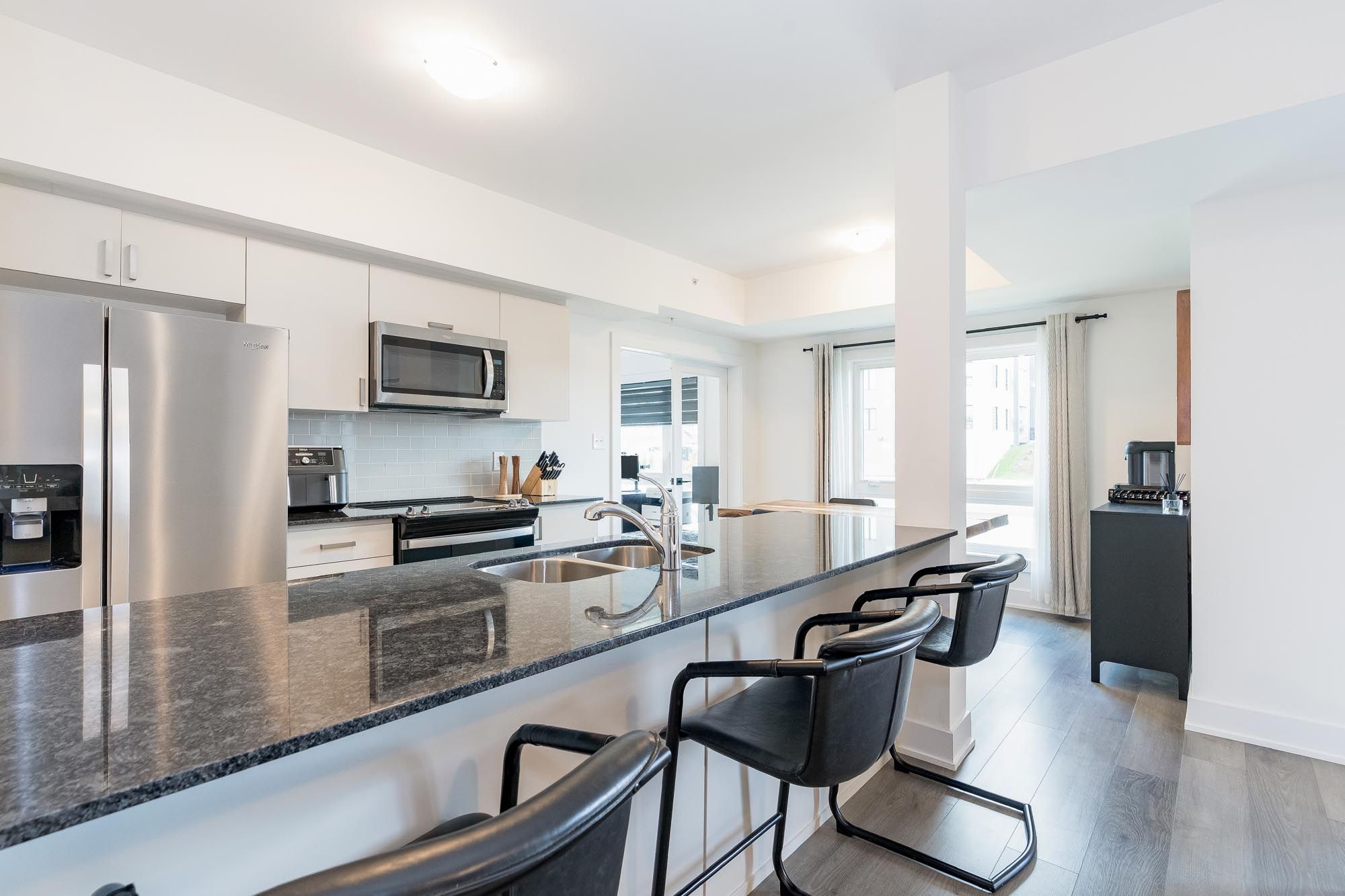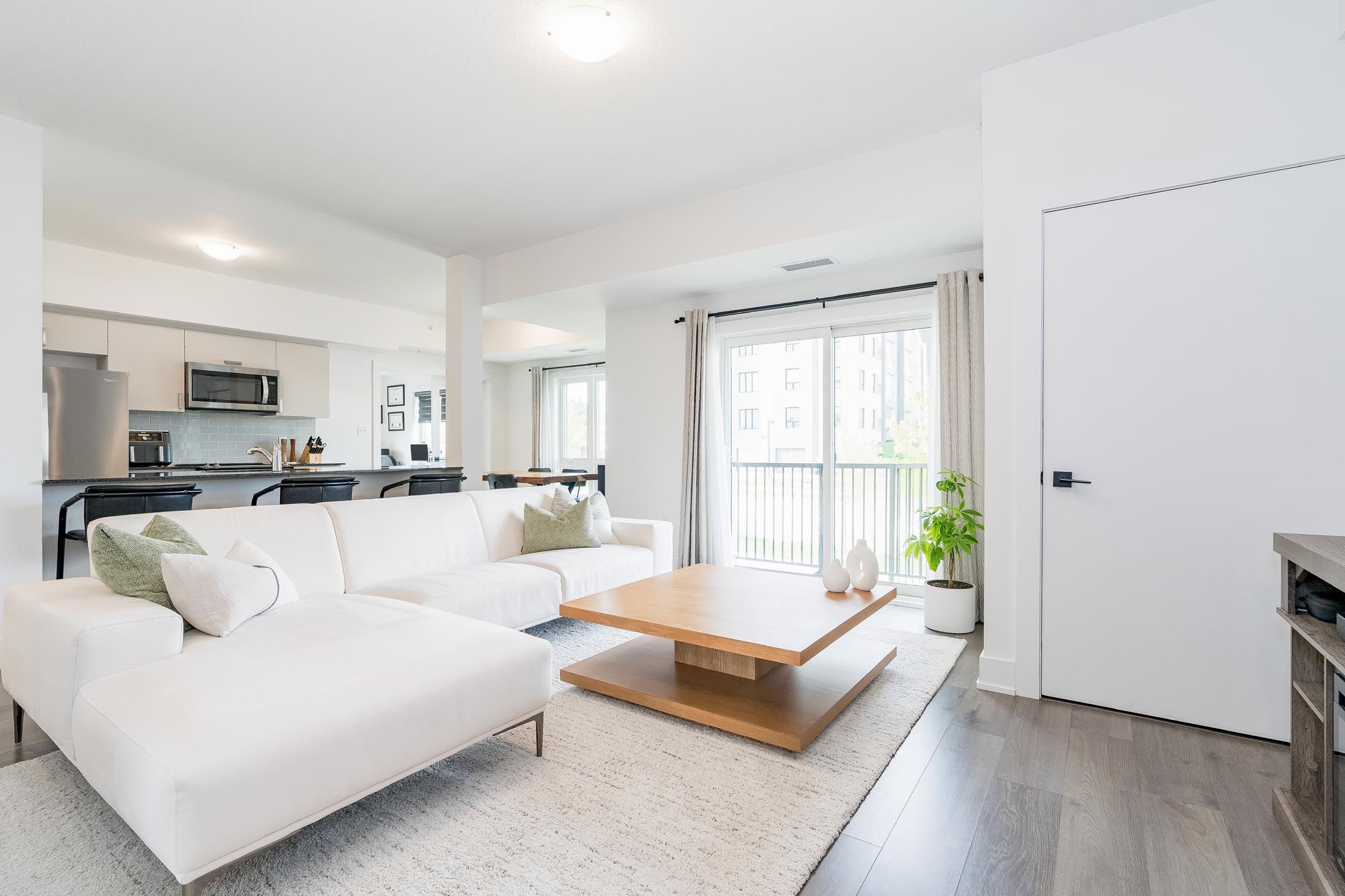 Top 5 reasons you will love this condo: 1) enjoy this rare opportunity to own a spacious three bedroom corner condo offering 2 car parking with exceptional convenience and long-term value, all paired with a 1,207 square foot layout filled with natural light thanks to premium corner exposure and an open-concept design that feels bright and airy 2) featuring laminate hardwood in the main living areas, upgraded appliances, custom closet and pantry organizers, and an oversized washer and dryer, every detail enhances comfort and style 3) the expansive kitchen offers ample counterspace and storage and includes a gas line, while the living and dining areas extend seamlessly to a private balcony with a gas line for barbeques, a true entertainer's delight 4) the primary bedroom easily accommodates a king-sized bed, along with two spacious bedrooms perfect for family or guests, also ideal for a home office, gym, den, or creative retreat 5) built in 2023, this vibrant community offers top-notch amenities including a fitness centre, basketball court, children's playground, outdoor barbeque areas, and a communal kitchen, all just steps from everyday conveniences. 1,207 fin. Sq. Ft.