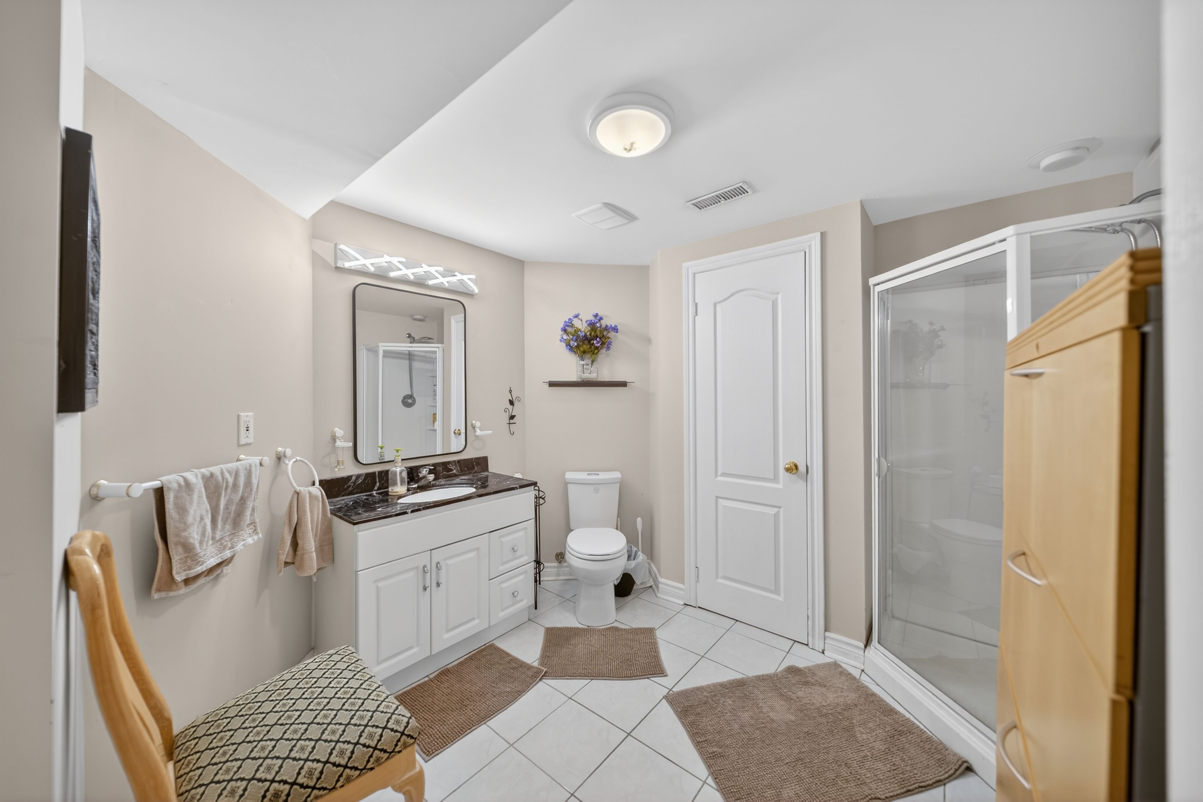 • Renovated kitchen featuring granite countertops and ample cabinetry space.