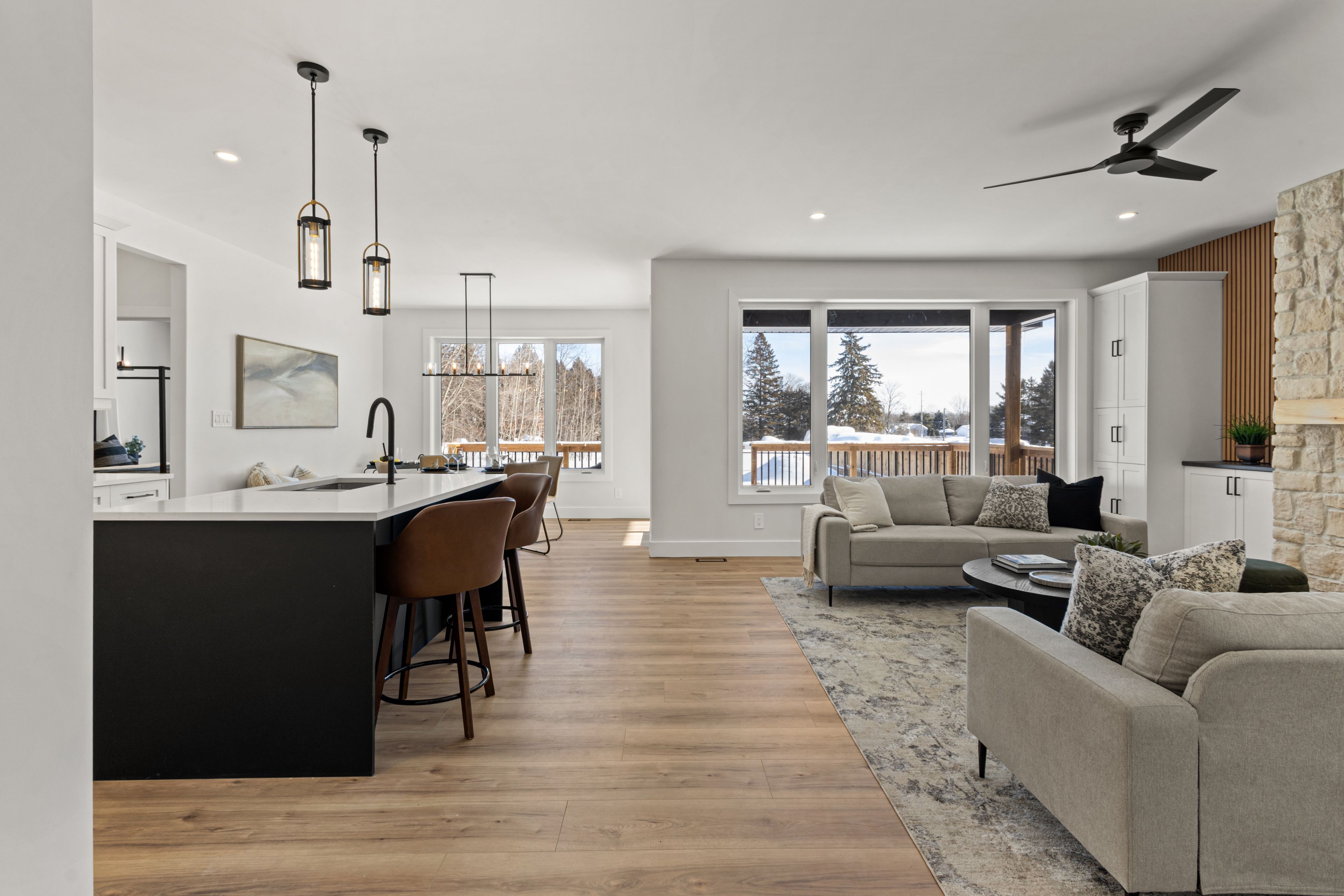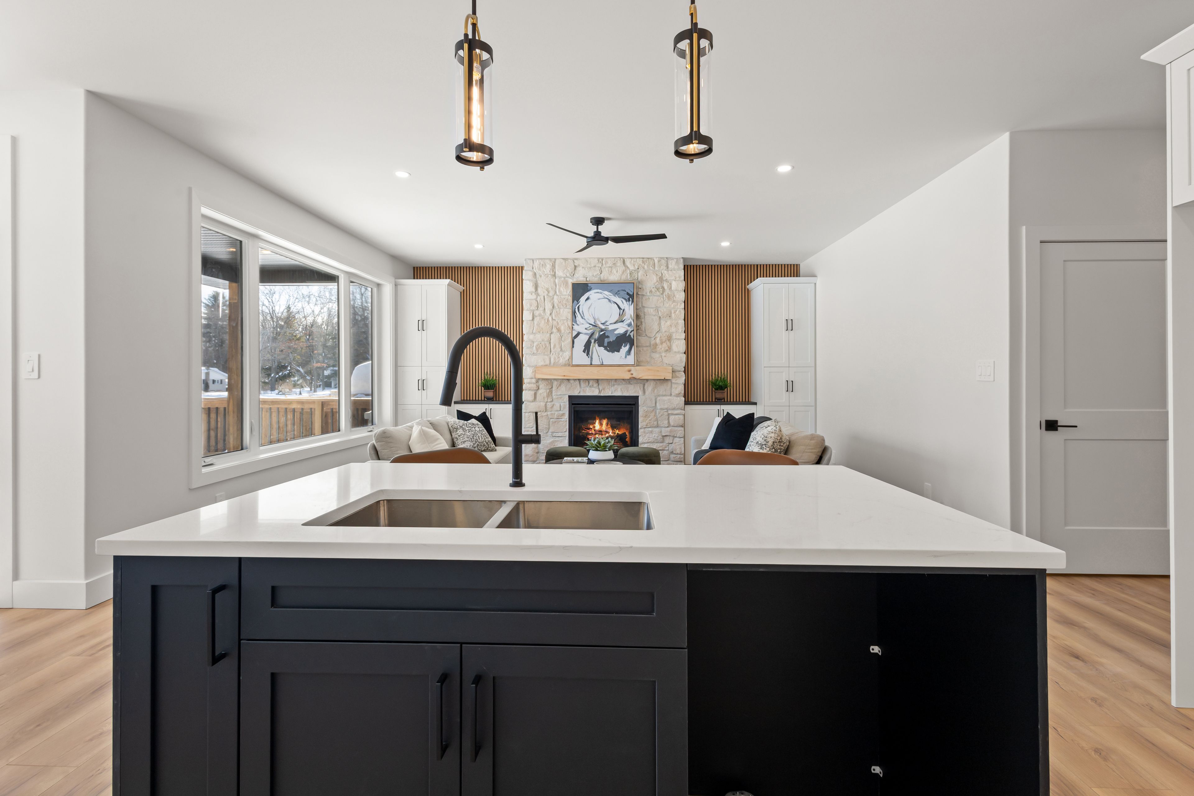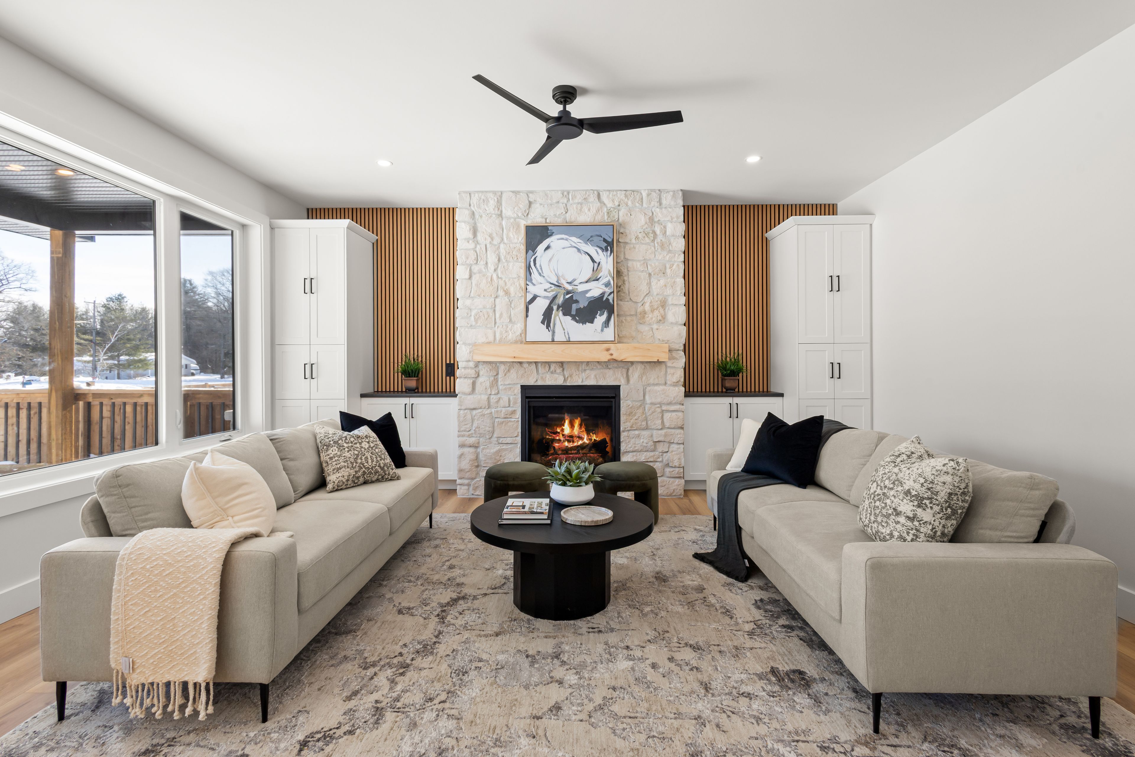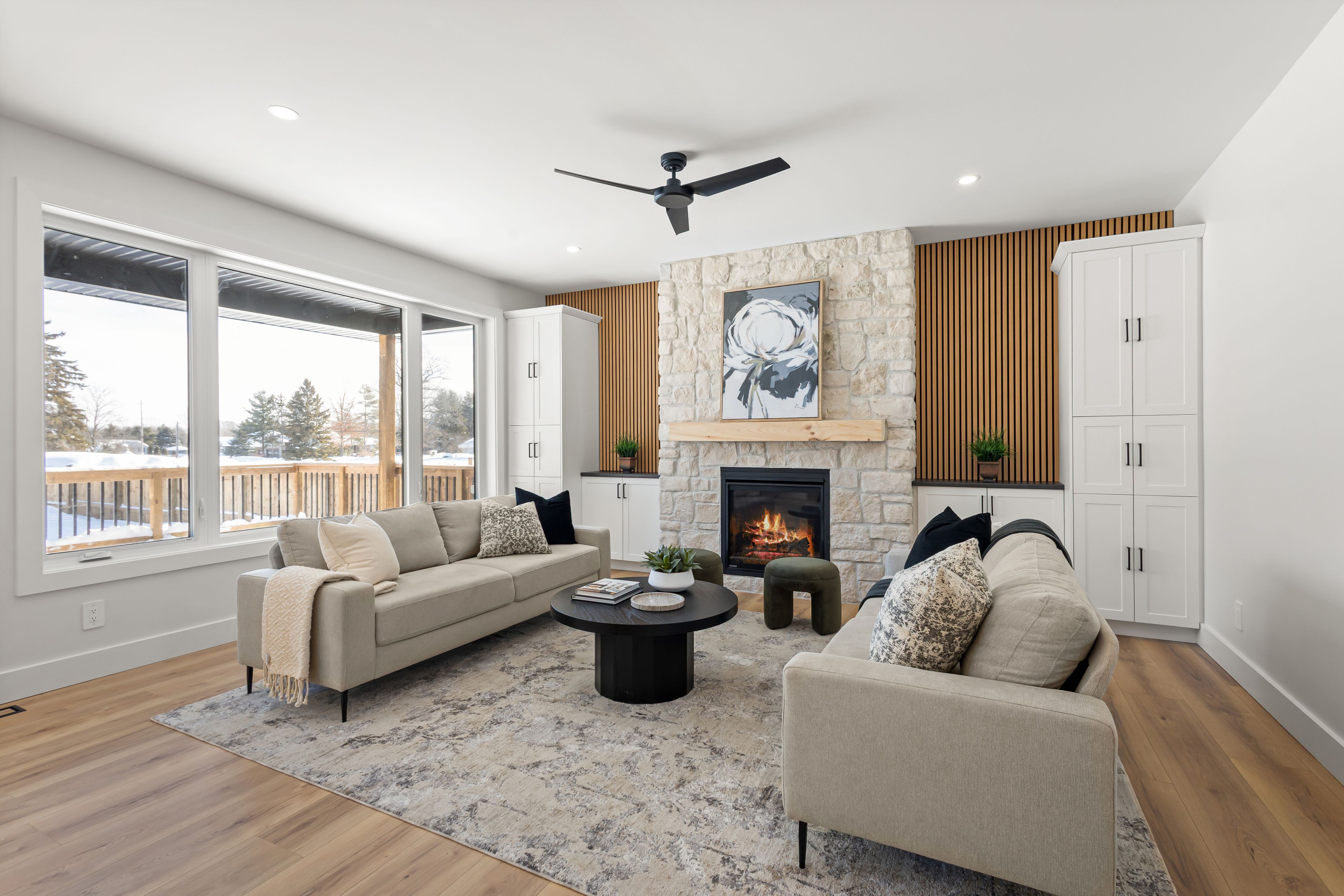 • Open-concept living area with a gas fireplace and custom cabinetry.