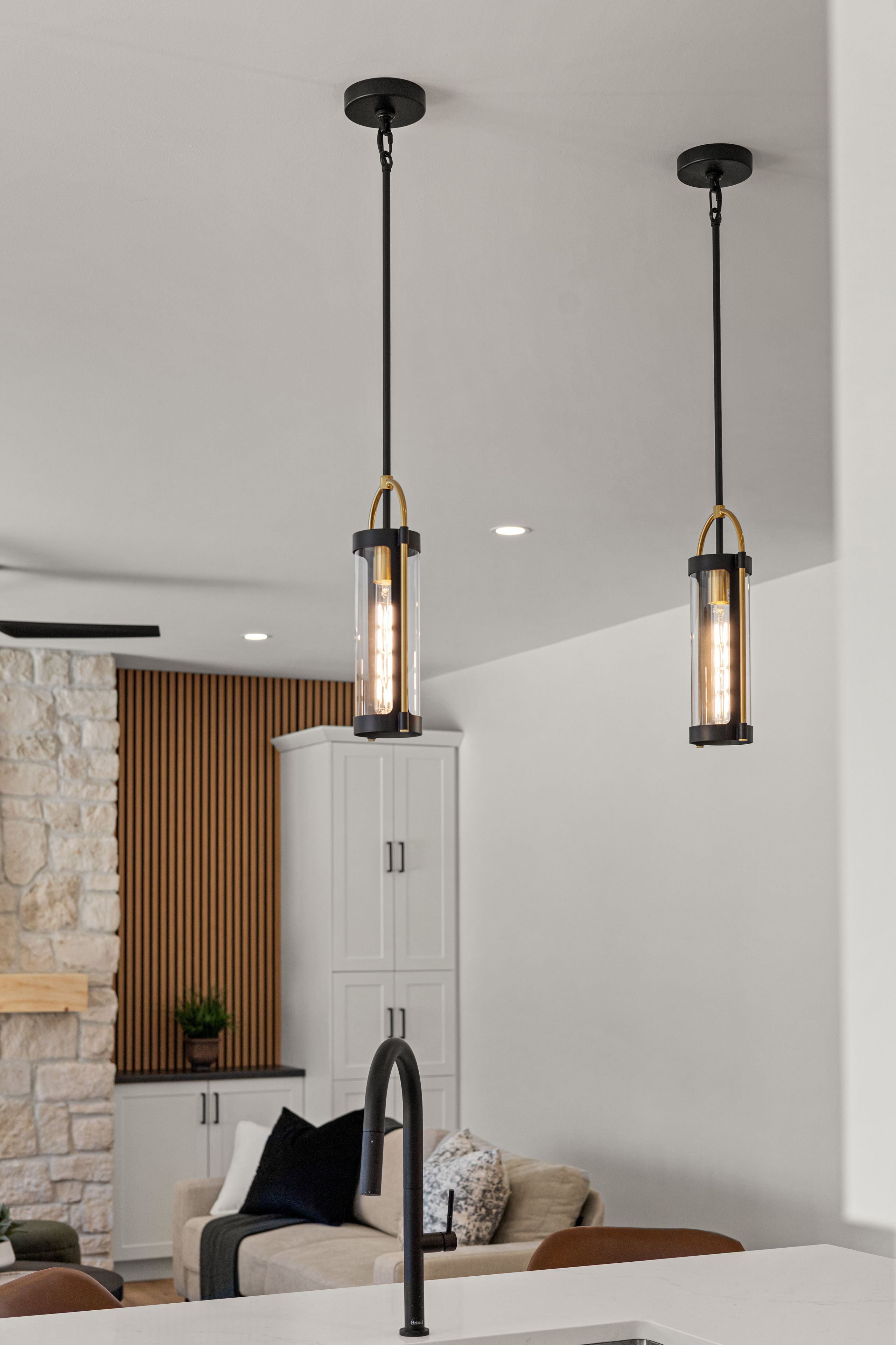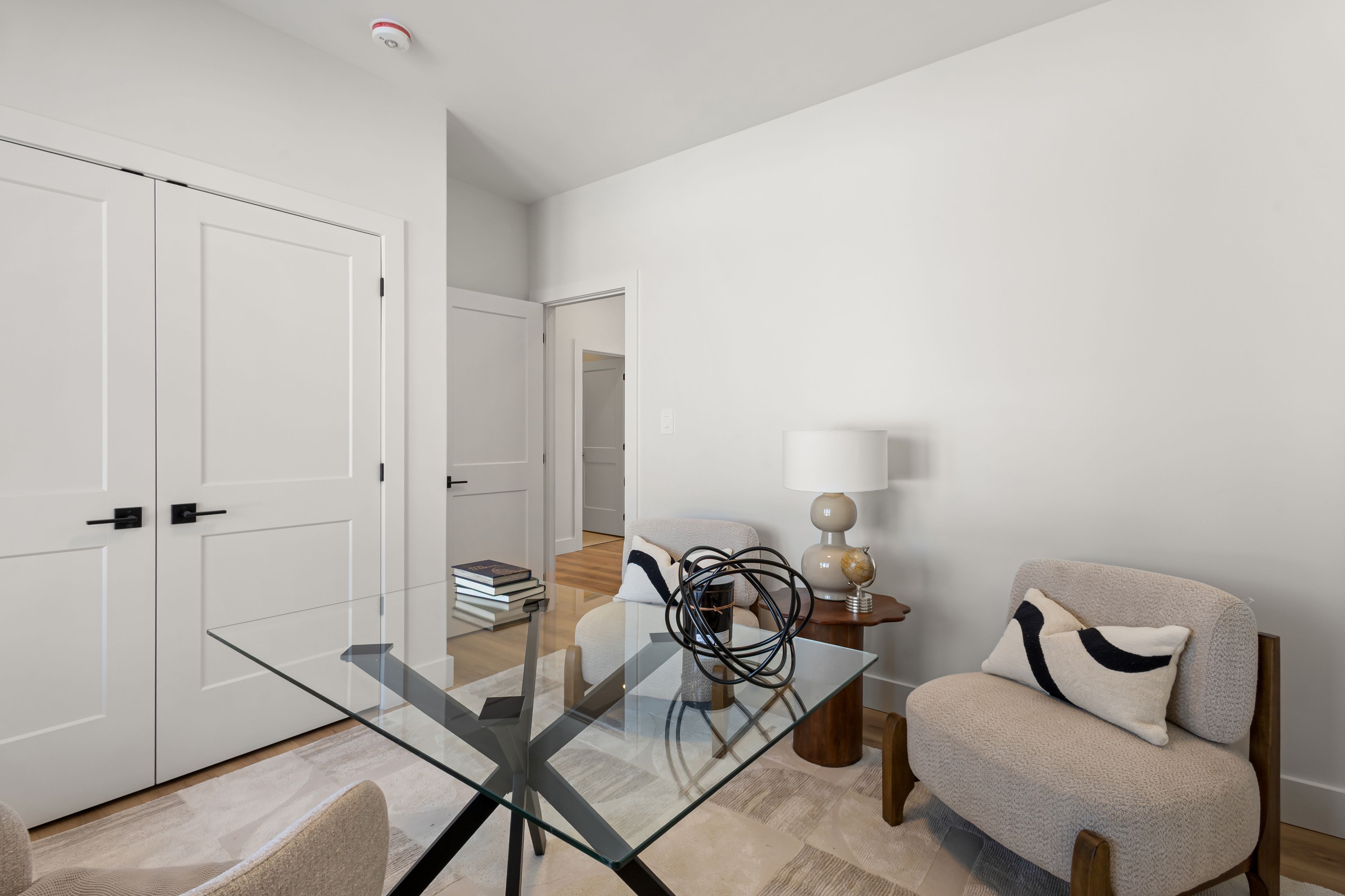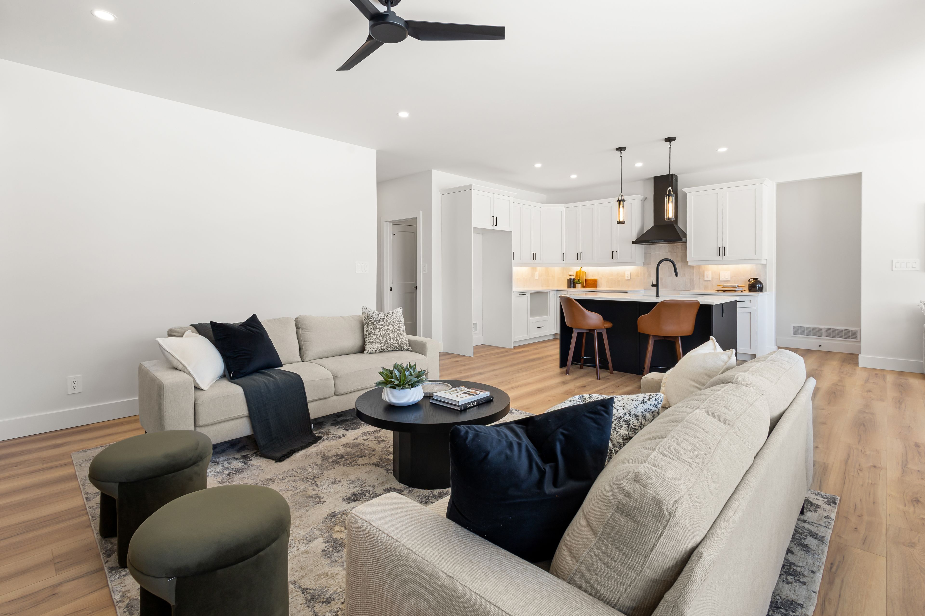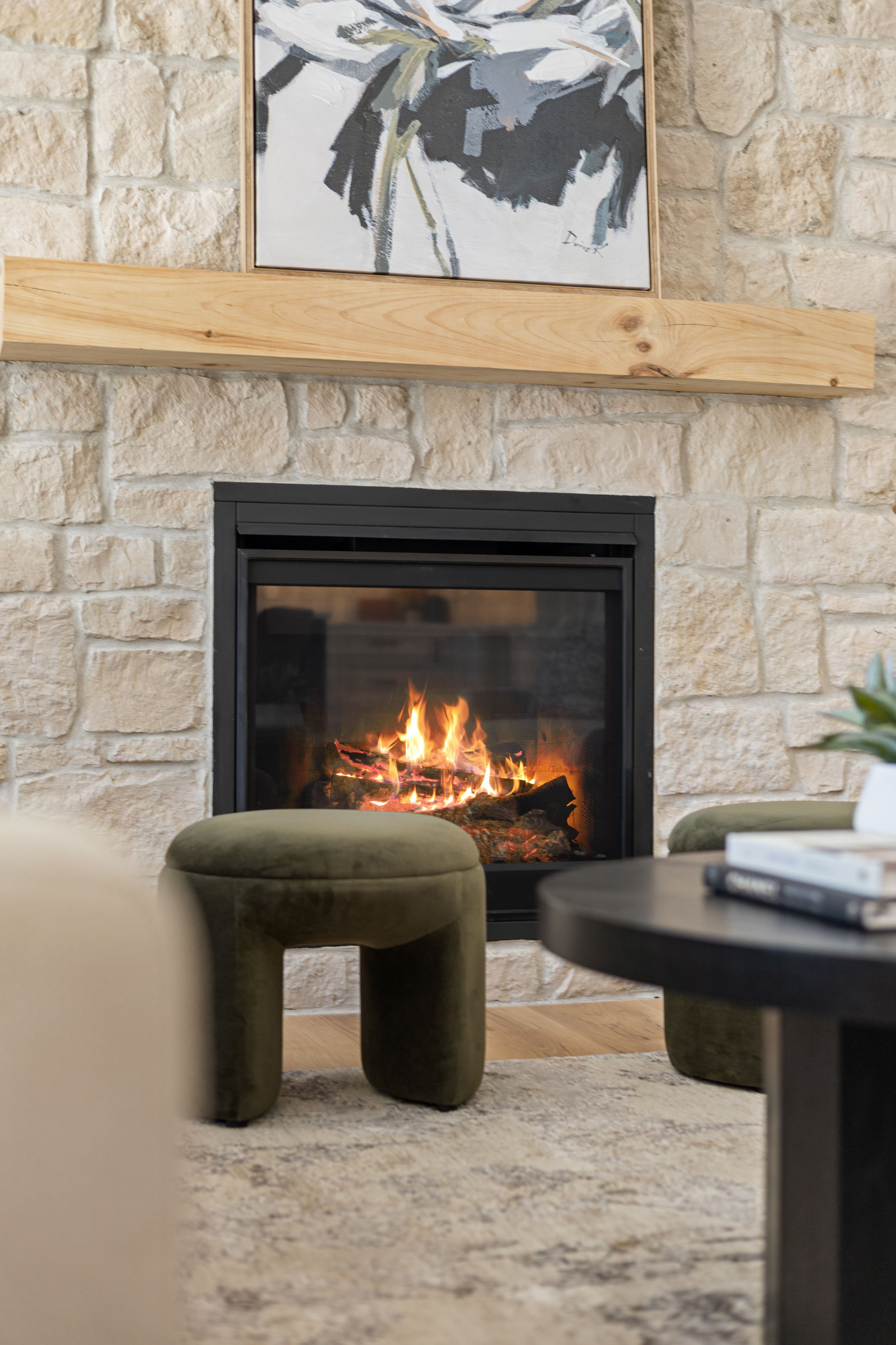 • Open-concept living area with a gas fireplace and custom cabinetry.
