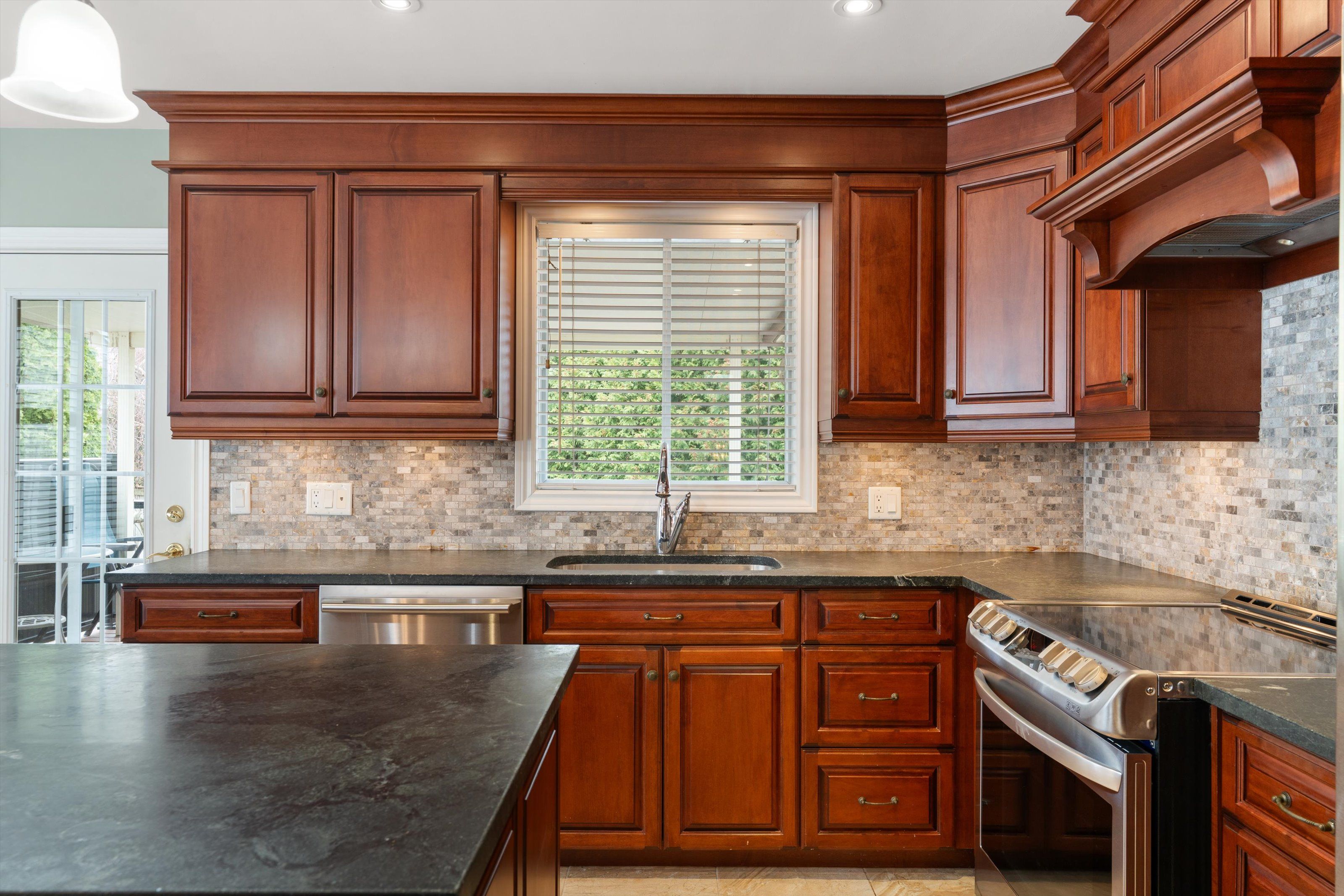 • Bright, open kitchen with stone countertops and large island for entertaining.