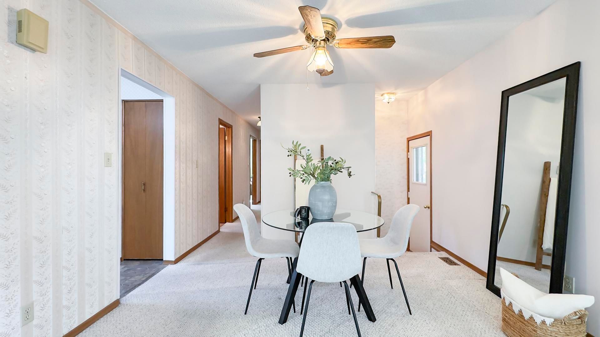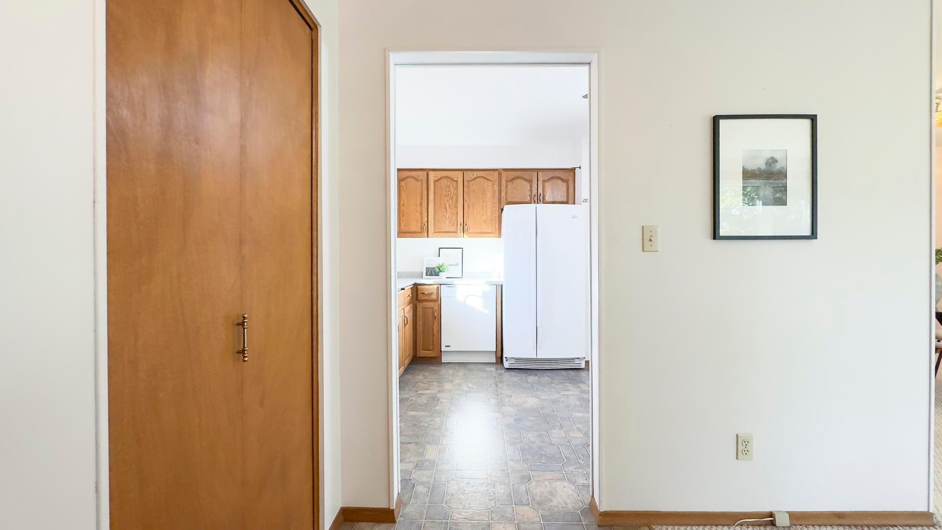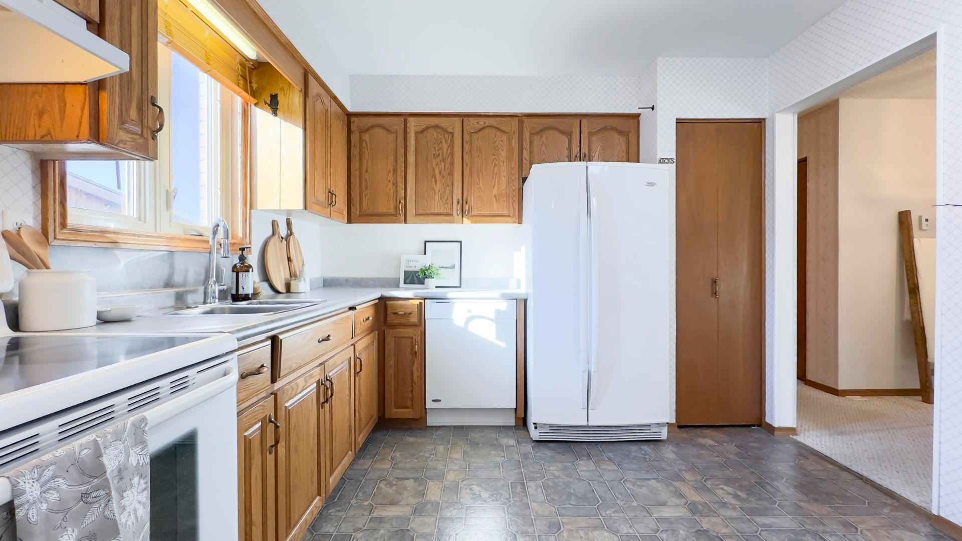• Bright living and dining area with functional kitchen and oak cabinetry.