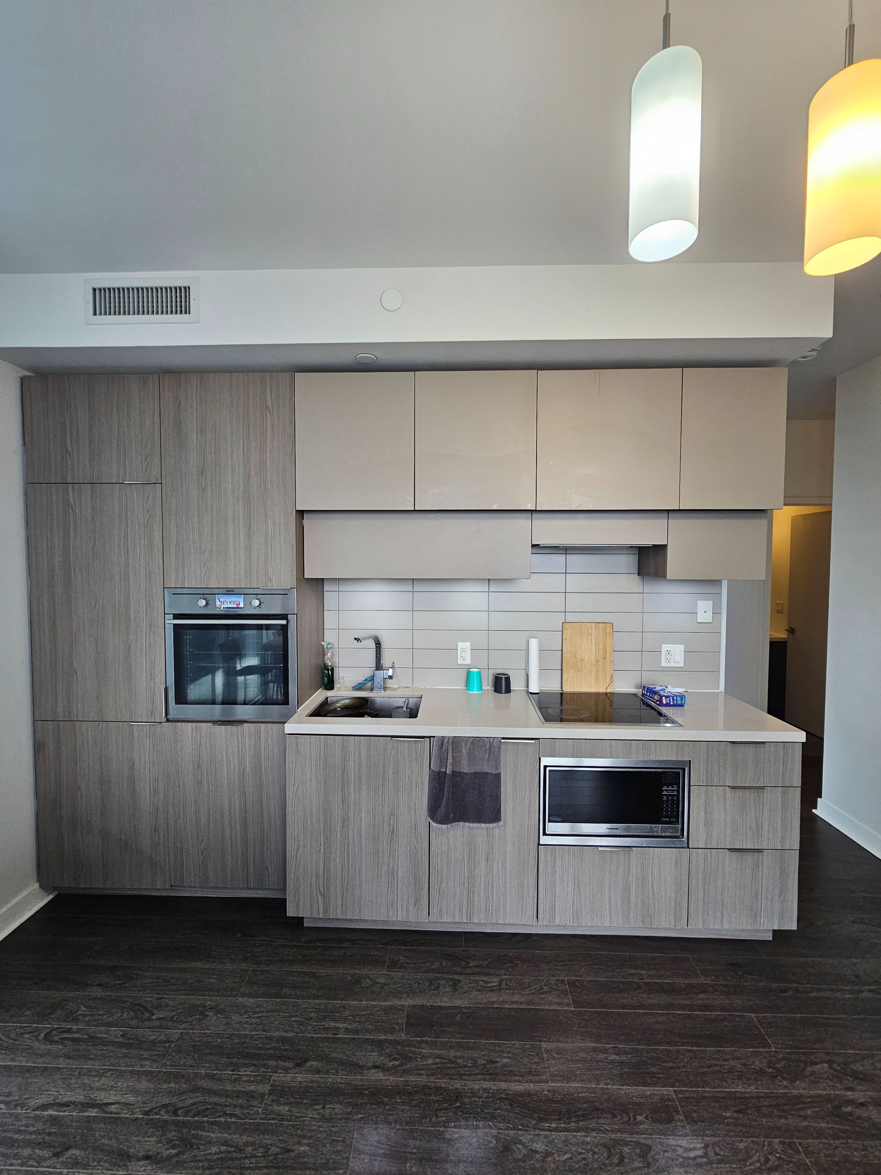 • Modern kitchen equipped with built-in appliances and laminate flooring.