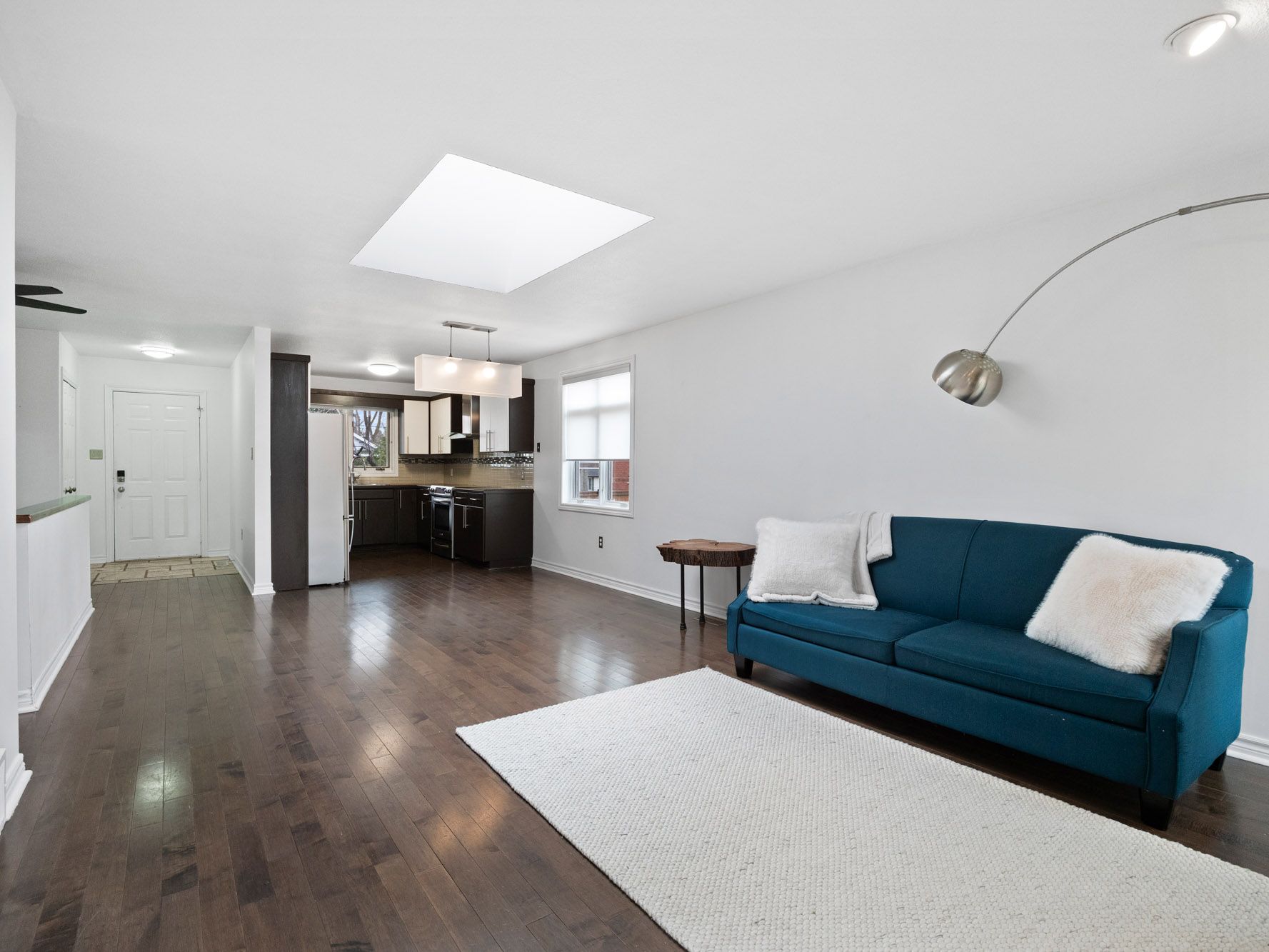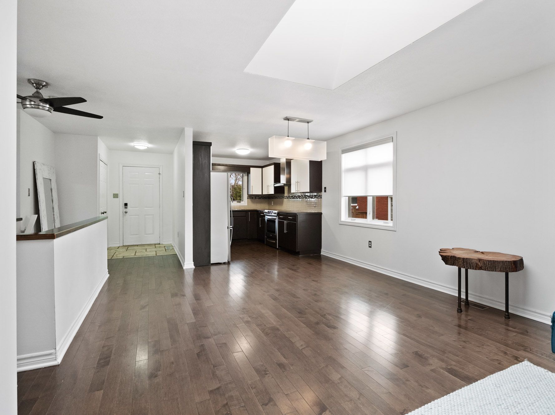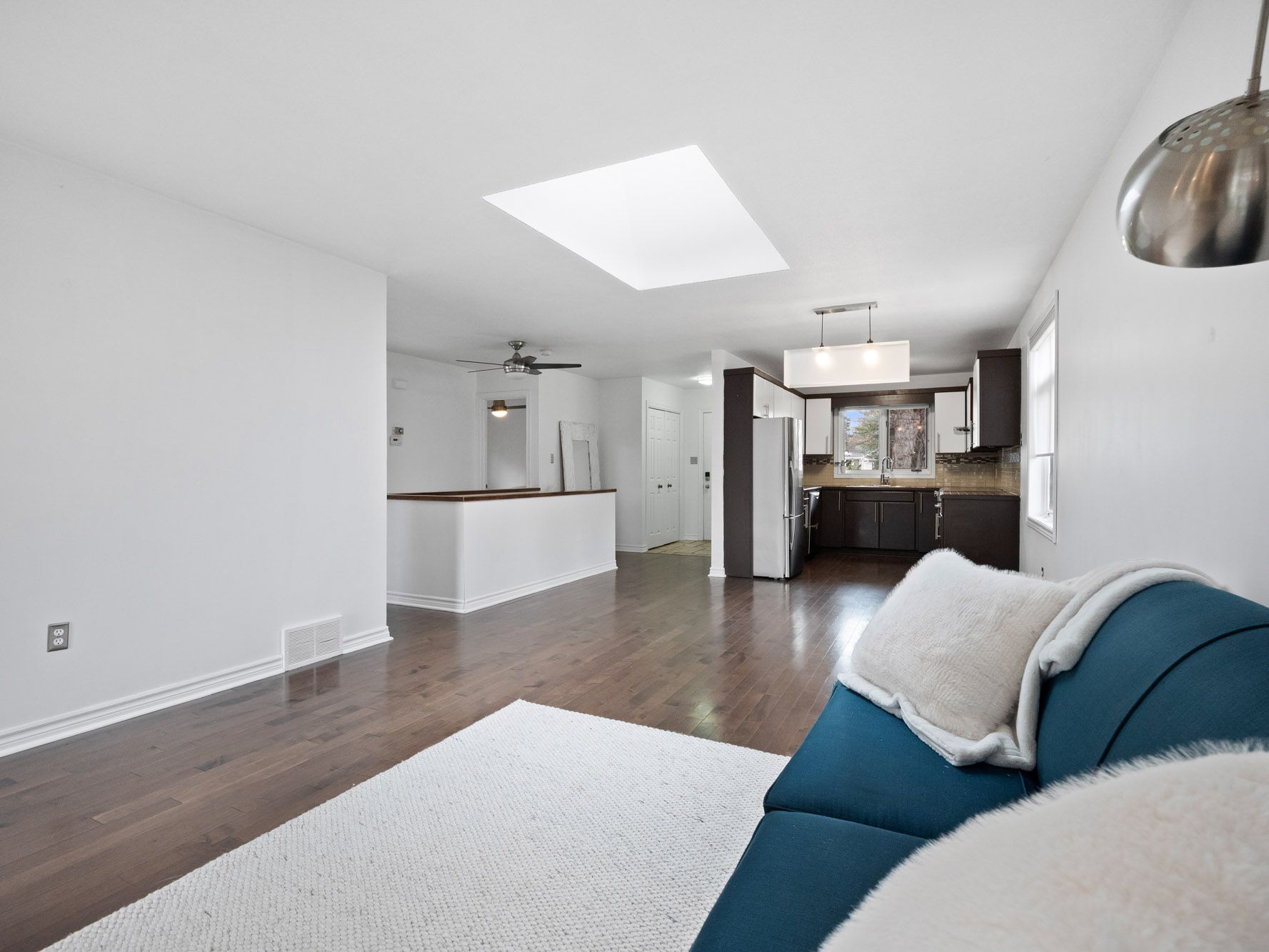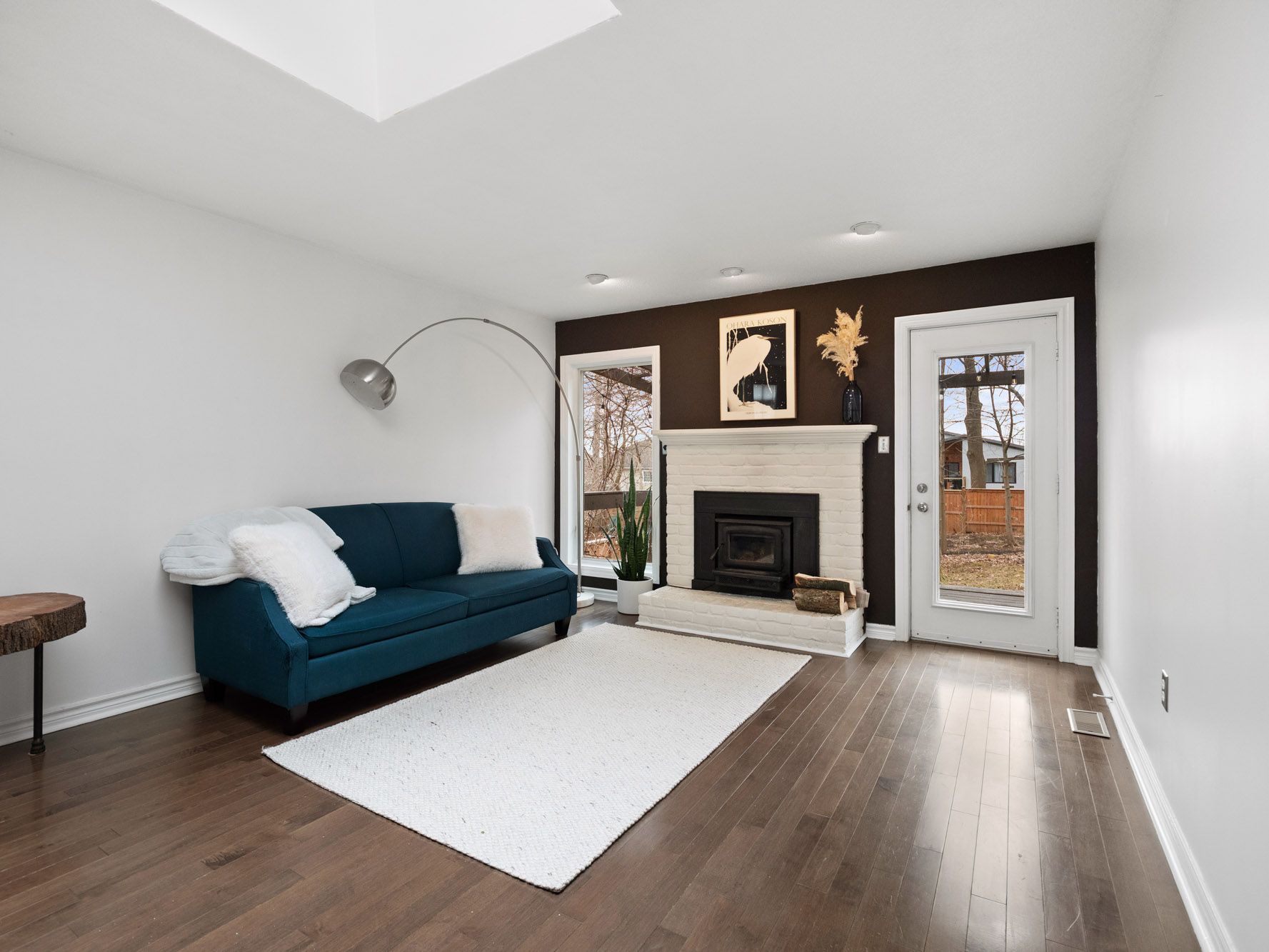 • Open floor plan with two fireplaces and a skylight for bright living.