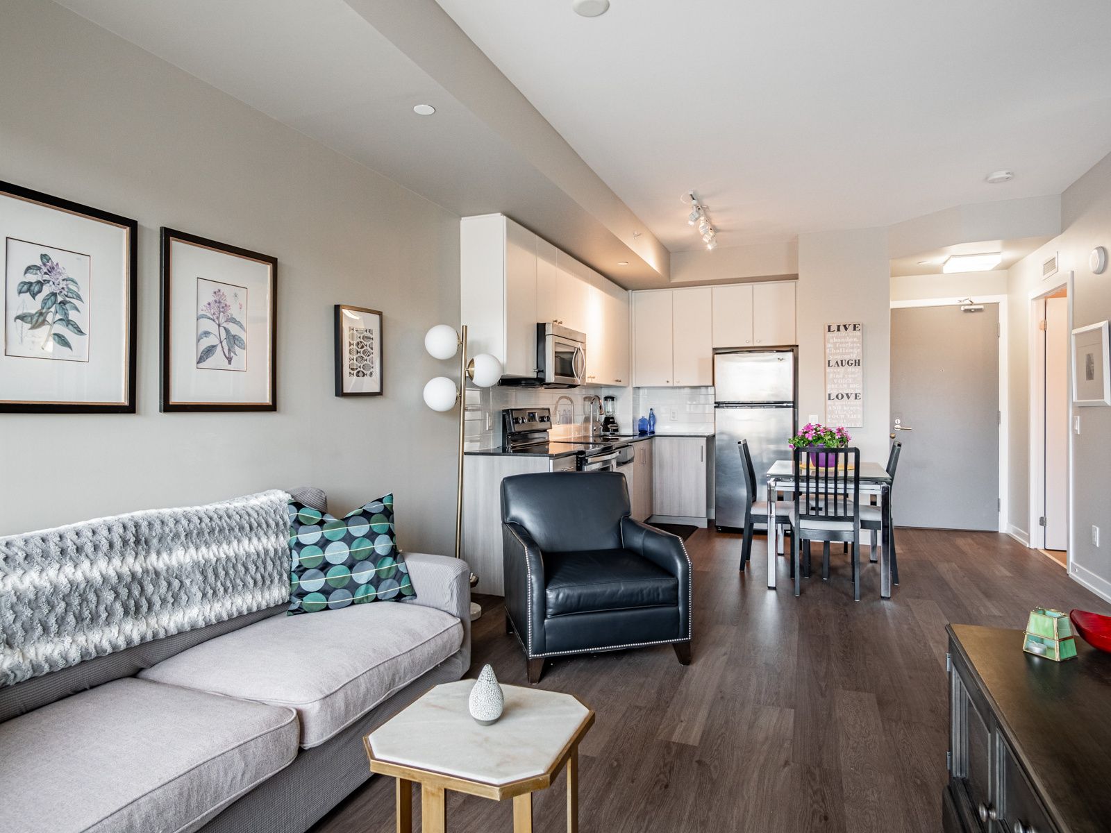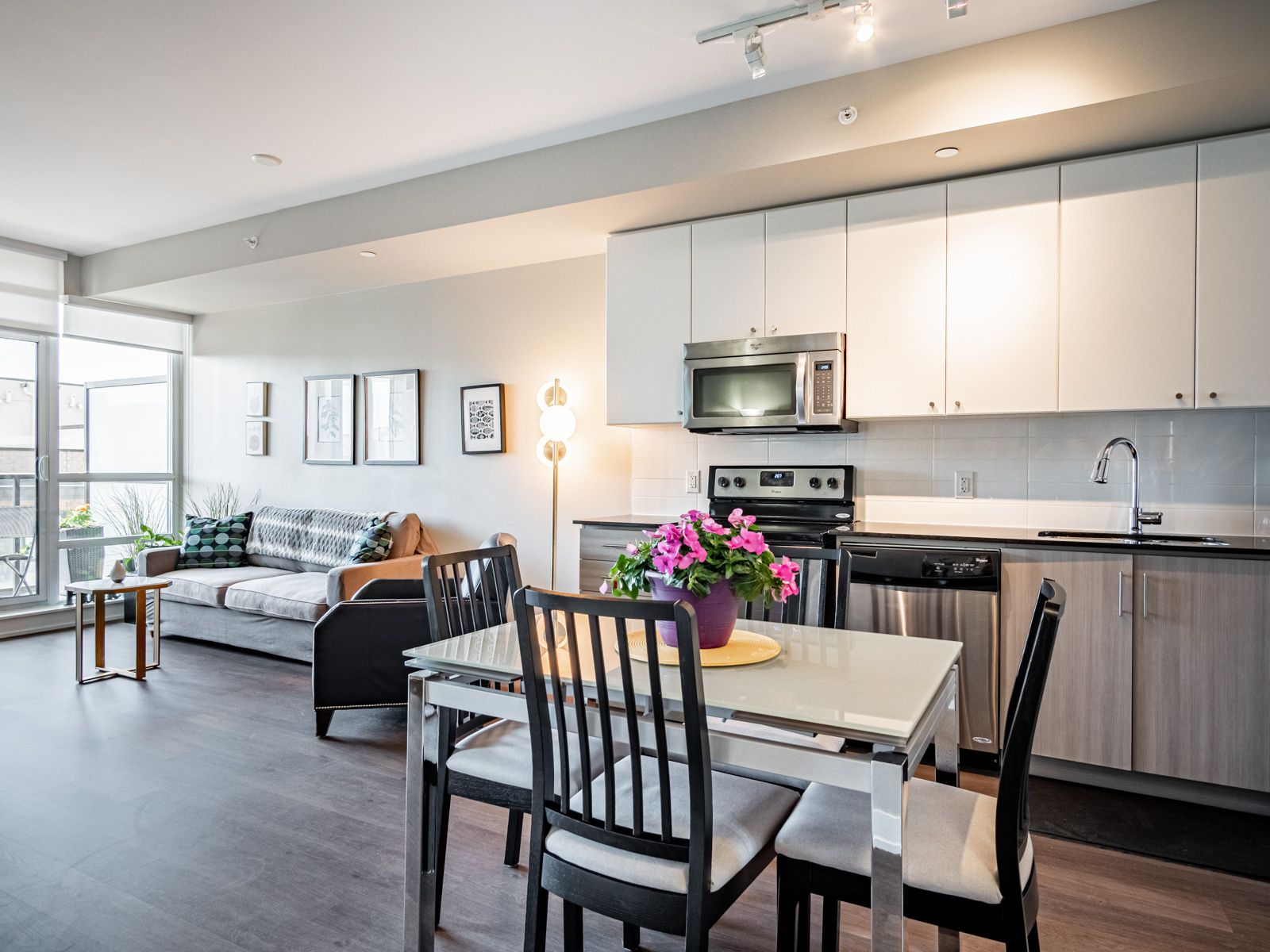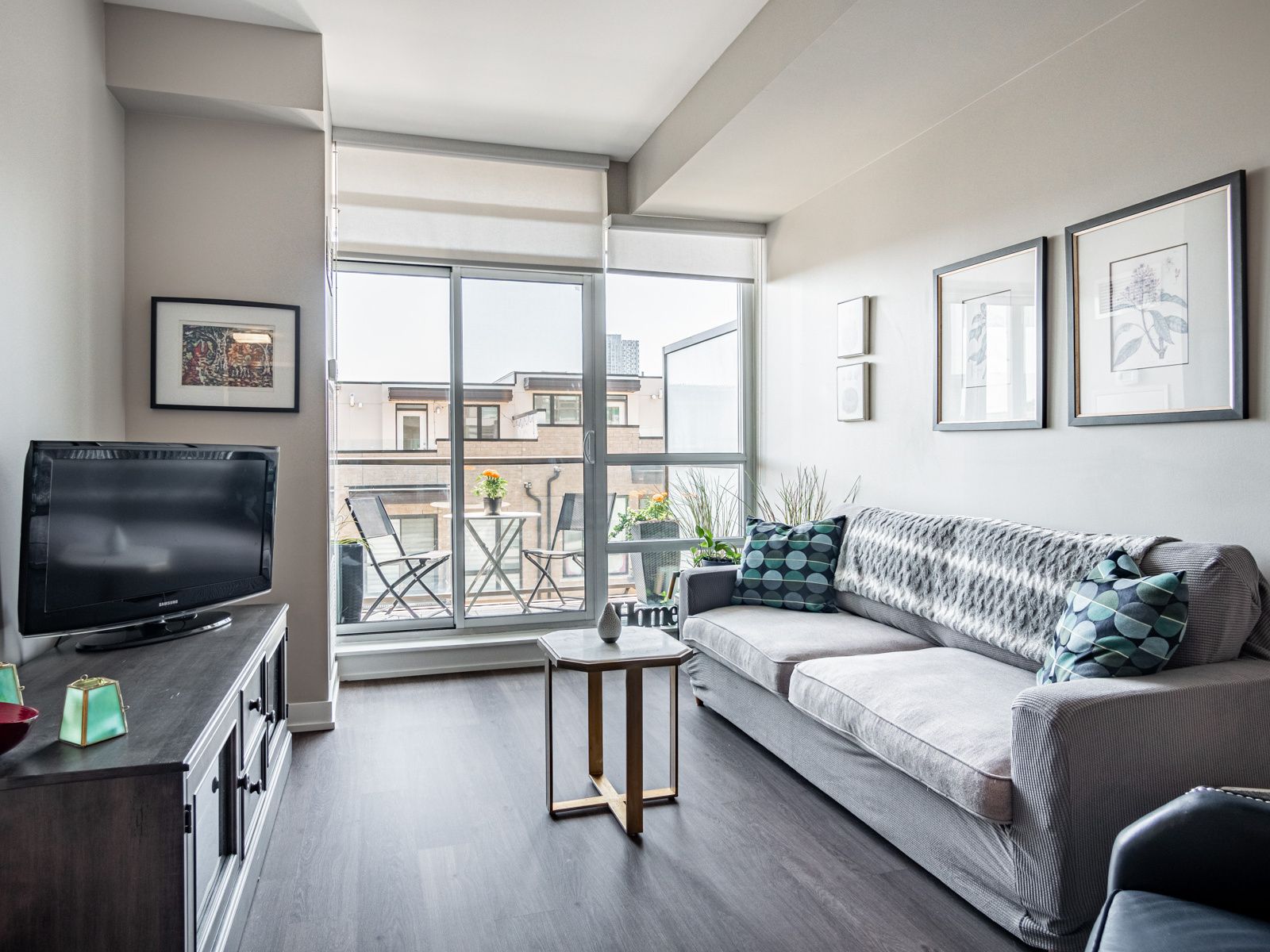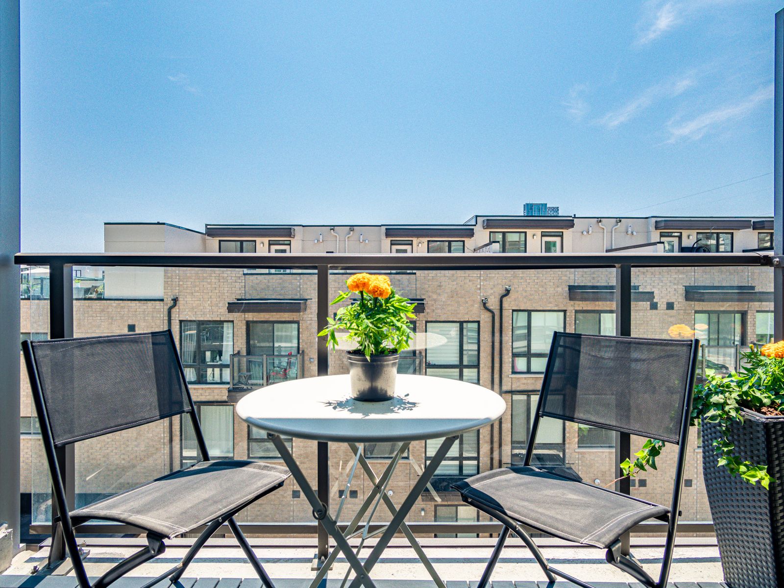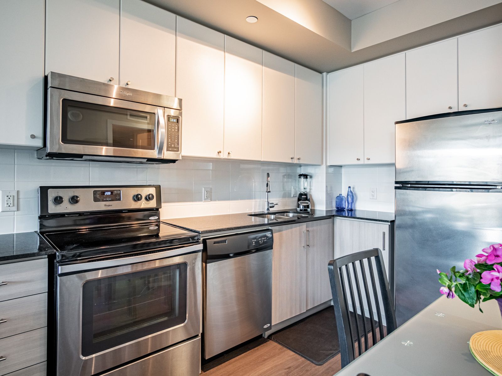Welcome to westwood condos. Sun filled 1bed+ den ideal for home office. Smooth 9ft. Ceiling. Flr to ceiling windows. West exposure 589 sq. Ft. + 50 sq. Ft. Balcony. Laminate flooring throughout, chef's kitchen w/ granite countertop, bright living rm w/ w/o to balcony. Amenities on same flr as the apartment include: outdoor patio w/ gardens; bbqs, outdoor lounging & dining patio furniture w/fire pit; gym & party rm.
