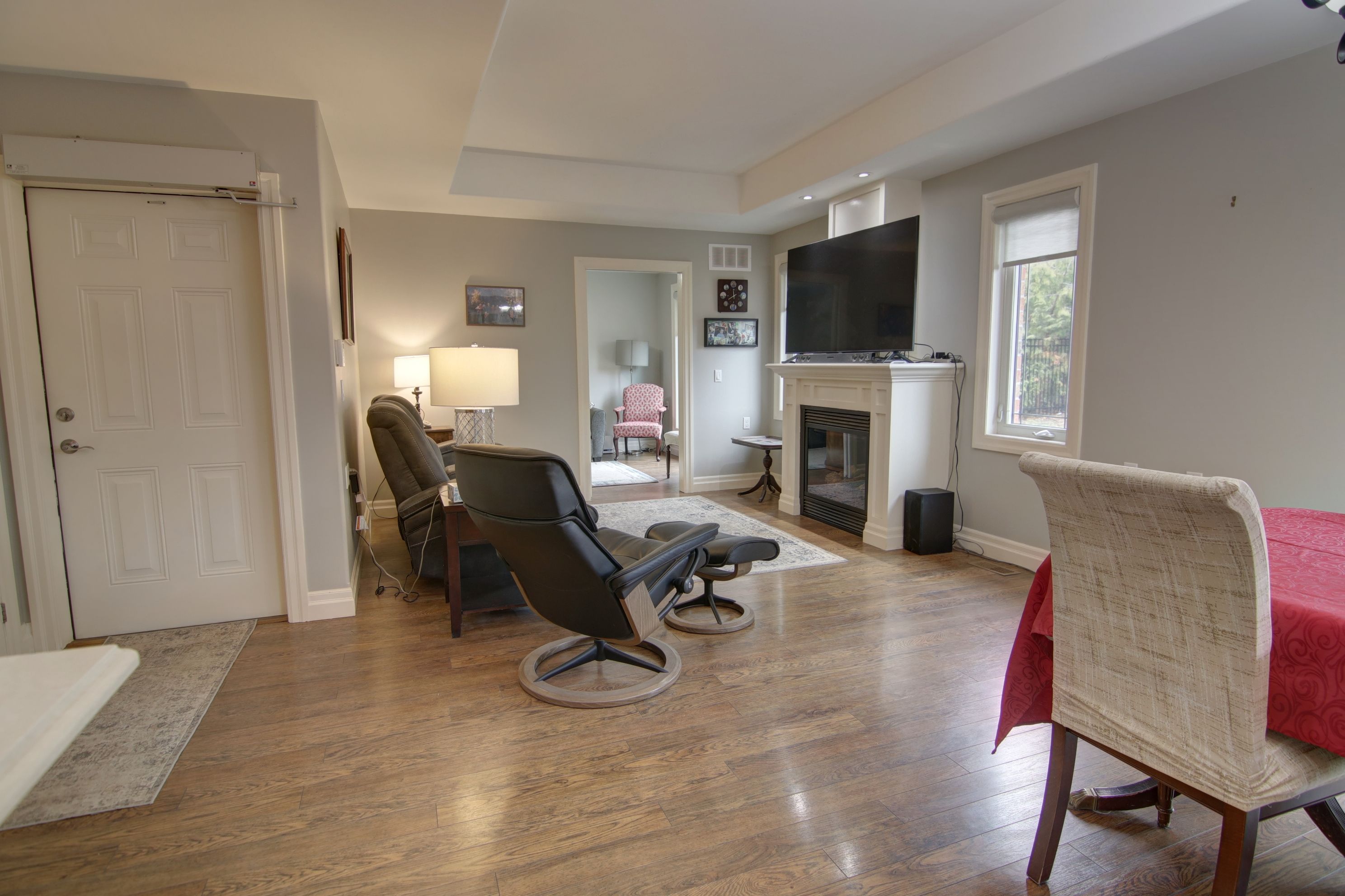 • Spacious layout with a bright living area and cozy gas fireplace.