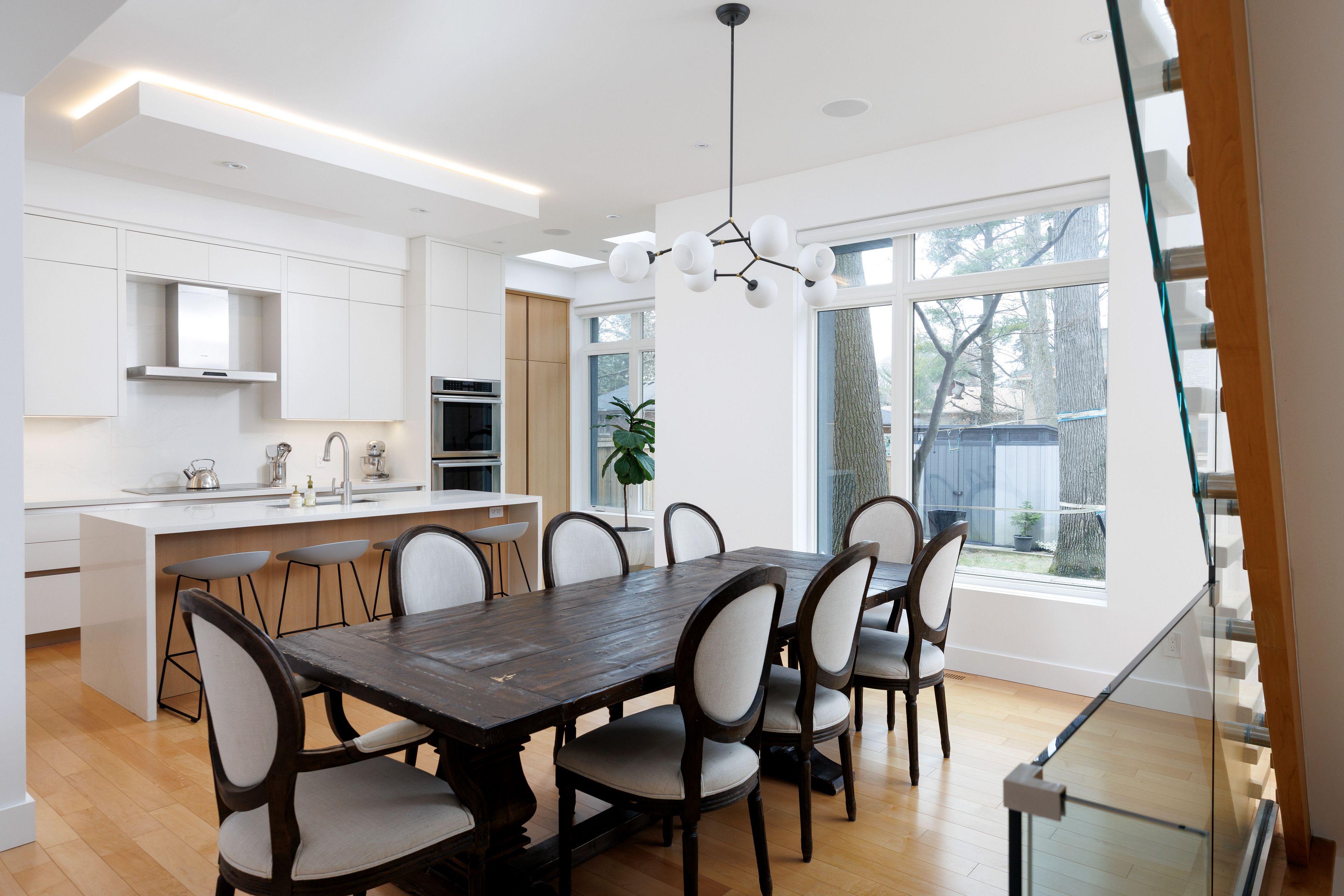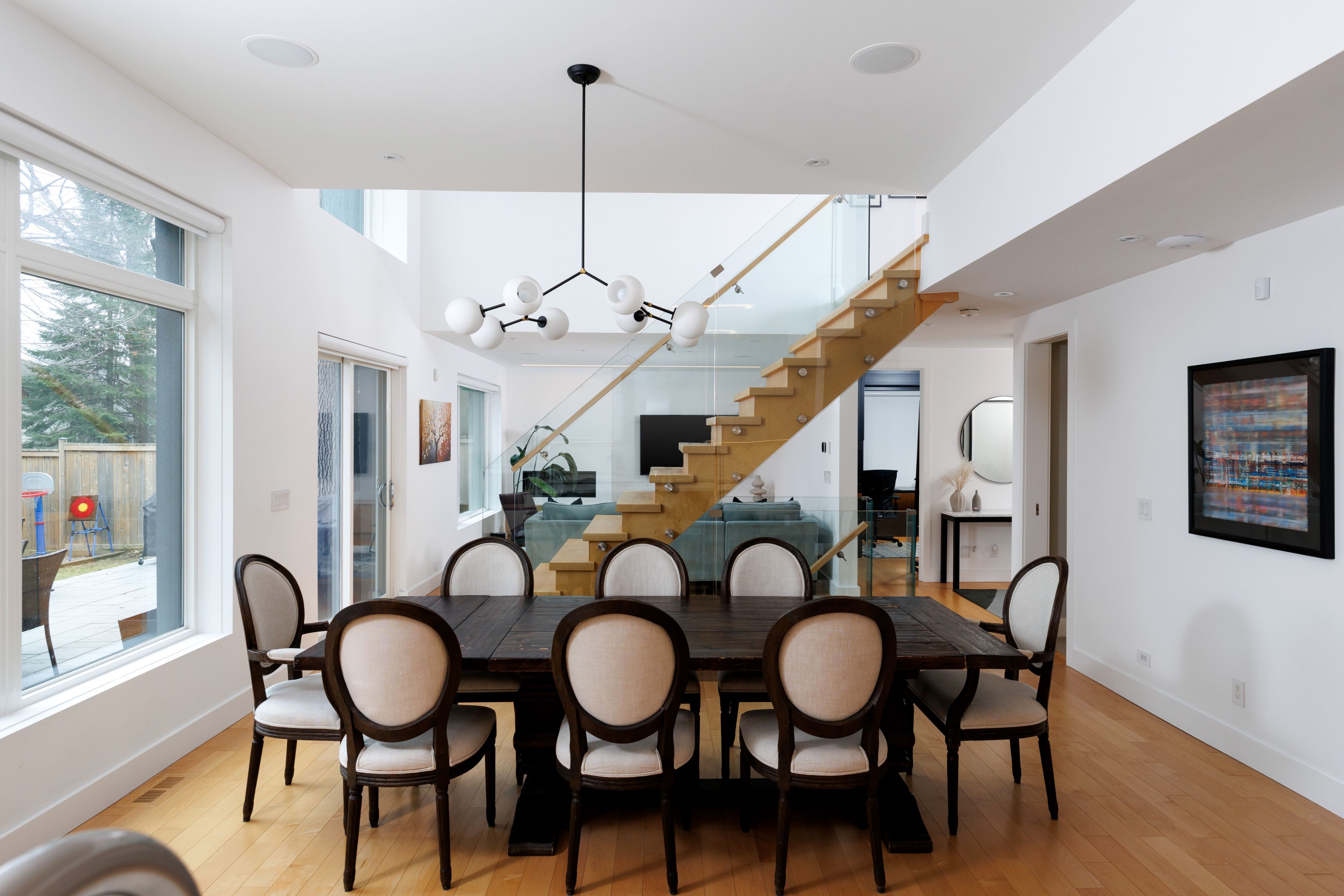 Welcome to 8 greenford road, a modern and luxurious custom build nestled on a small, quiet street just south of st georges golf club in the exclusive enclave of edenbridge-humber valley. Every detail in this beautiful home was thought over meticulously and the results are clear. The main floor features a very welcoming foyer that gives you a peak at the beautiful maple hardwood floors that flow throughout. Here you'll also find your office with a sleek built-in desk and floor to ceiling windows giving you a peak at nature while you work. The living room with gas fireplace, built-in storage and cove lighting sets the mood perfectly whether lounging or enjoying tv time with family. The open kitchen with modern cabinetry, thermadore appliances, and centre island overlooking the dining area is great for cooking and entertaining. The space is complimented with high ceilings, skylights and walk-outs, brightening up the space with a south-facing backyard. The glass enclosed staircase leads you upstairs where you'll find a primary bedroom with incredible walk-in closet and gorgeous 5-piece ensuite. Three additional bedrooms make up the second floor. On the lowest level you'll find a great recreation room complete with murphy bed, walk-in closet, full storage room that can be closed off if desired, and a brand new 3-piece modern bath. The home also features technological enhancements including automated blinds on the main floor, sonos music, strengthened security, lutron lighting system, and more. Summer is around the corner where one can enjoy the backyard patio with mature trees and gasline barbecue, away from the hustle and bustle of main roads and highways. Being located in prime edenbridge-humber valley you have direct access to top-rated schools, parks, restaurants, private golf courses, shopping, public transit (ttc, subway, go), and much more. Come see this beautiful home today!