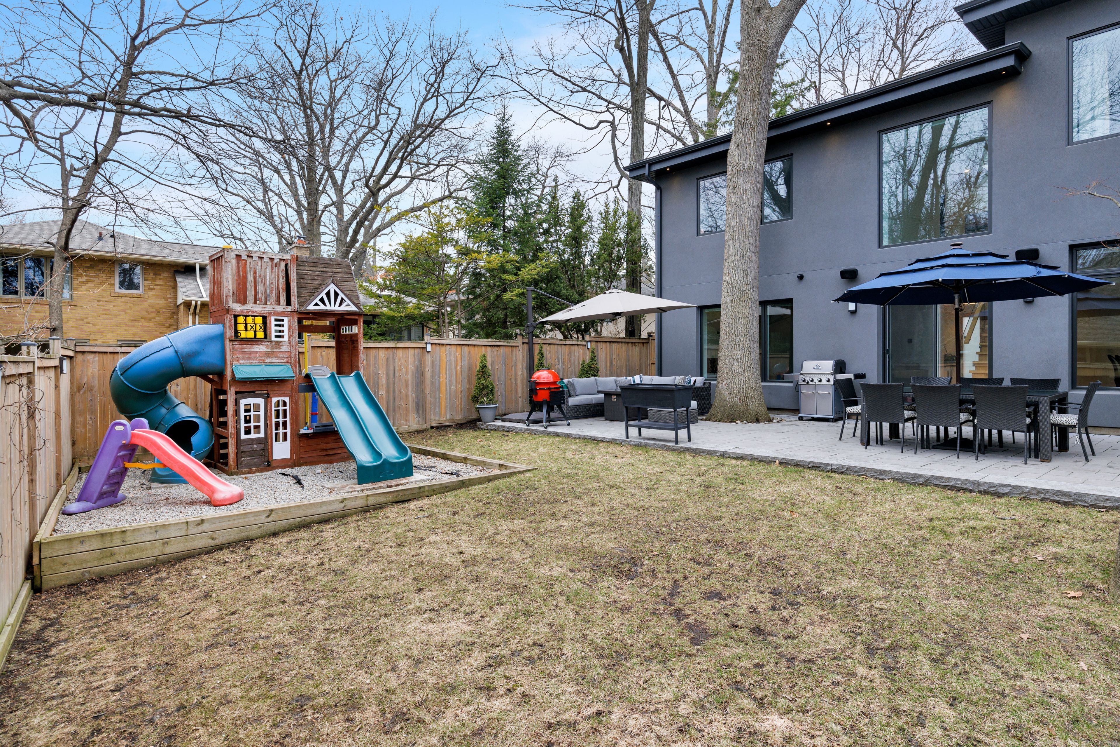 • Private backyard patio with mature trees, perfect for summer barbecues.