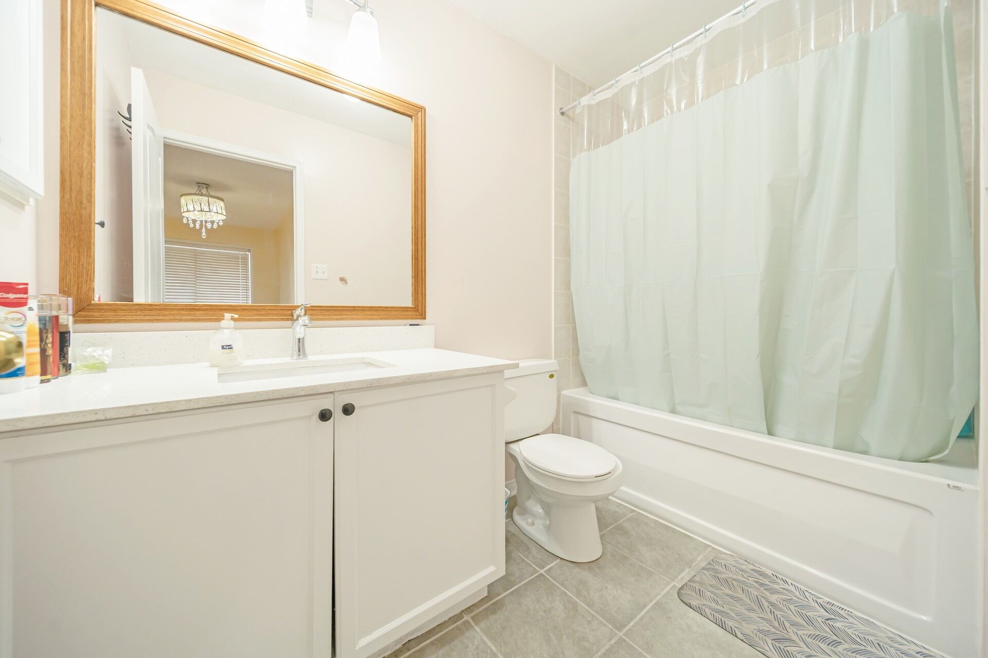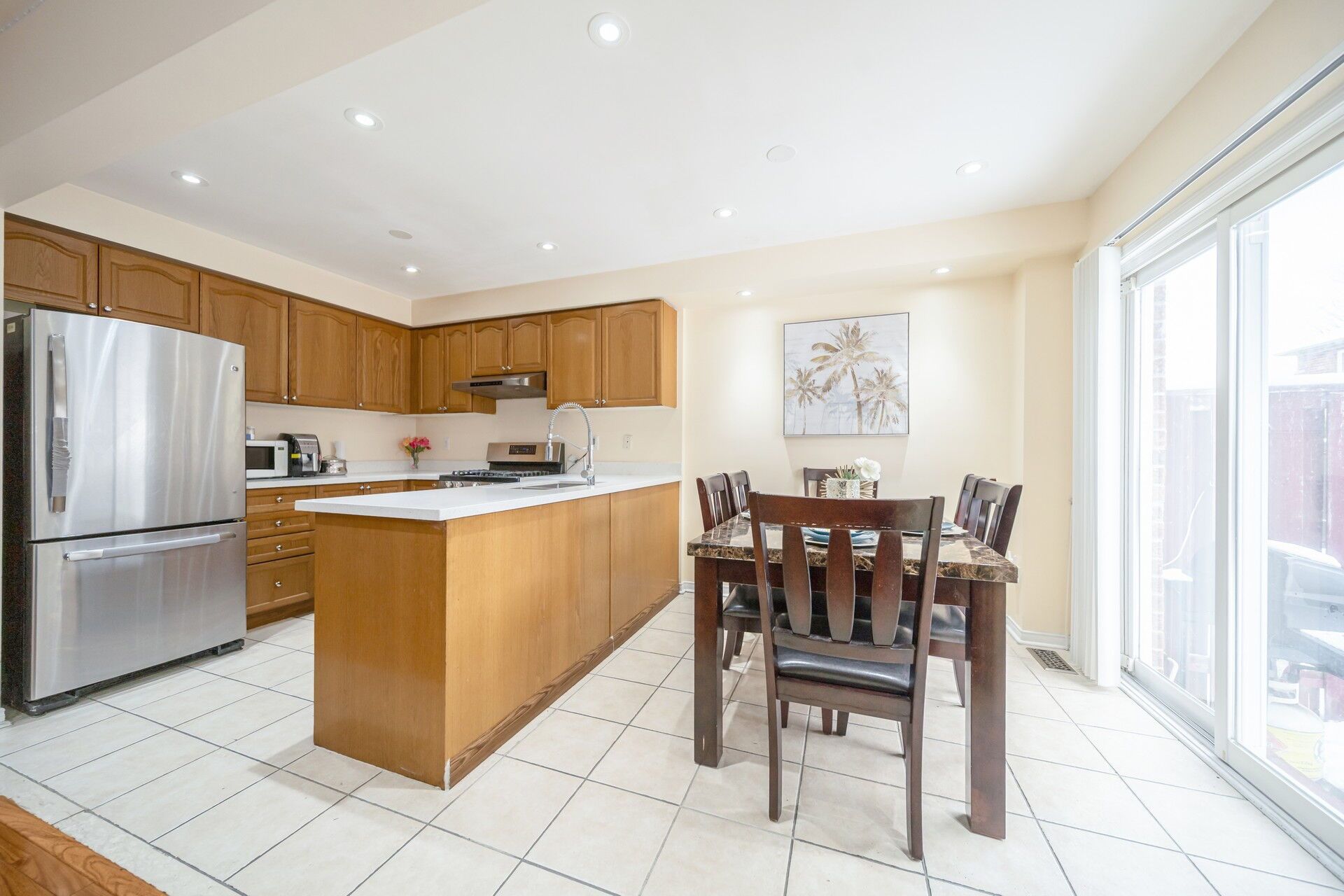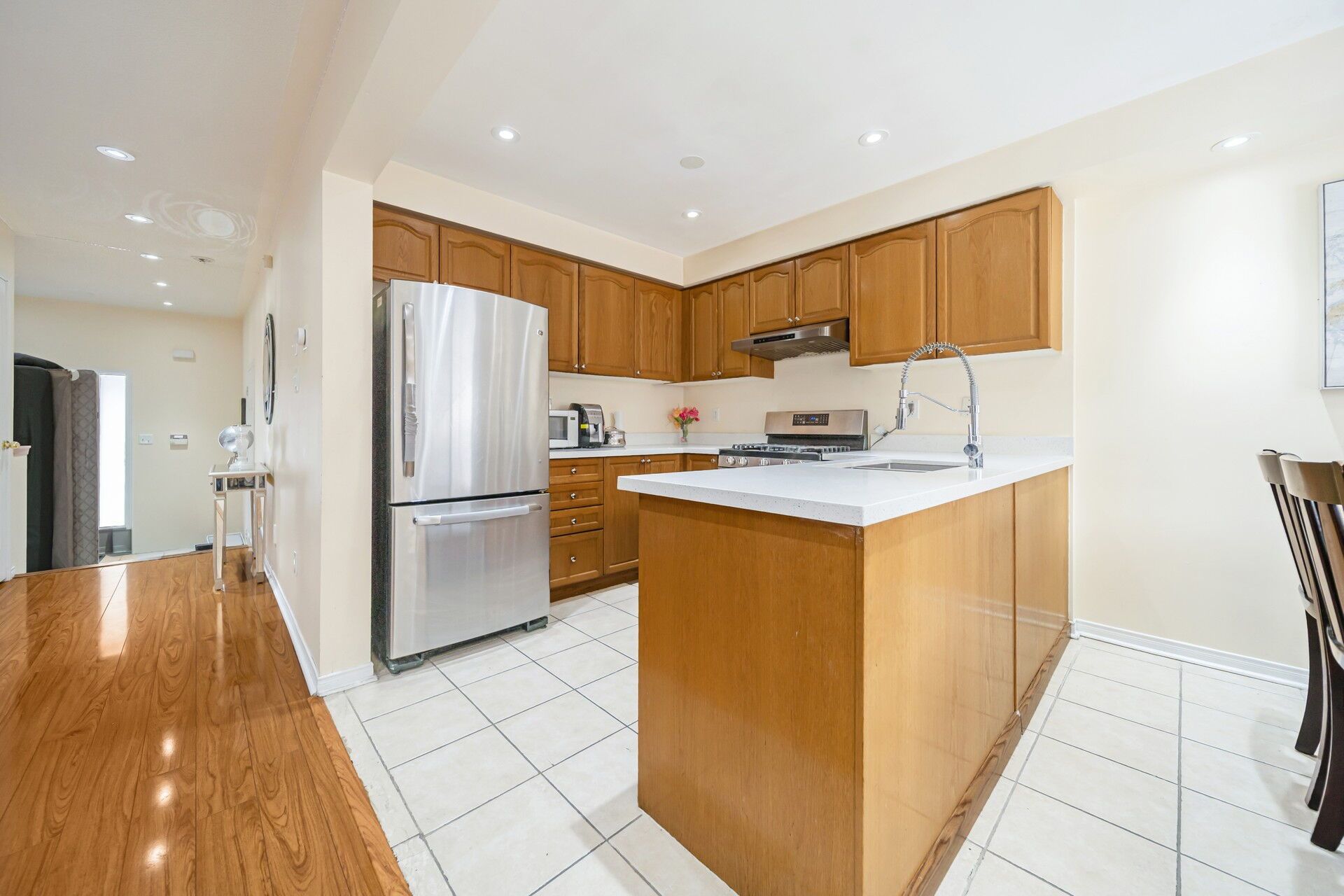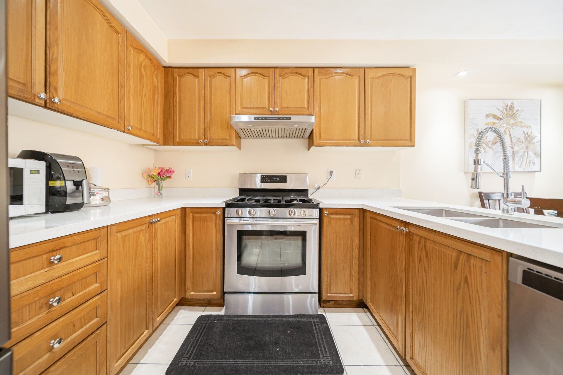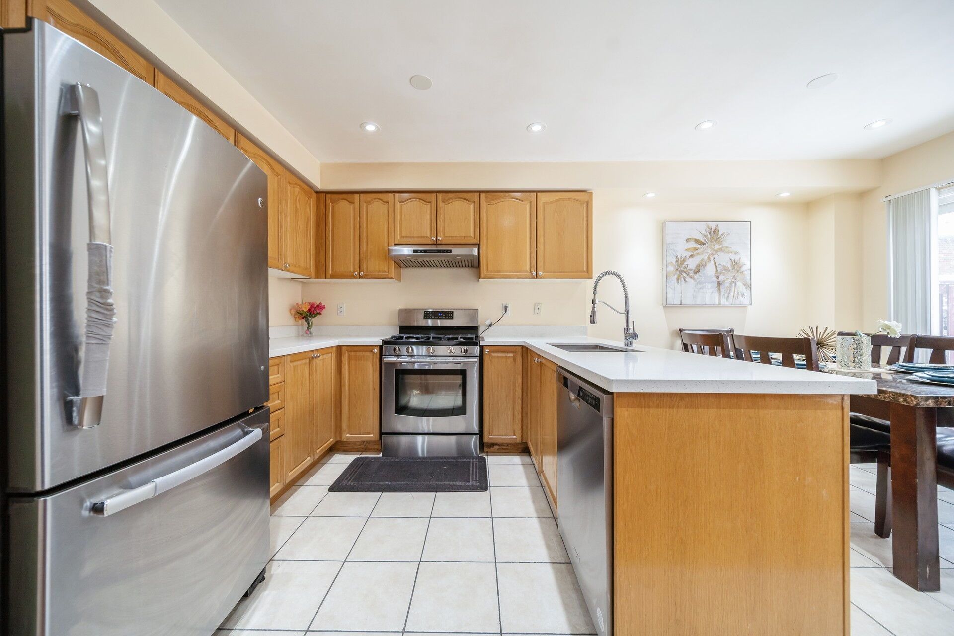 • Upgraded kitchen features quartz countertops and a dining space.