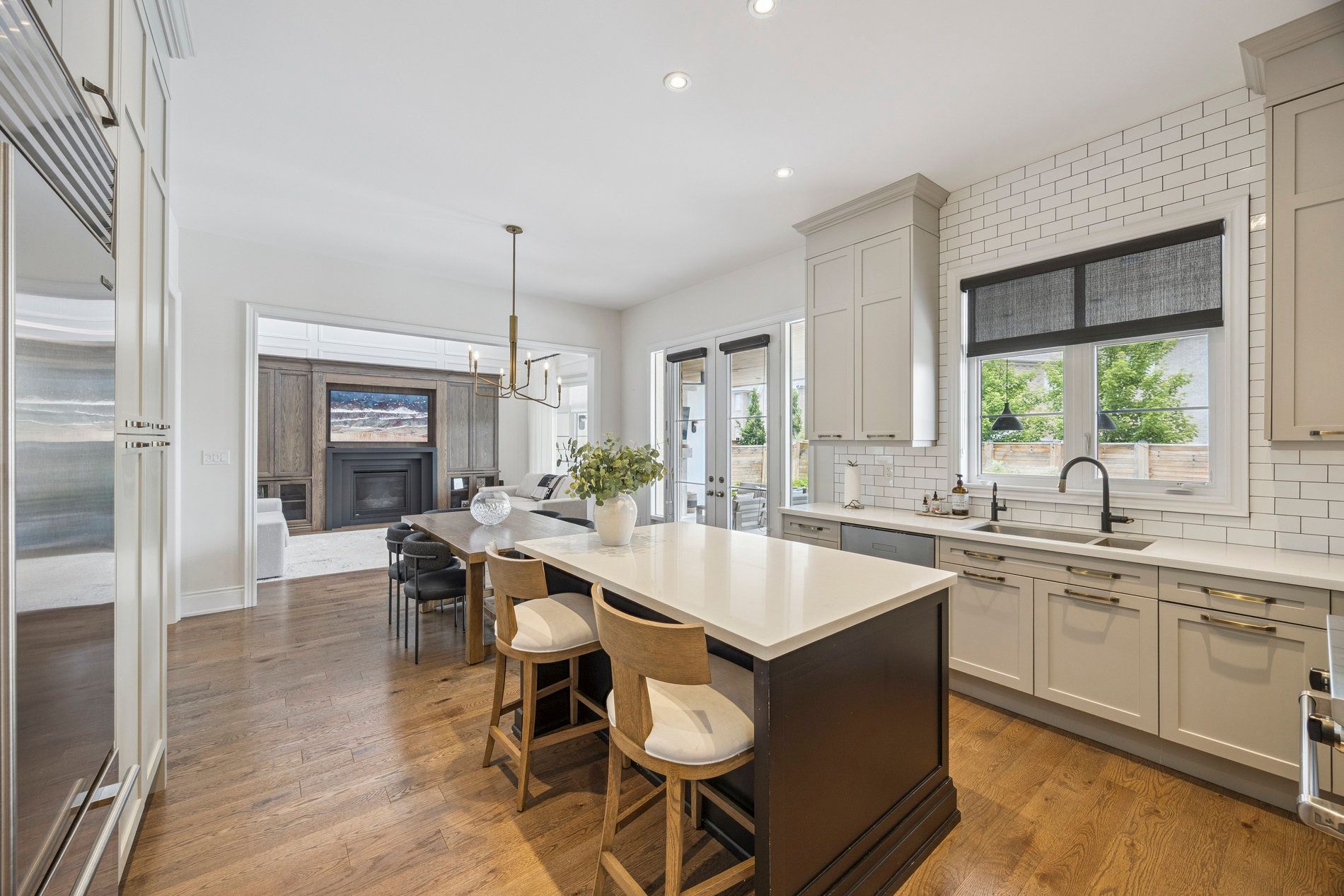 • Chef-inspired kitchen featuring stainless steel appliances and large island.
