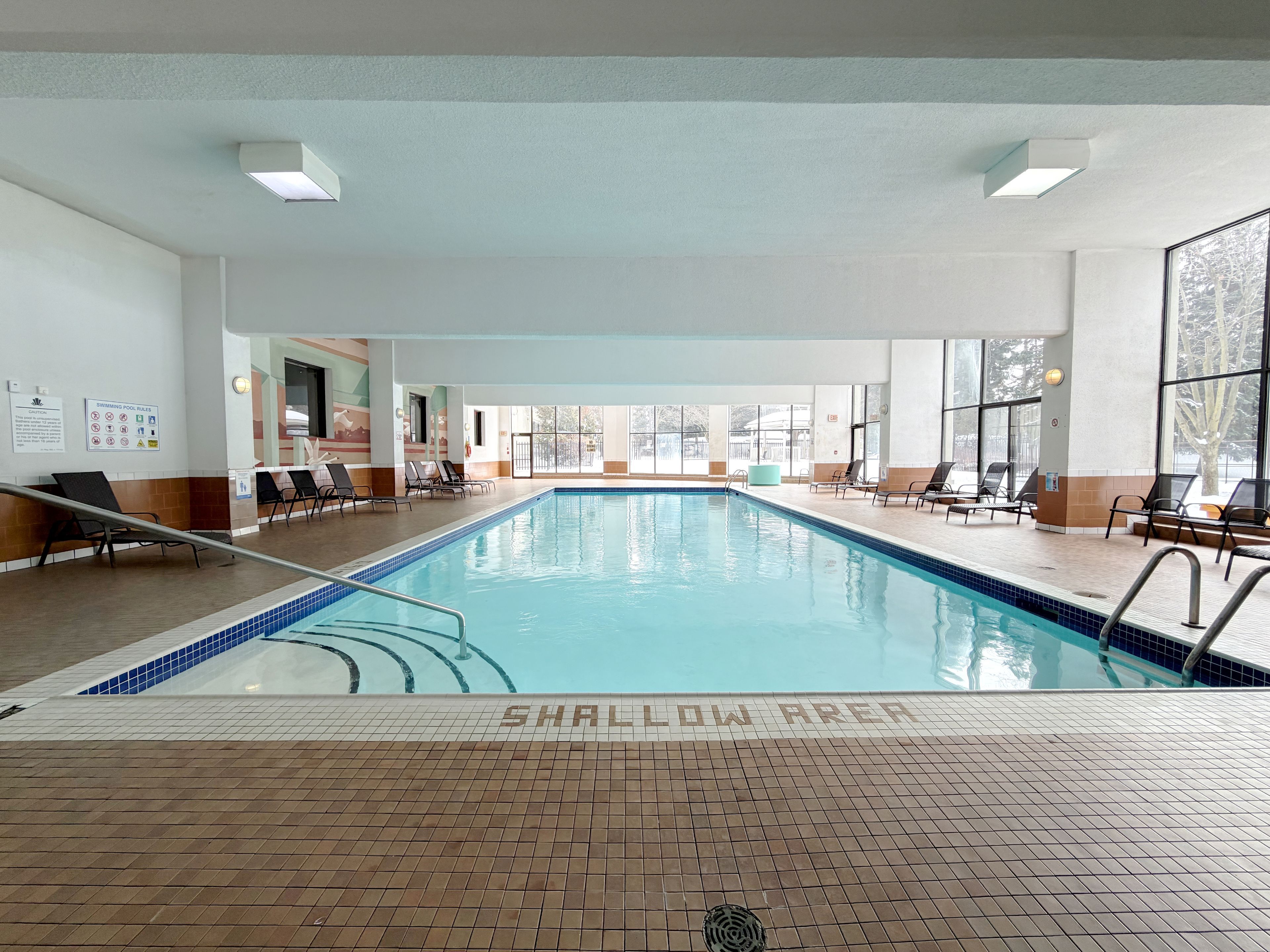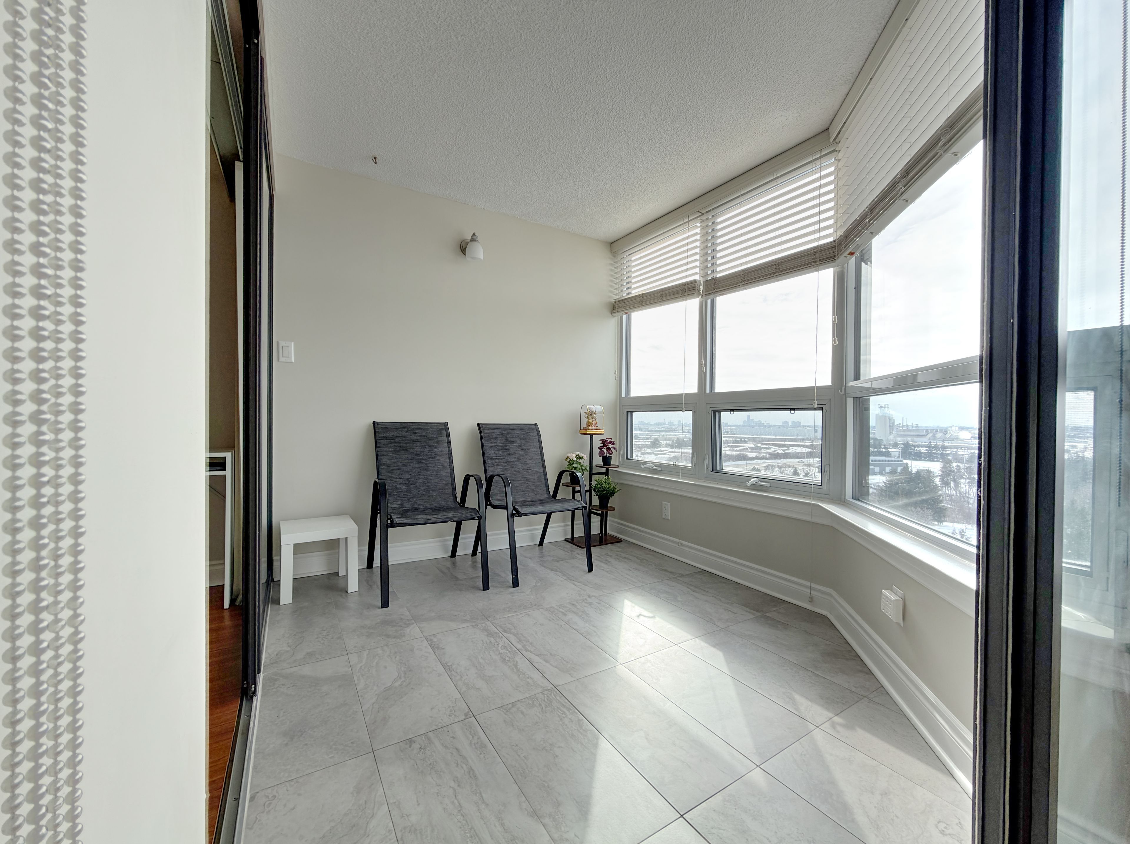Spectacularly spacious 2-bedroom + den condo in one of brampton's most desirable locations. Set amidst meticulously maintained grounds and lush gardens, this resort-style residence offers an exceptional lifestyle with indoor and outdoor pools, gym, squash & racquet court, tennis court, games room, party room, billiards room, and 24-hour gated security. Enjoy the rare privilege of backing onto conservation land with norton place lake and scenic picnic areas, truly making every day feel like a vacation. This fully renovated suite features a modern open-concept living and dining area highlighted by pot lights, accent stone wall, wall sconces, and an elegant dining chandelier. The sun-filled solarium boasts light-tone porcelain flooring and floor-to-ceiling windows, perfect for relaxing or working from home. The upgraded kitchen showcases granite countertops, ceramic backsplash, ample dark-stained cabinetry, an island with a breakfast bar, an accent stone façade, an undermount sink, chimney-style exhaust, and stainless-steel appliances. Two completely renovated bathrooms offer neutral porcelain tiles, dark-stained vanities, a luxurious soaker tub, and a walk-in shower. Finished with upgraded dark-tone laminate flooring throughout and two underground garage parking spaces, this home delivers comfort, elegance, and unmatched surroundings