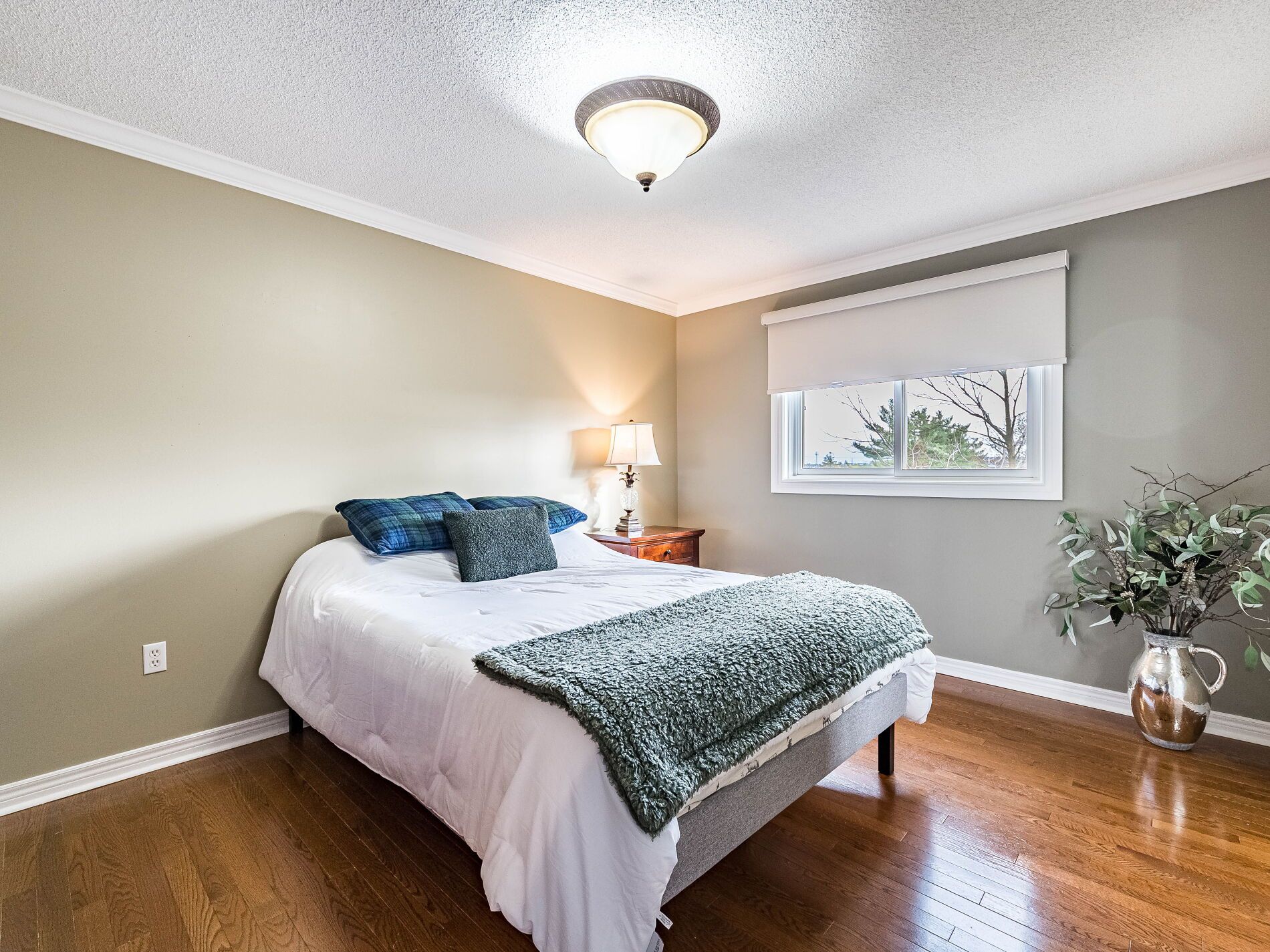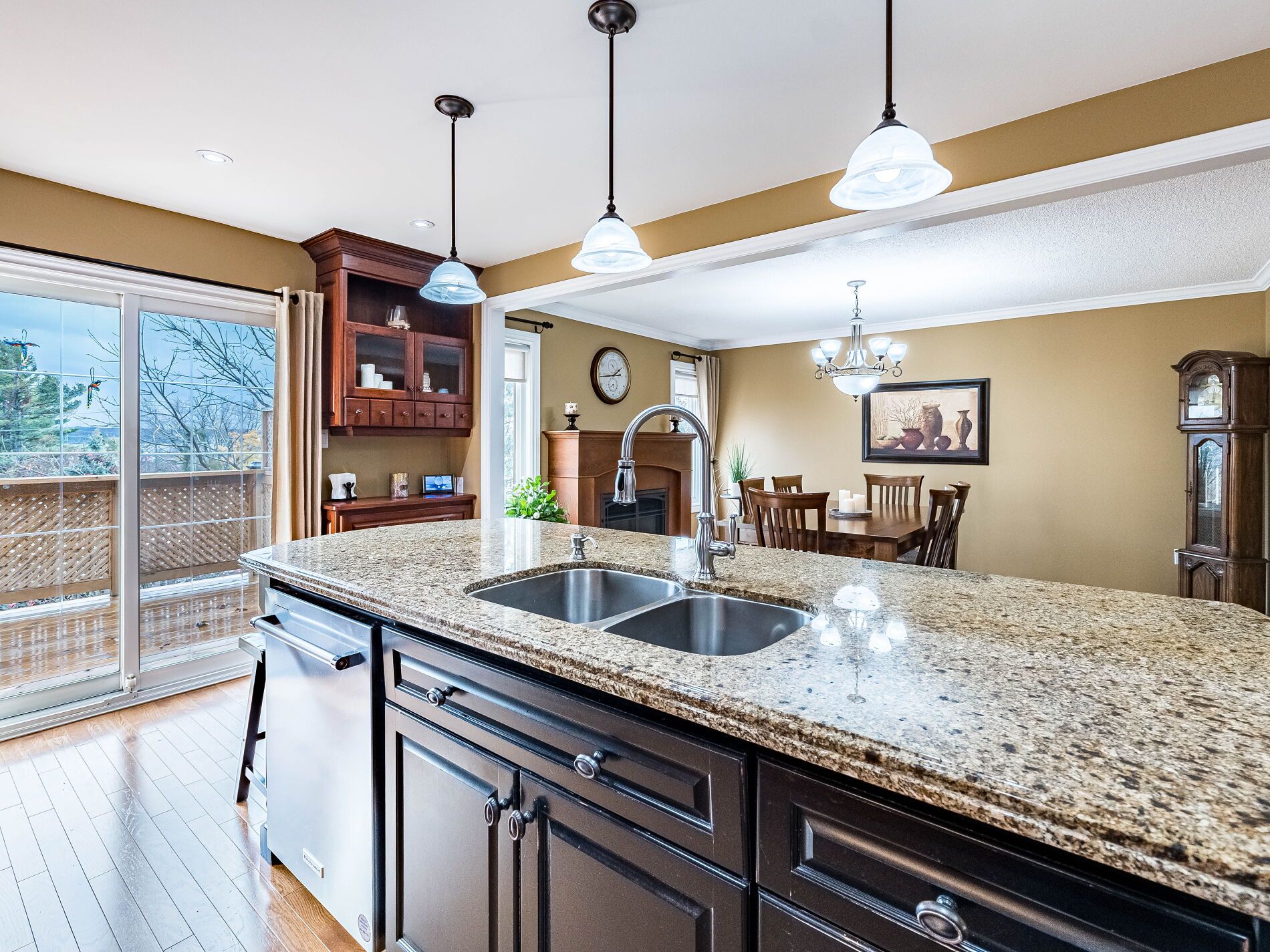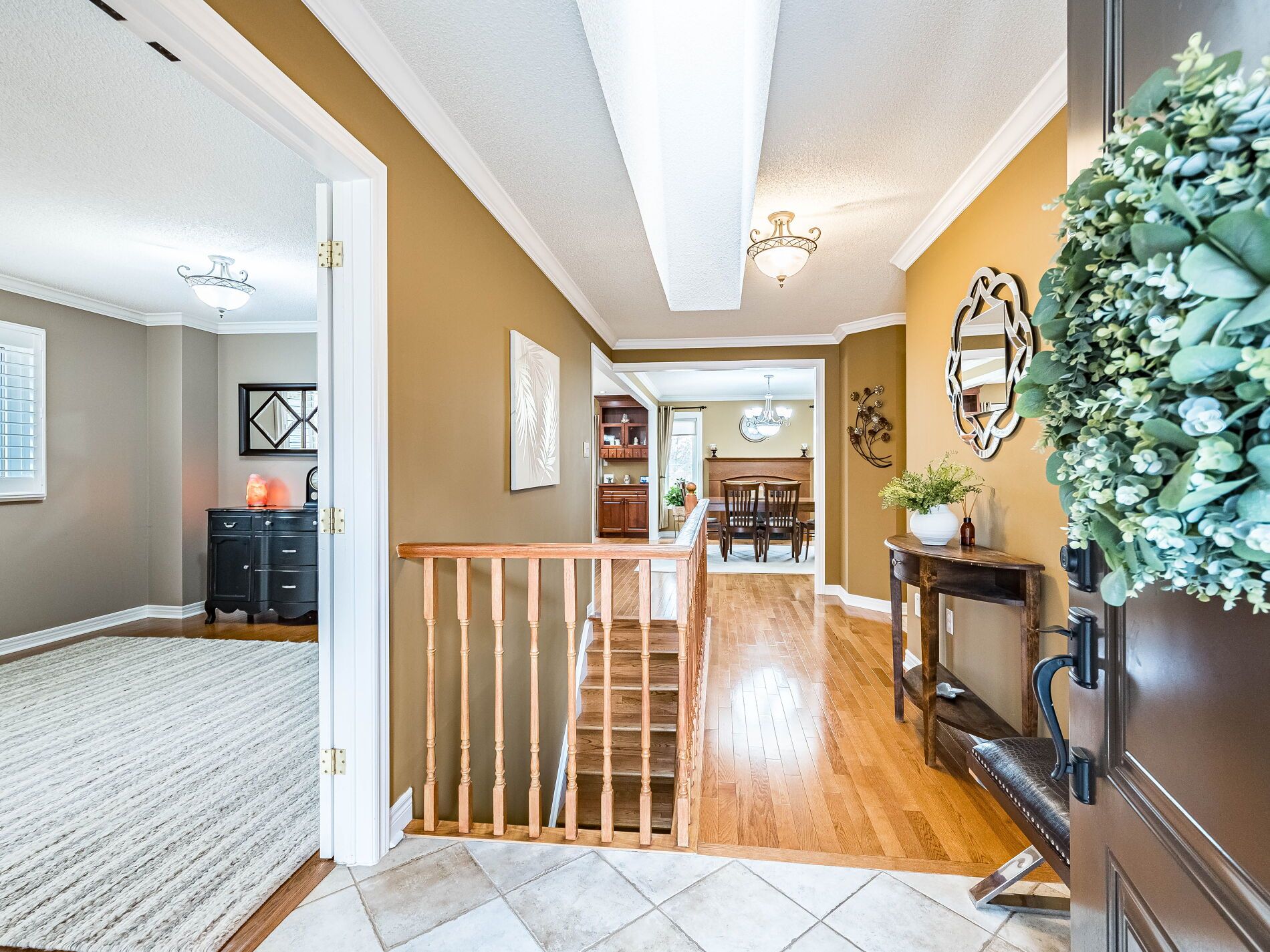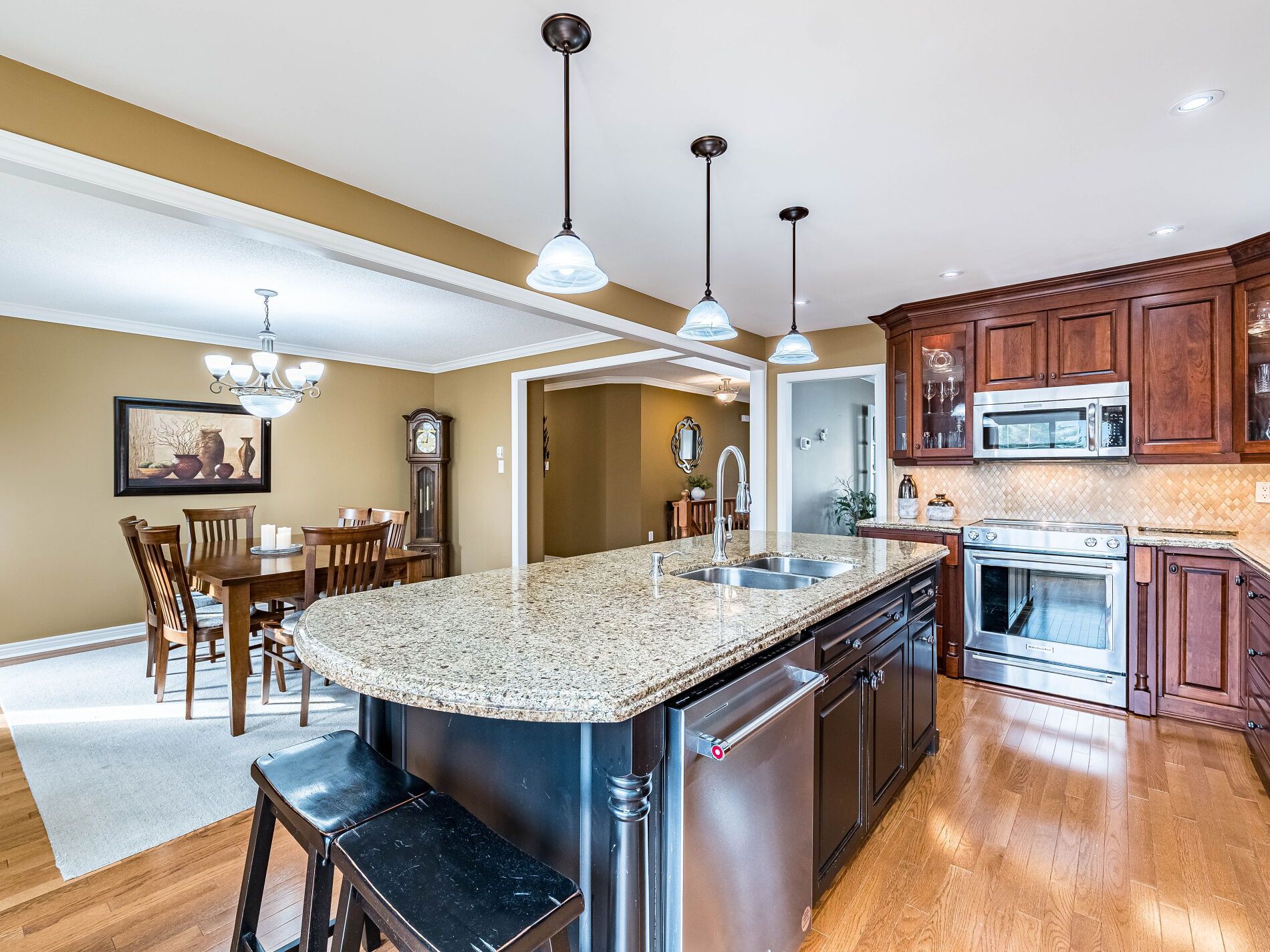 Welcome to 8 macallister court - where pride of ownership meets exceptional value. This impeccably maintained all-brick 3+1 bedroom bungalow offers a bright, open-concept layout on both levels and a long list of premium updates. The modern, fully remodelled kitchen is a standout centerpiece, featuring granite counters, center island, built-in appliances, and updated kitchenaid stove and dishwasher (2024). Main level enhancements include hardwood and porcelain flooring, crown moulding, updated window coverings (2024), most windows replaced, central air & central vac (2018). A skylight in the upper hall adds beautiful natural light. The finished walkout basement is designed for versatility and comfort-featuring a large family room, games area, solid oak wet bar, custom fireplace mantel, gas fireplace, a spacious guest bedroom, office, and renovated 3-pc bath (2024). With a separate - walk -out entrance, it is ideal for an in-law suite. Tv and soundbar behind the bar are included. Outdoor spaces impress with a south-facing upper deck (2023), walkout patio, landscaped yard featuring side masterpiece stone stairs, large powered shed, irrigation system, and convenient power outlet on the back lawn. Family room is currently being used as a dining room. Additional premium updates include: garage insulated, drywalled & epoxy flooring (2024) front porch epoxy (2024) main bath renovation (2024) on-demand water heater (2025) water softener (2024) washer (2023) main floor laundry hookups plus full laundry room in basement. Location is unbeatable-just minutes to highway 400, top-rated schools, beautiful parks and trails, and a great selection of restaurants, shops, and everyday amenities. This exceptional property blends craftsmanship, thoughtful upgrades, and functionality-a true rare find in a coveted court location.