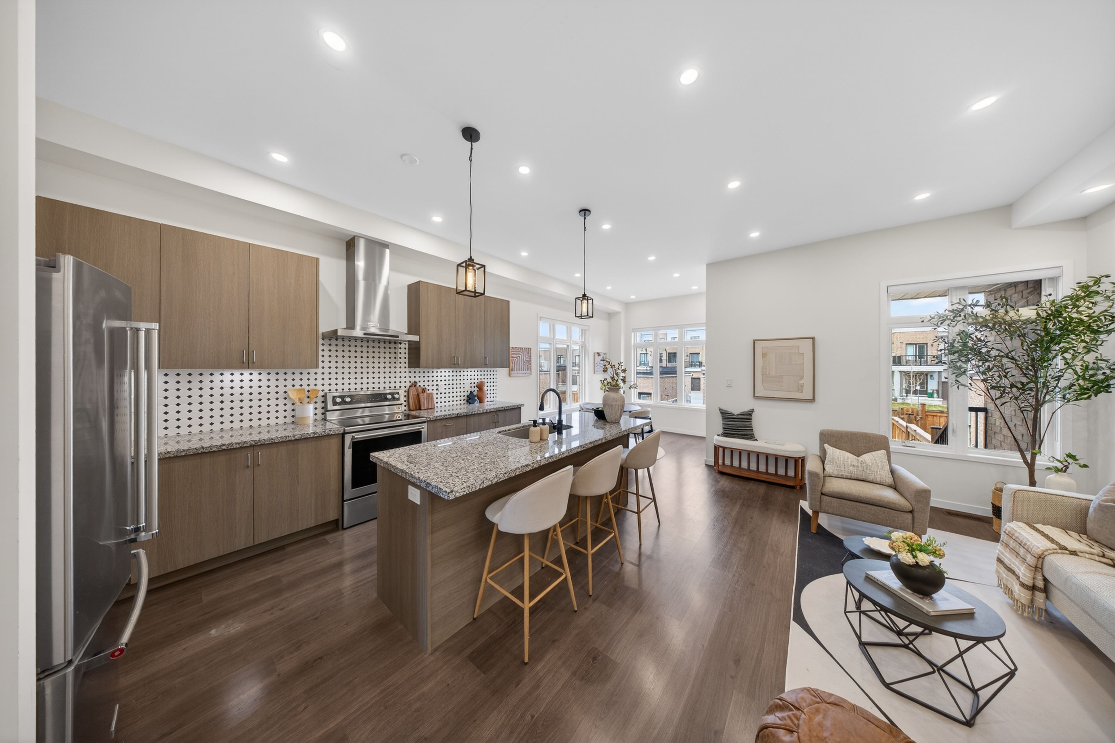• Elegant eat-in kitchen with granite countertops and top-tier appliances.