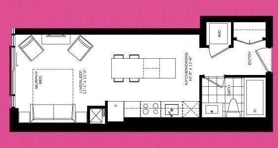 • Spacious studio with 9 ft ceilings and an open concept layout.