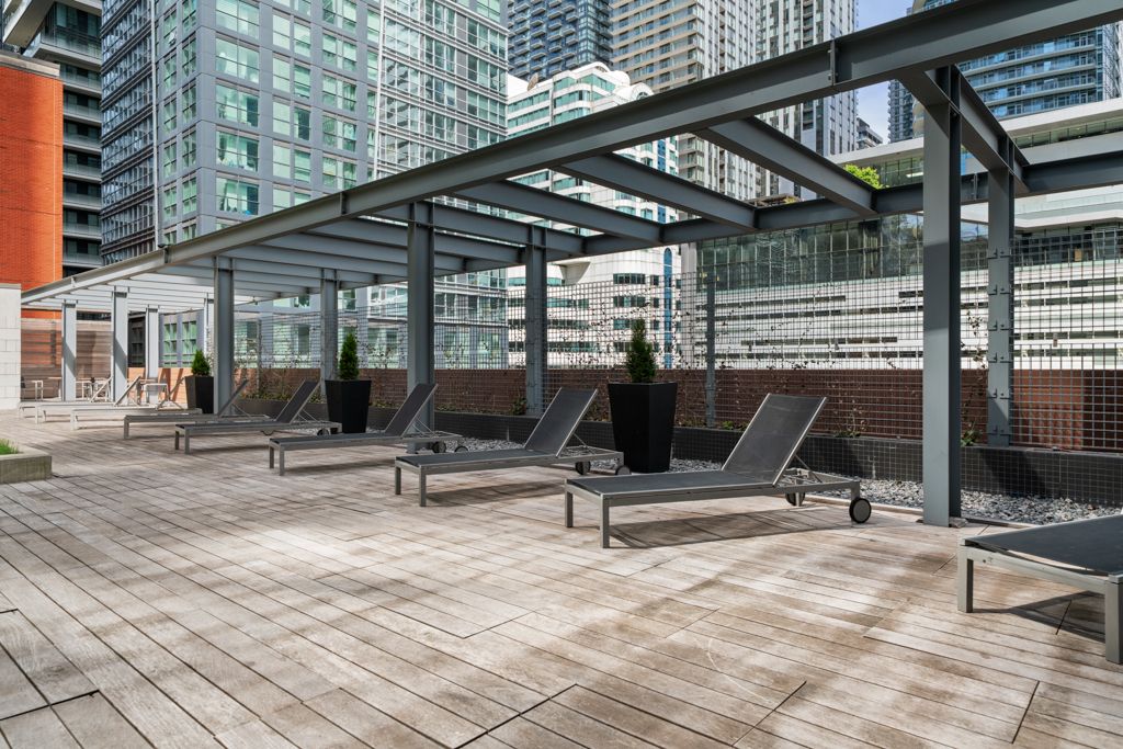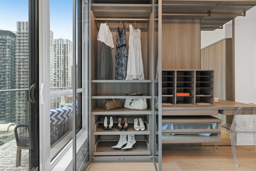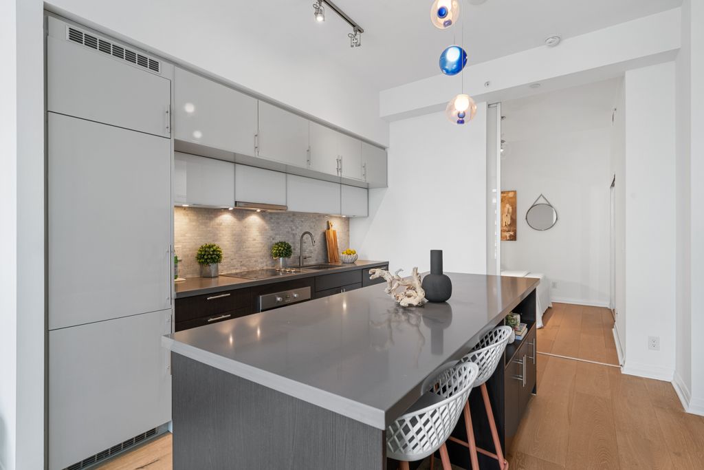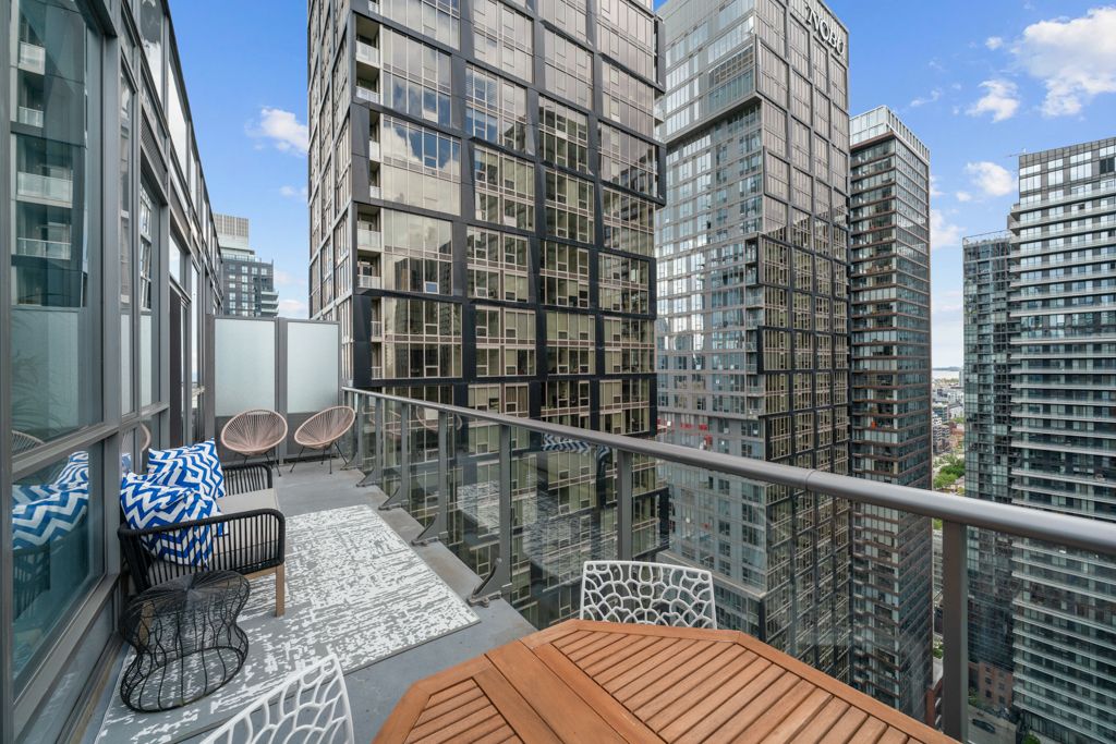 Welcome to penthouse 3305 at the mercer: an elegant, sky-high sanctuary perched above toronto's entertainment district. Mercer street is toronto's most manhattan moment: refined, vertical & upscale. It's a short, yet sophisticated stretch where valet attendants, polished lobbies & luxury service are the default. Flanked by the globally acclaimed nobu restaurant & boutique le germain hotel, mercer hums with quiet exclusivity. From late-night black cars to 5-star dining, the street moves at its own rhythm. It's not just a location; it's a lifestyle reserved for the discerning few. This west-facing 2-bed, 2-full-bath unit is filled with natural light & offers an expansive outlook with enduring openness over the district. A 180-sqft, terrace-like, rooftop-style balcony finished with deck tiles crowns the suite, offering open skies with no structure above, accessible from both the living area & the primary bedroom. Inside, 884 sqft of modern, open-concept living space is framed by 10-ft smooth ceilings & floor-to-ceiling windows. The chef's kitchen showcases b/i, s/s miele appliances, streamlined cabinetry & an 8-ft, double-sided waterfall island features integrated seating. The living area boasts a custom 'b&b italia' wall system, designer shelving & integrated media center that blends beauty & function. The primary bedroom fits a king bed, offers a 3-pc ensuite & is equally elevated with two 'poliform' italian night systems custom wardrobe with integrated lighting, vanity & leather detailing. The second bedroom fits a queen bed and in-suite laundry is tucked away in a walk-in closet. Enjoy premier p2 parking & locker, p1 visitor parking & bike storage, and exceptionally modest maintenance fees. Benefit from the boutique gym & spa, and relax or entertain on the rooftop garden with sunbeds, bbqs, & al fresco dining. Live steps from the path, ttc, rogers centre, tiff lightbox, roy thomson hall & toronto's finest restaurants & boutiques, with quick access to gardiner.