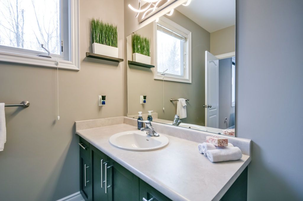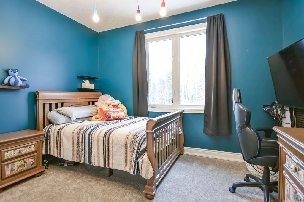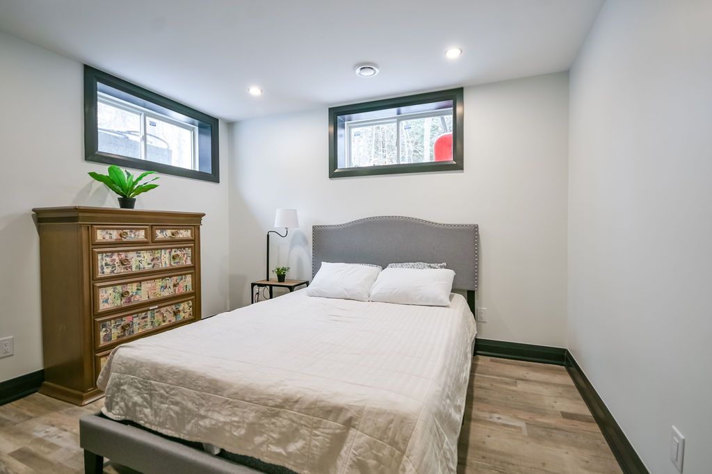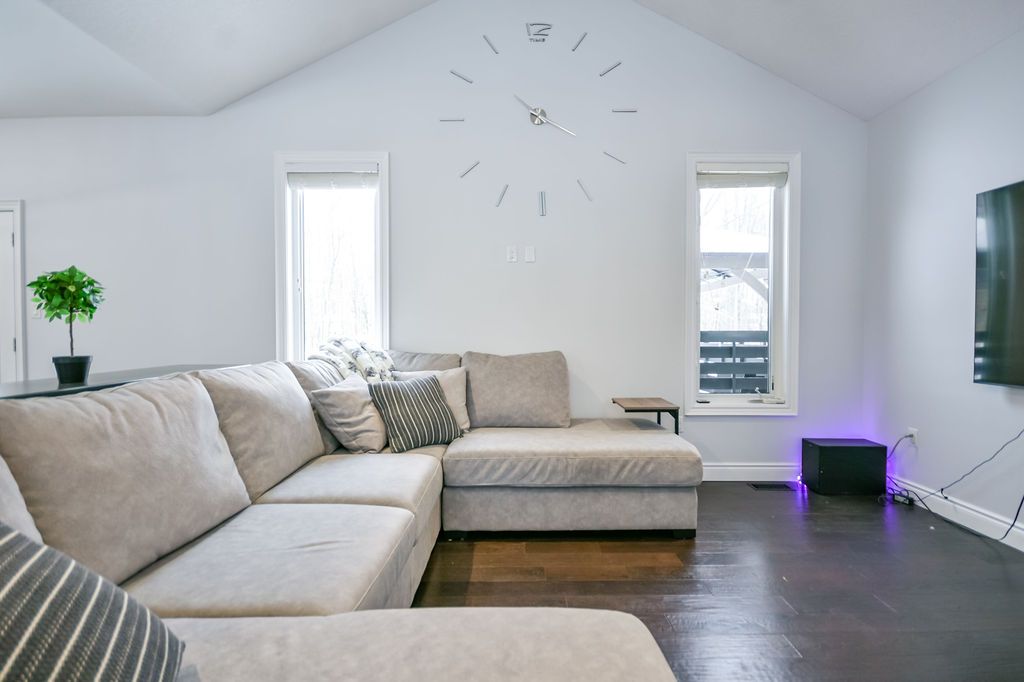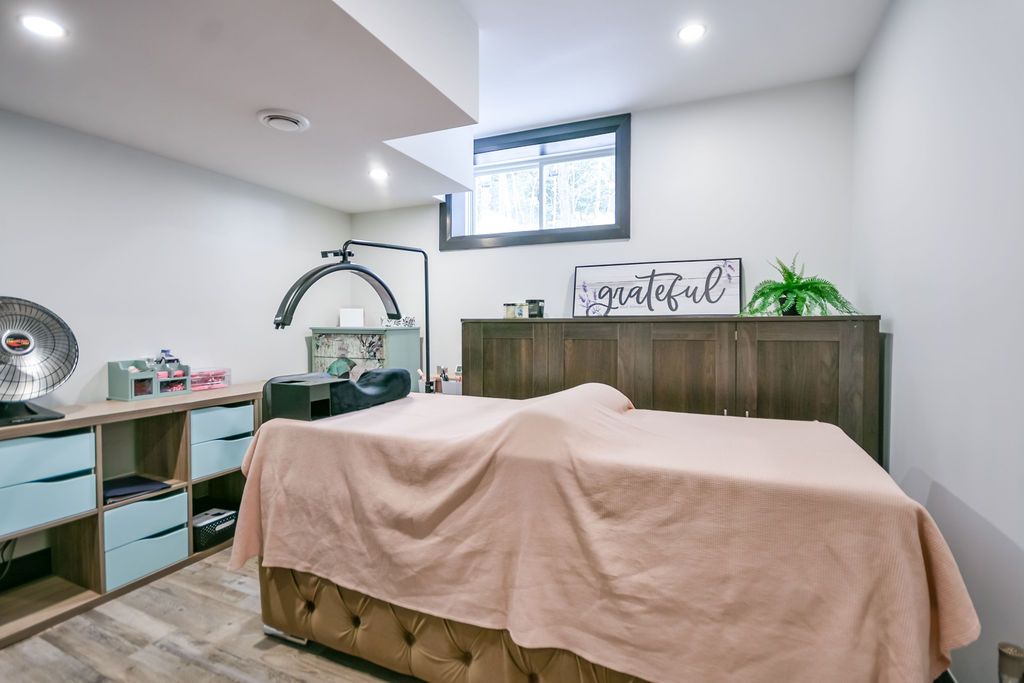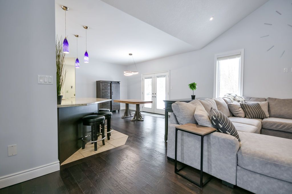 Welcome to this beautiful custom-built bungalow nestled in the sought-after community of warminster, set on a 1. 15-acre treed lot offering privacy, elegance, and resort-style living. This impressive 5 bedroom, 4 bathroom home showcases over $250,000 in upgrades and a thoughtful open-concept design featuring 9-foot ceilings and an abundance of natural light throughout. The entertainment-sized kitchen is a chef's dream with granite countertops, travertine tile, breakfast bar, and stainless steel appliances including a gas range, beverage refrigerator, and dishwasher. The inviting primary suite offers a luxurious ensuite and tranquil views, while the main floor laundry and 2-piece powder room add convenience and functionality. Hardwood floors flow seamlessly through the main living areas, enhancing the home's warmth and character. The finished lower level is designed for entertainment and relaxation, featuring two large bedrooms, a spa-inspired bathroom with walk-in shower, a home theatre, video gaming area, and a spacious family room with custom bar area - perfect for hosting friends and family. Step outside to your private oasis: a large entertainment-sized deck overlooks the landscaped yard and a stunning 16' x 32' heated inground pool (2023), creating the ultimate backyard retreat. The attached double tandem oversized garage provides ample space for vehicles, tools, and toys. This beautiful home is also wired for generator power for added security during power outages. Ideally located near parks, soccer fields, baseball diamonds, pickleball courts, and the new xposed ball hockey league courts, this home offers the perfect balance of luxury, recreation, and community living. Experience the best of country charm and modern sophistication in this exceptional warminster bungalow - a true entertainer's dream! Upgrades: waterproofing of complete basement (2023), washer & dryer (2024), humidifier (2023), buried electric fence for pets, all deck boards (2024)