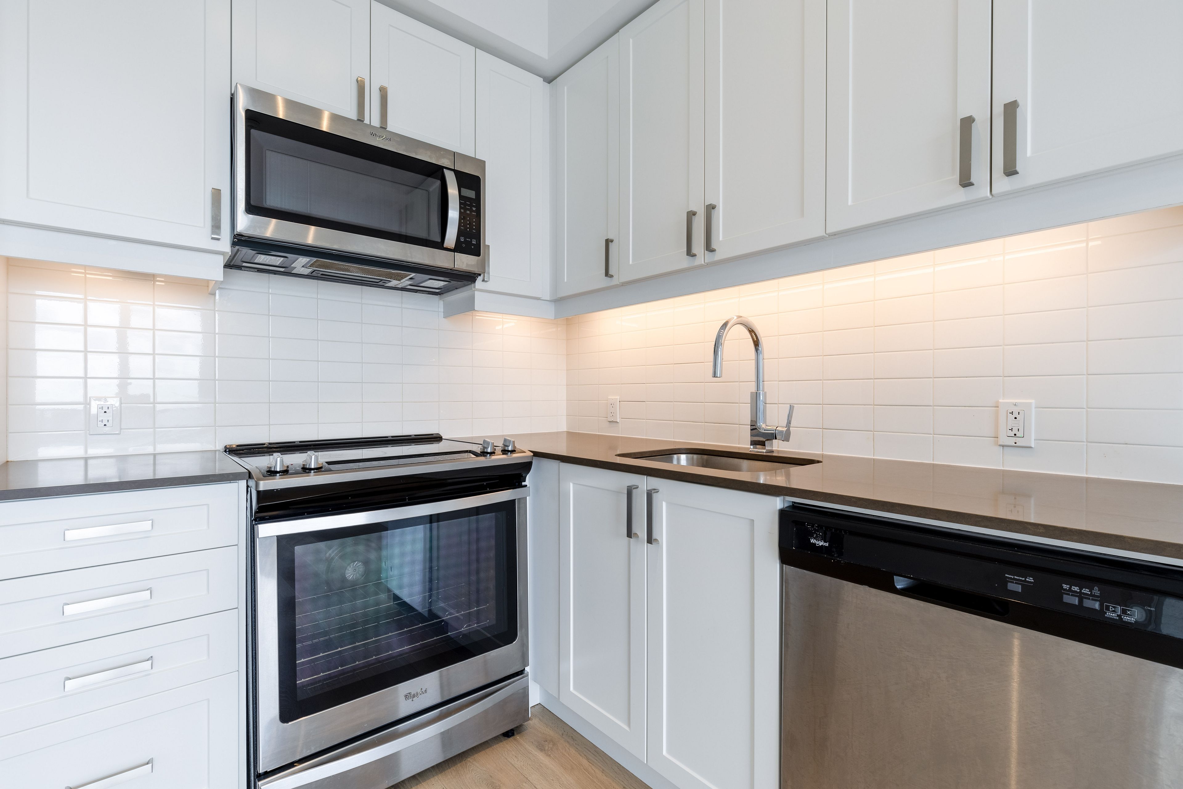 • Modern kitchen featuring quartz countertops and built-in appliances.