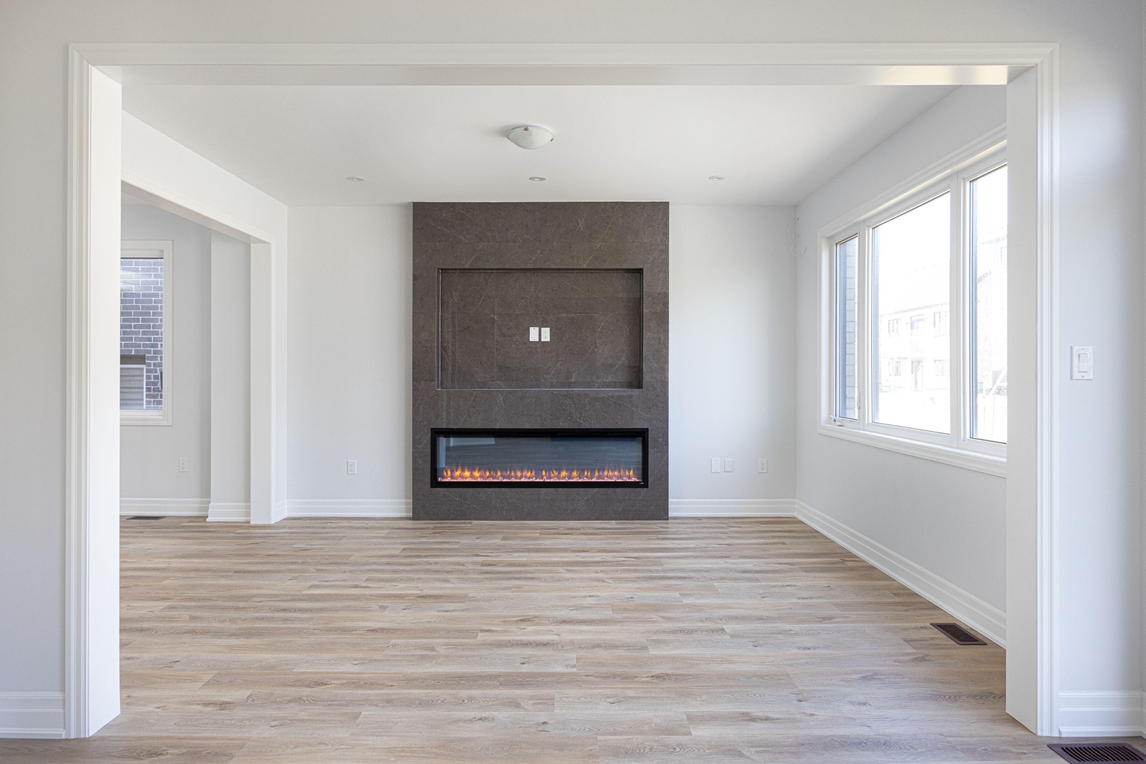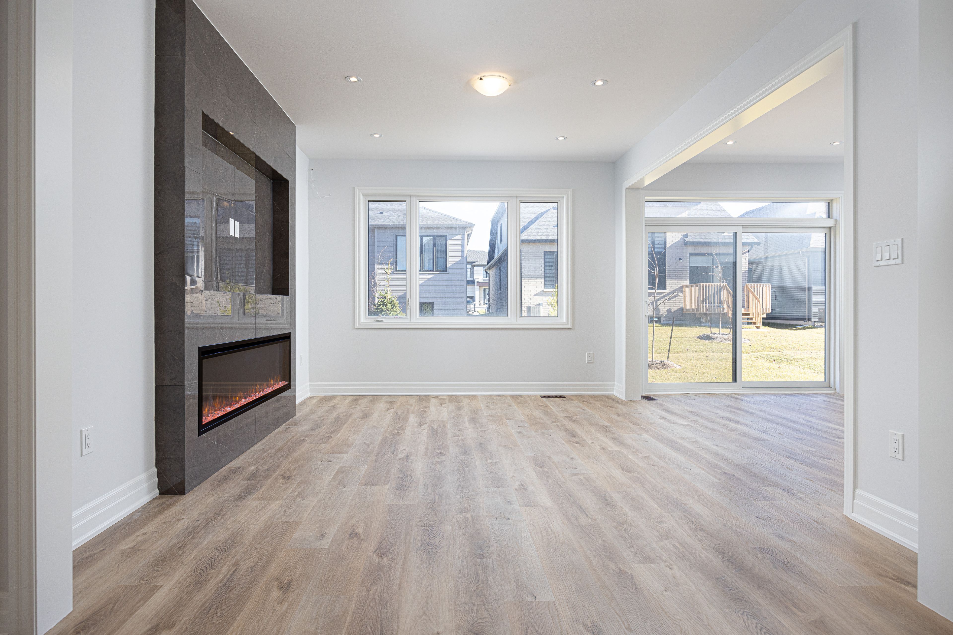 • Open-concept living area with a sleek fireplace and natural light.