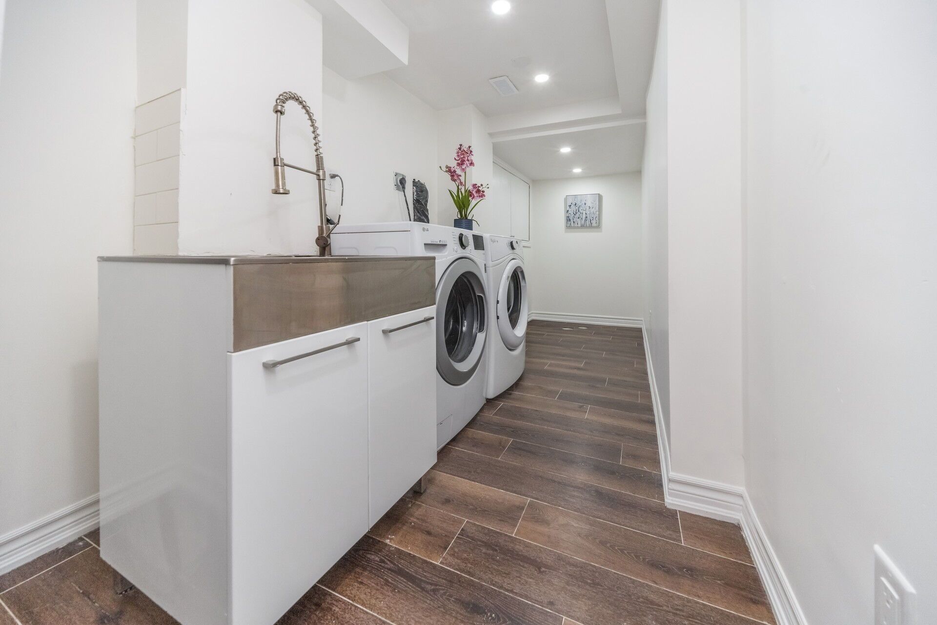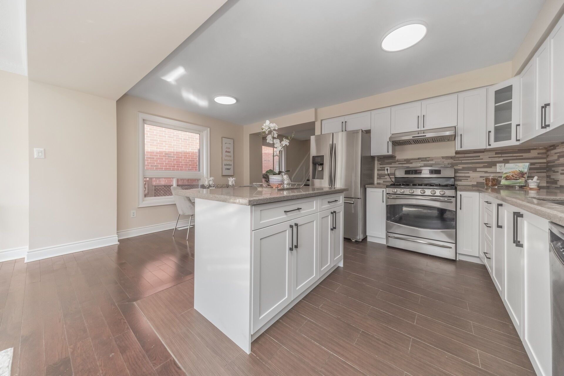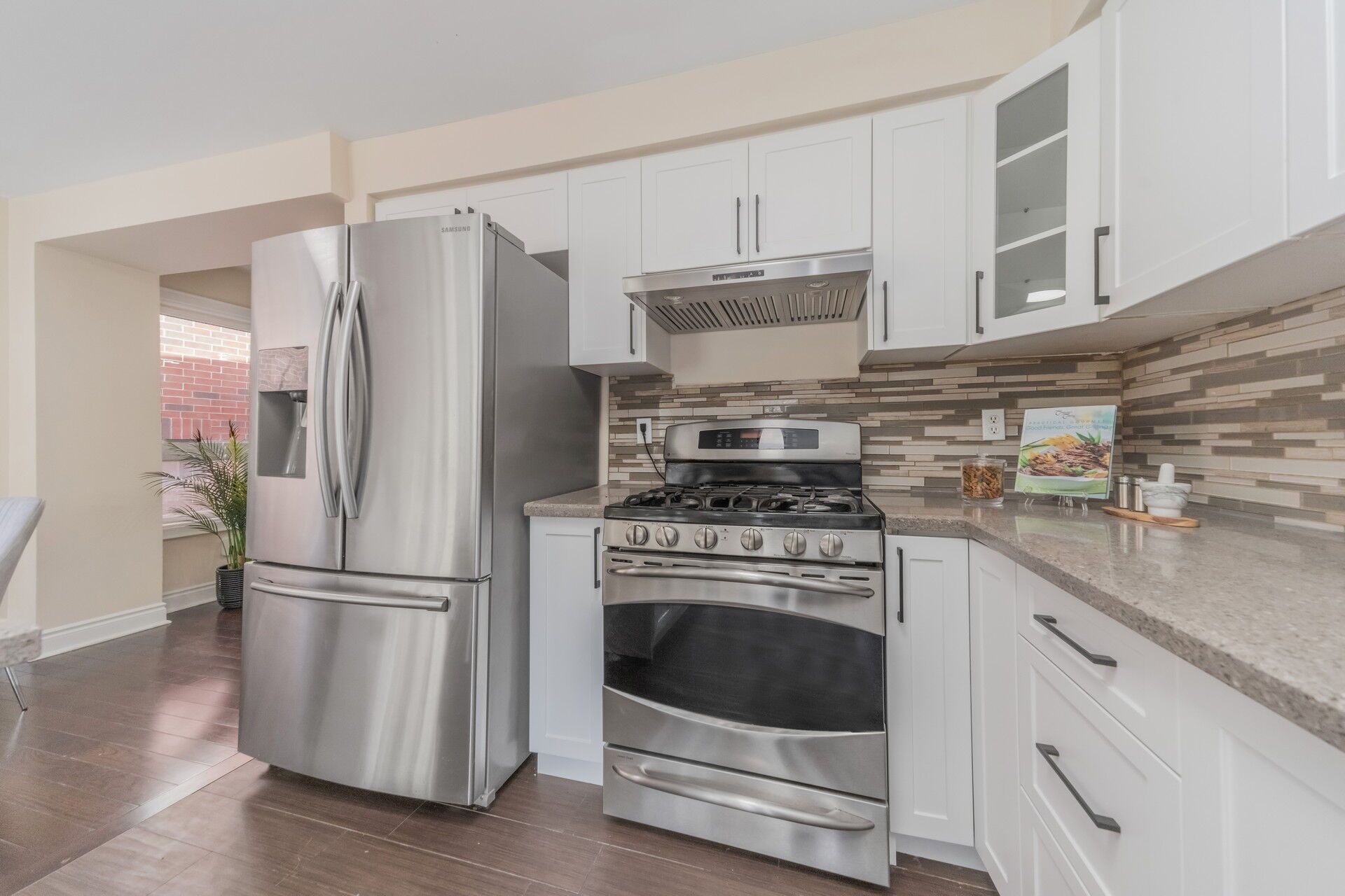 • Modern kitchen with granite countertops and stainless steel appliances.