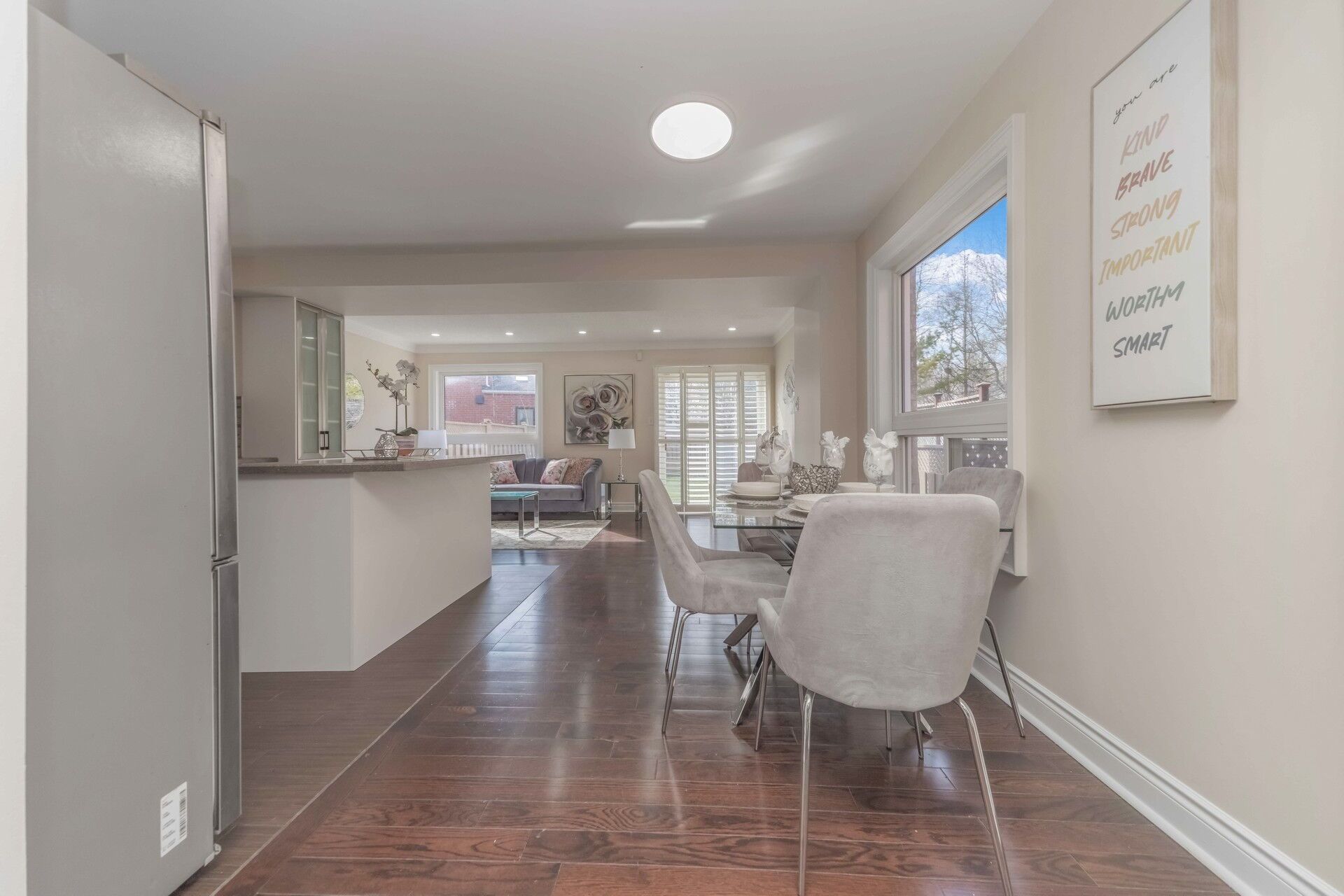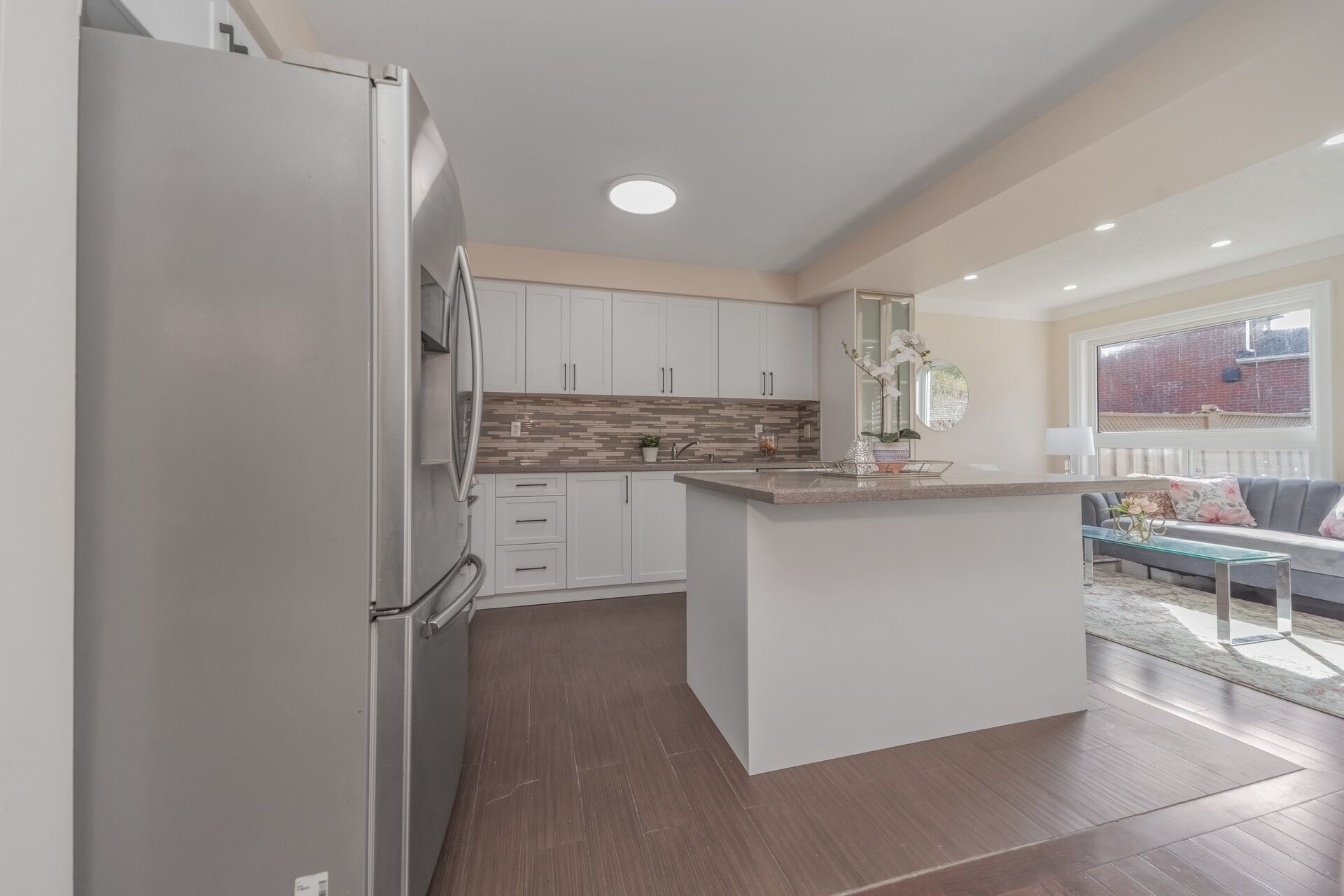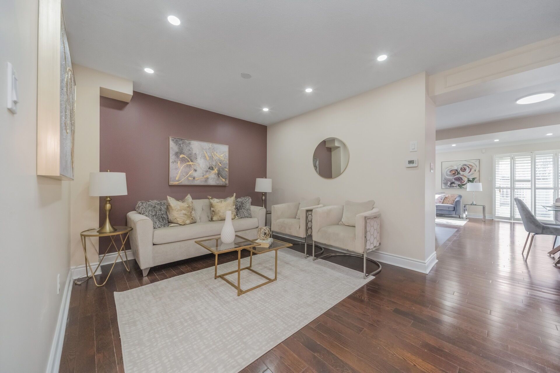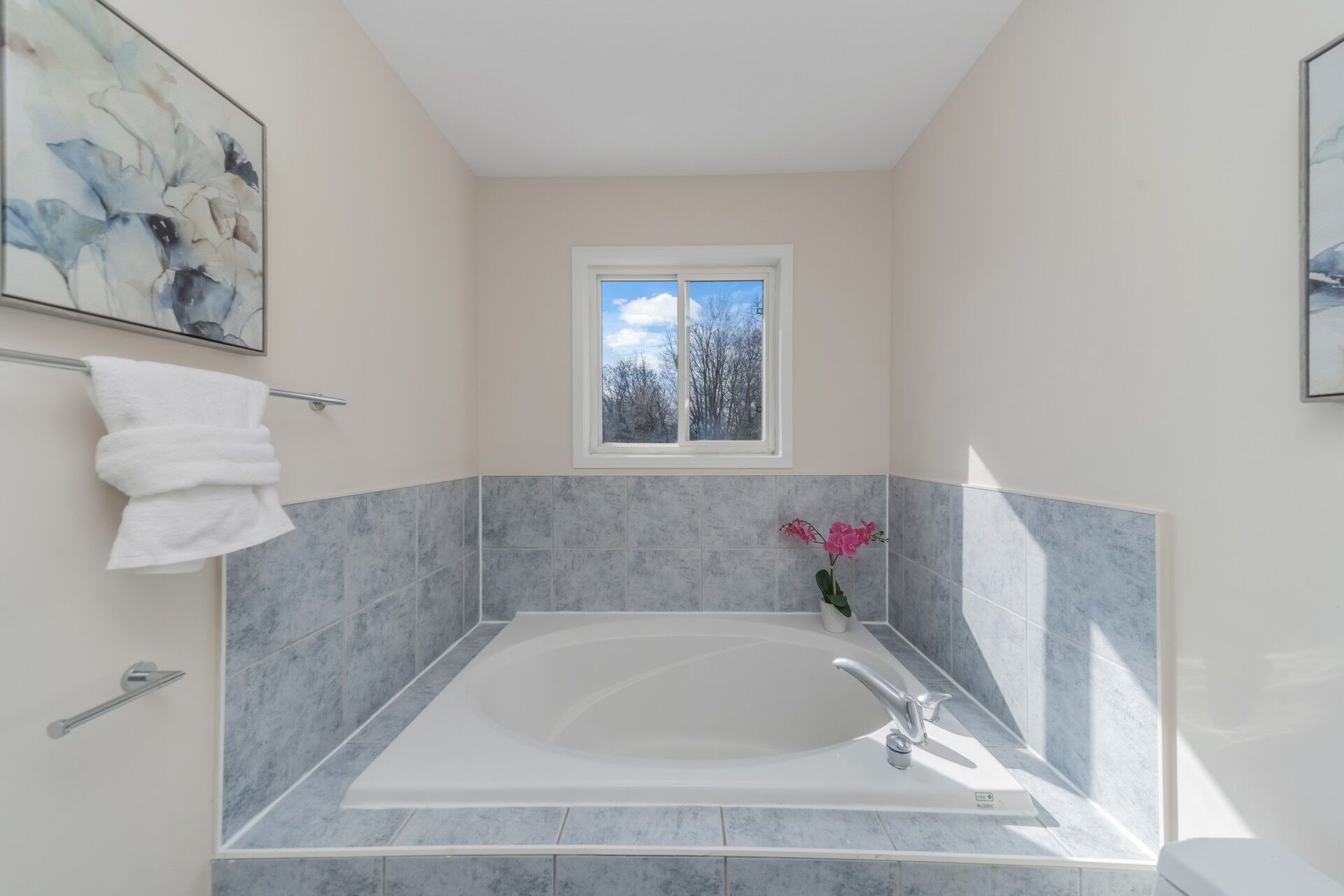 • Bright family room with views of a ravine-like backyard.