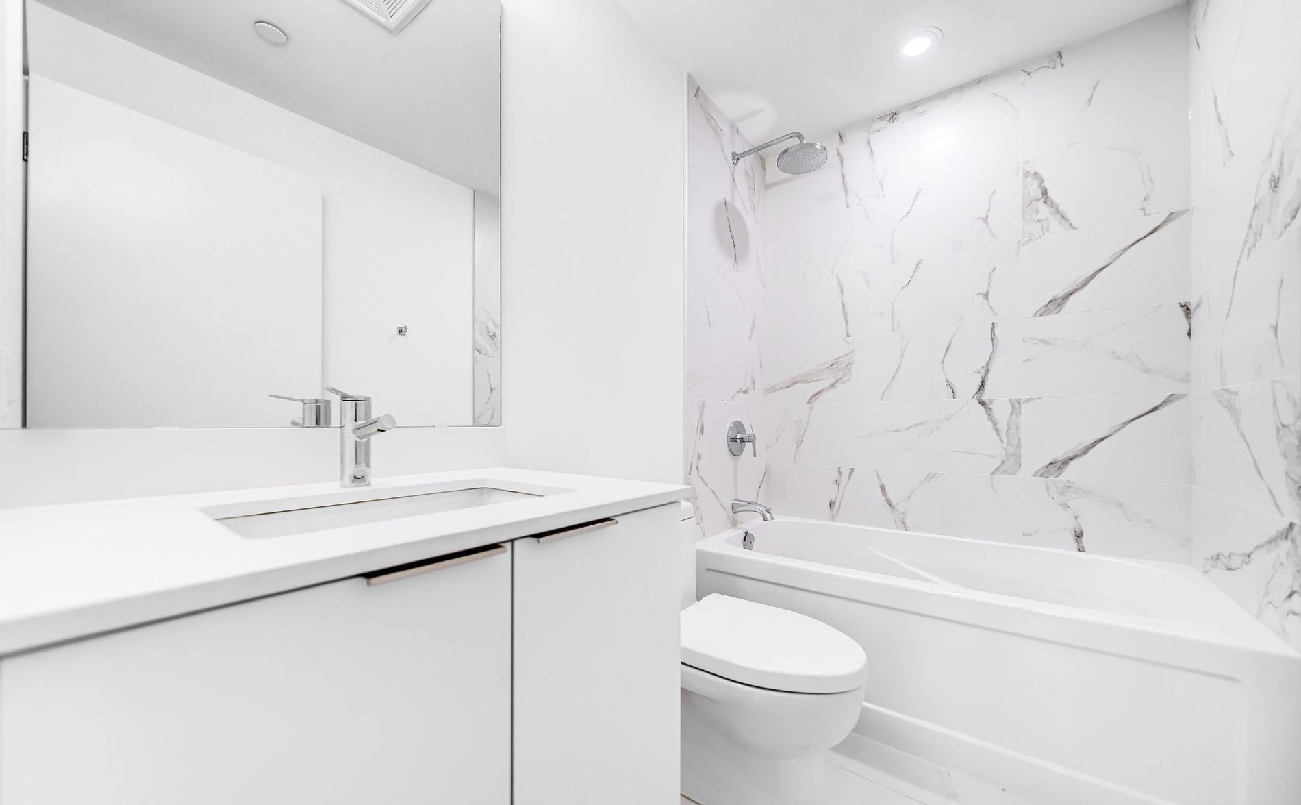 • Modern kitchen with quartz counters and stainless steel appliances.