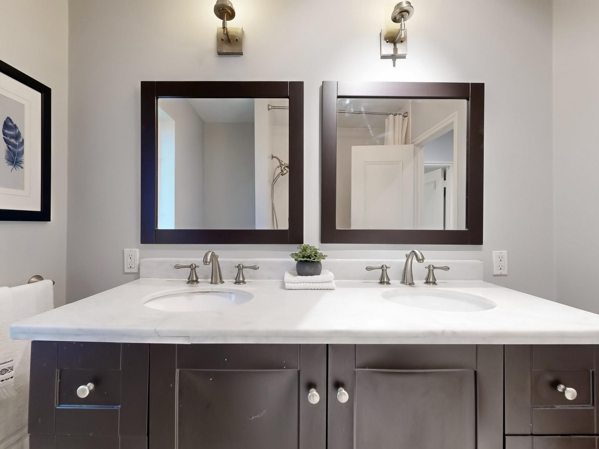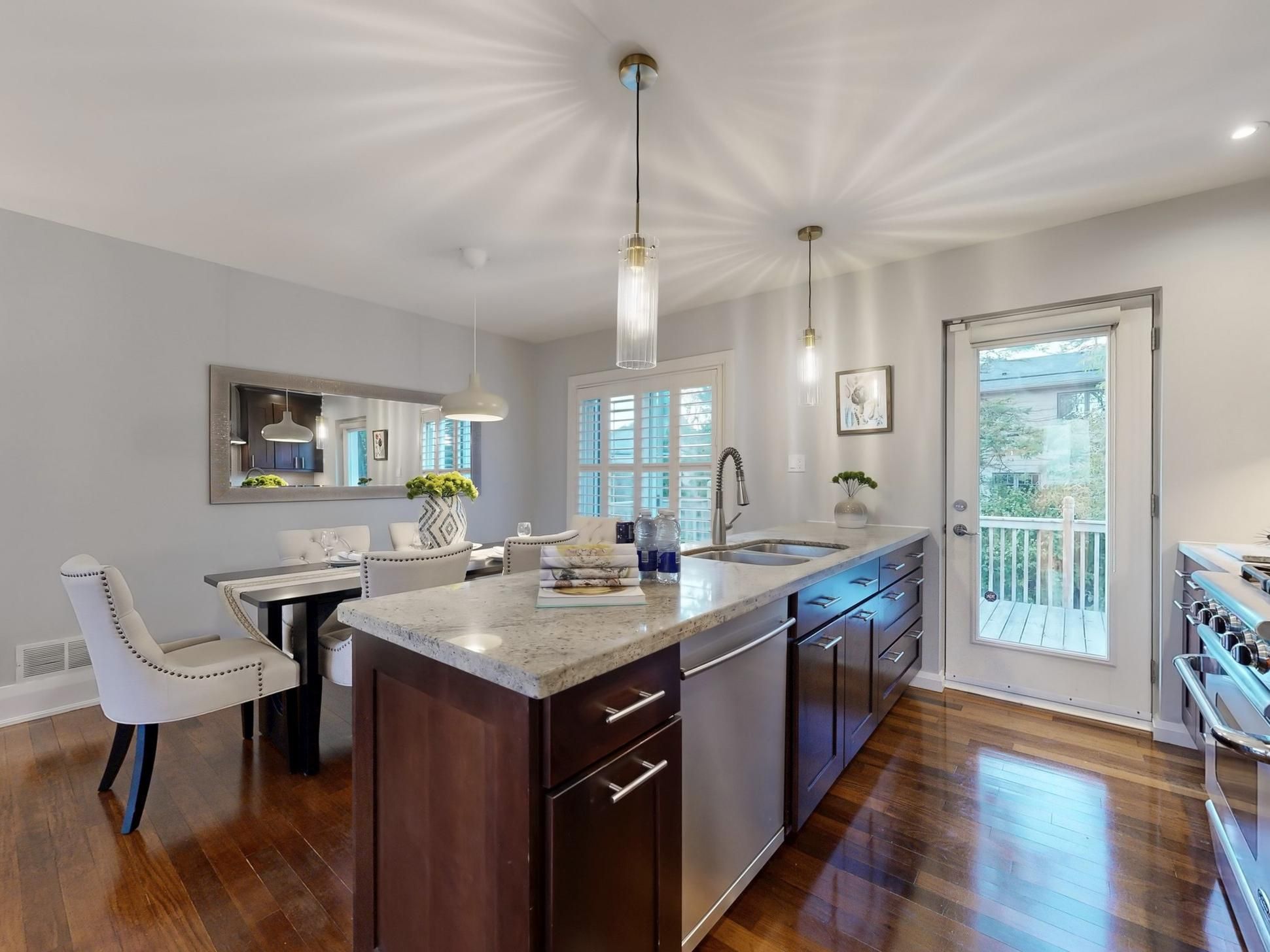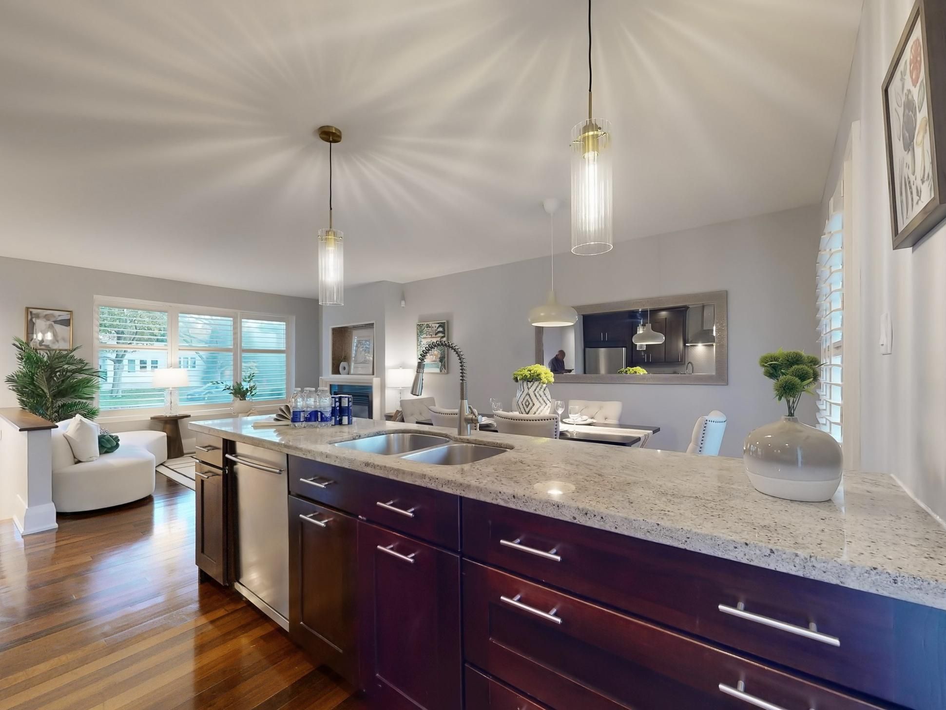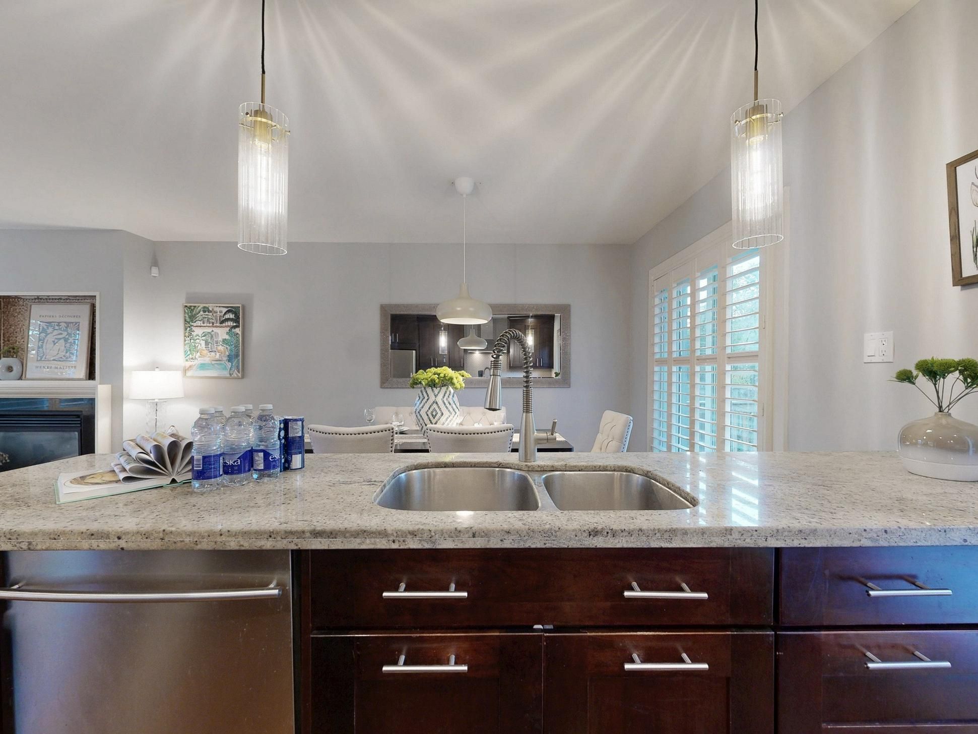 • Modern kitchen with stylish marble countertops for cooking.