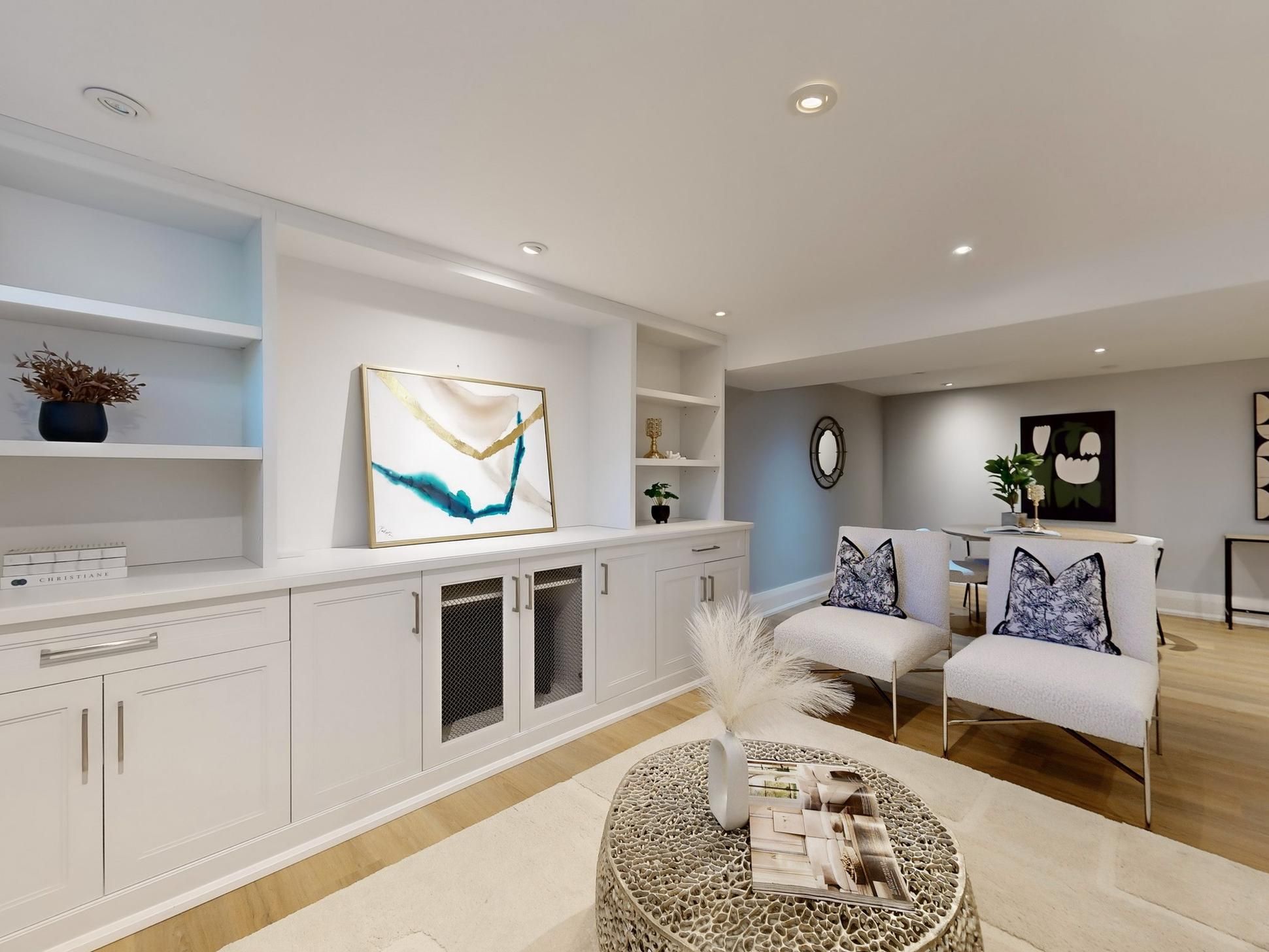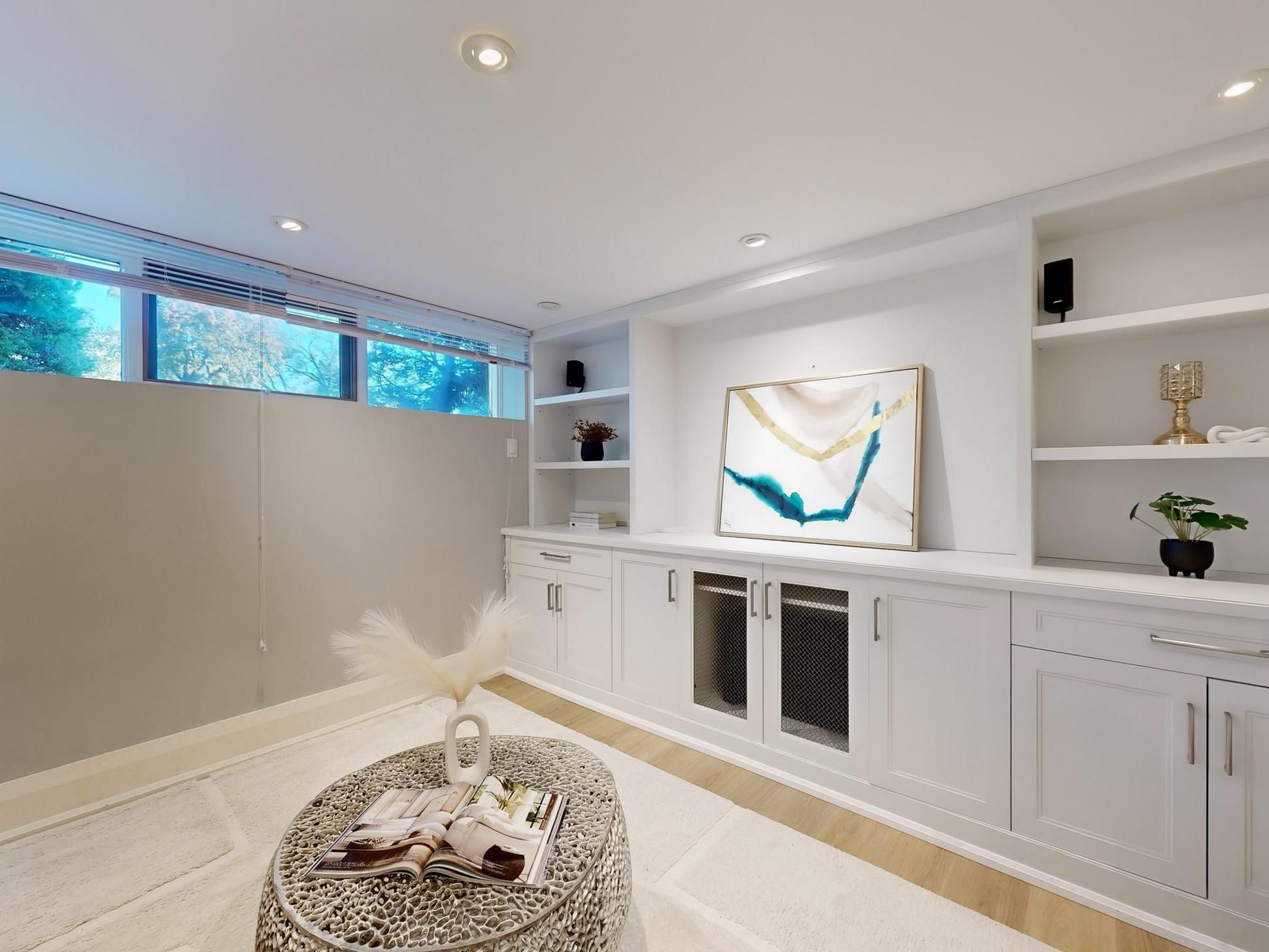 • Bright basement recreation room with built-in surround sound.