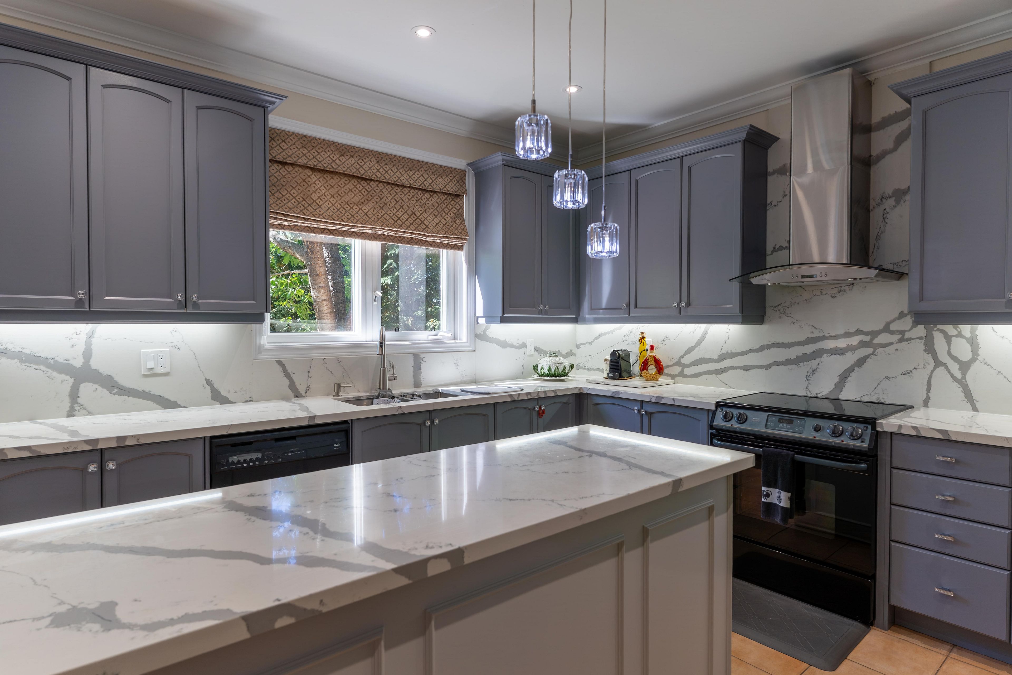 • Renovated kitchen featuring extensive quartz surfaces and modern design.