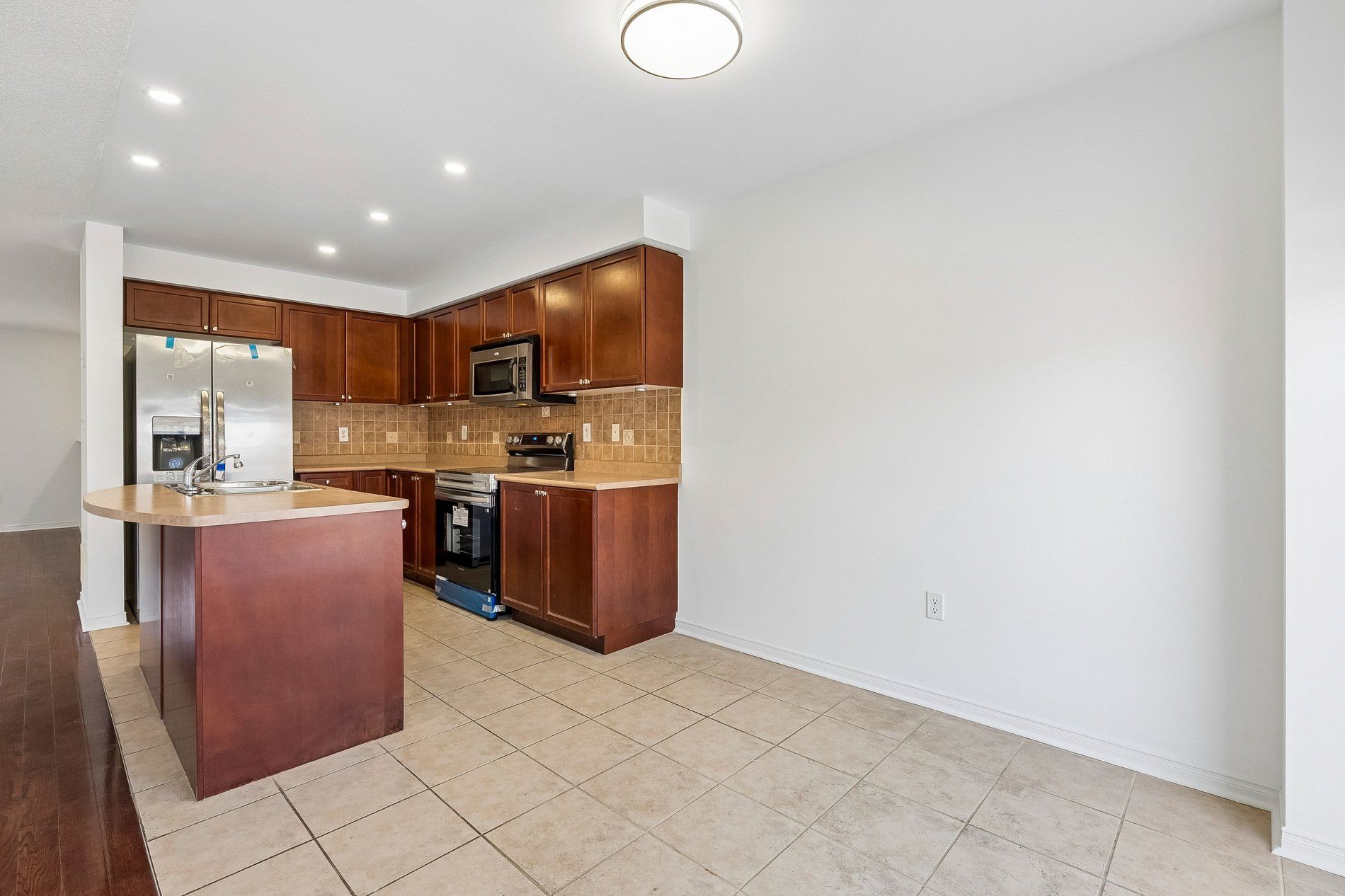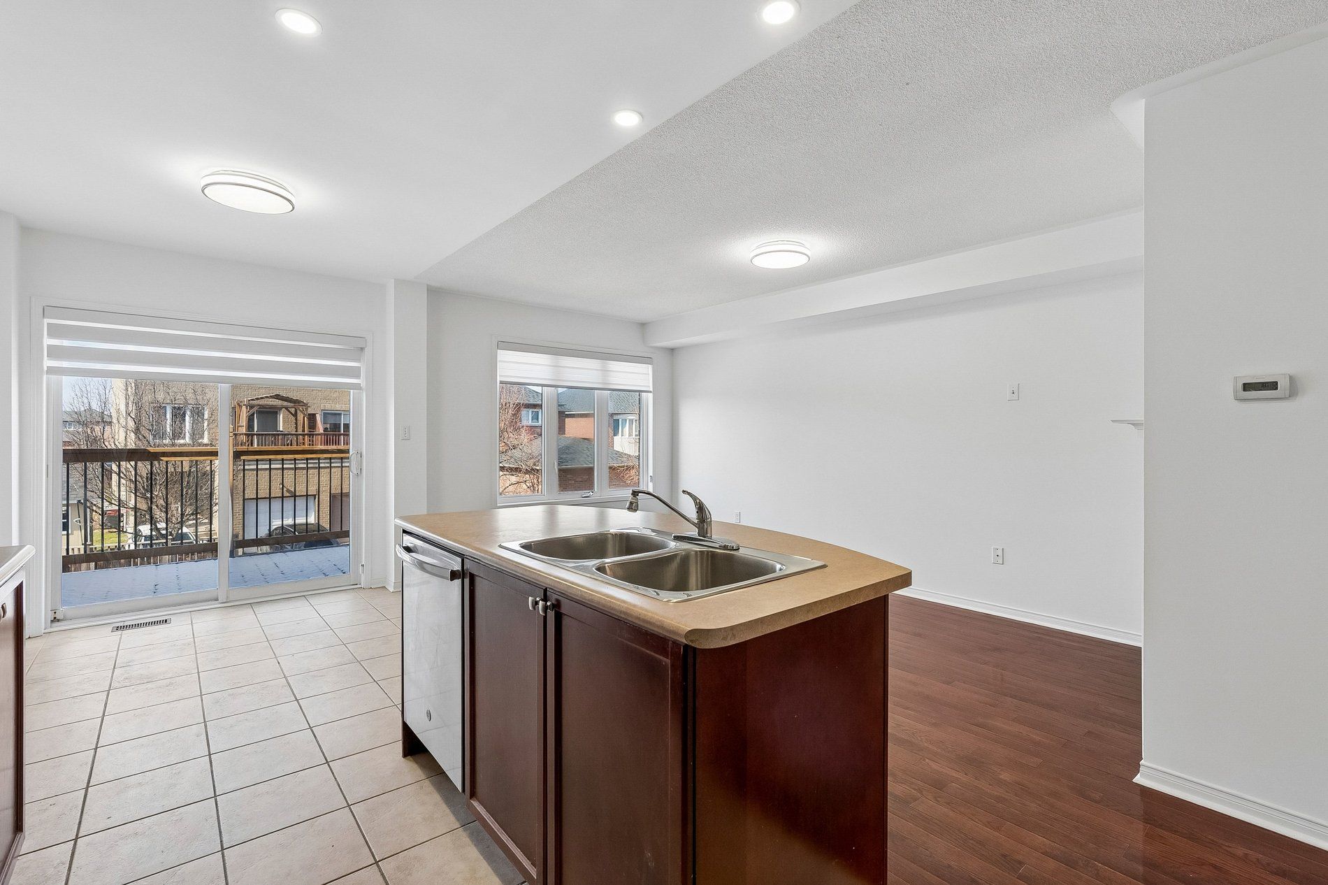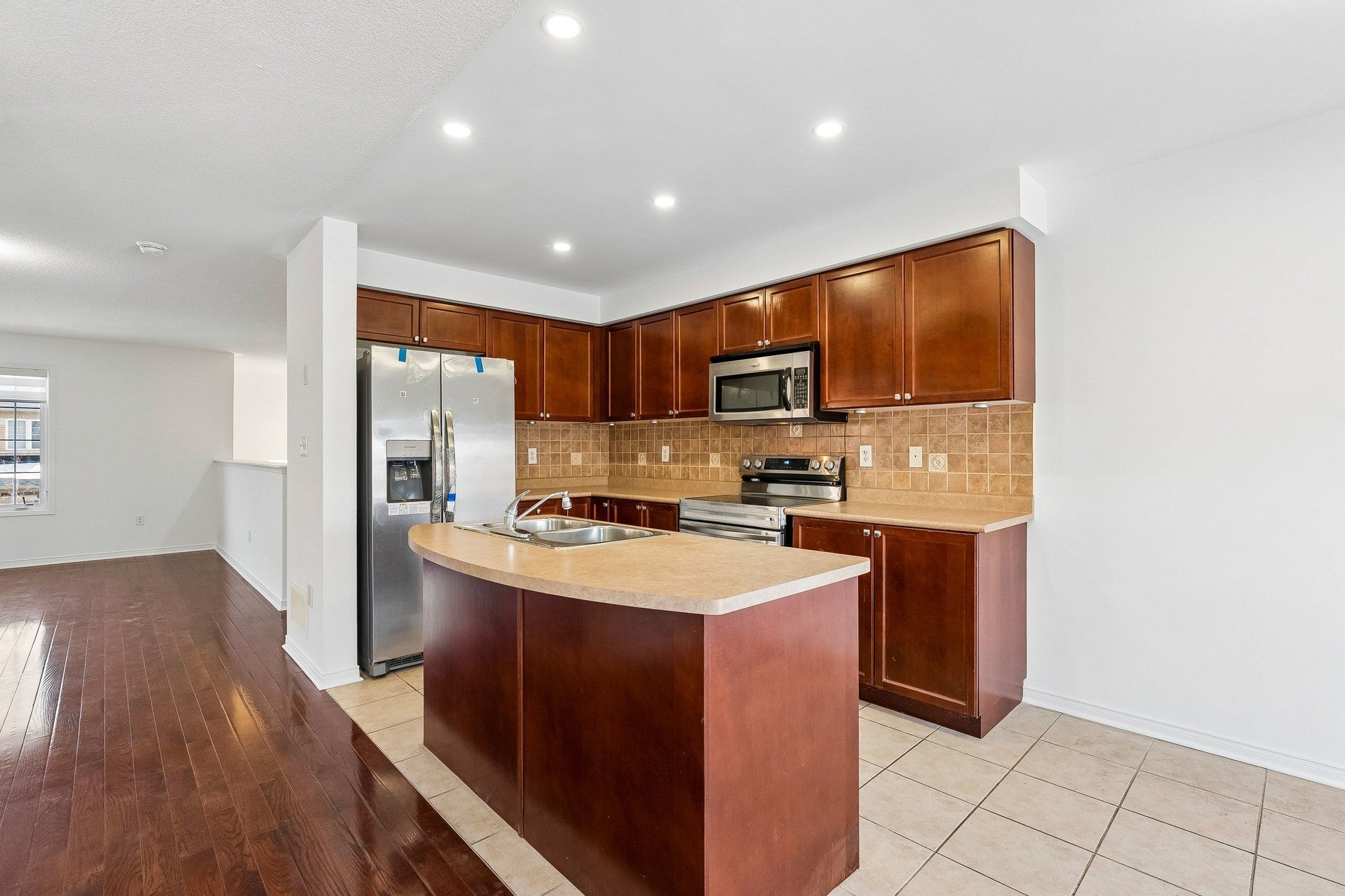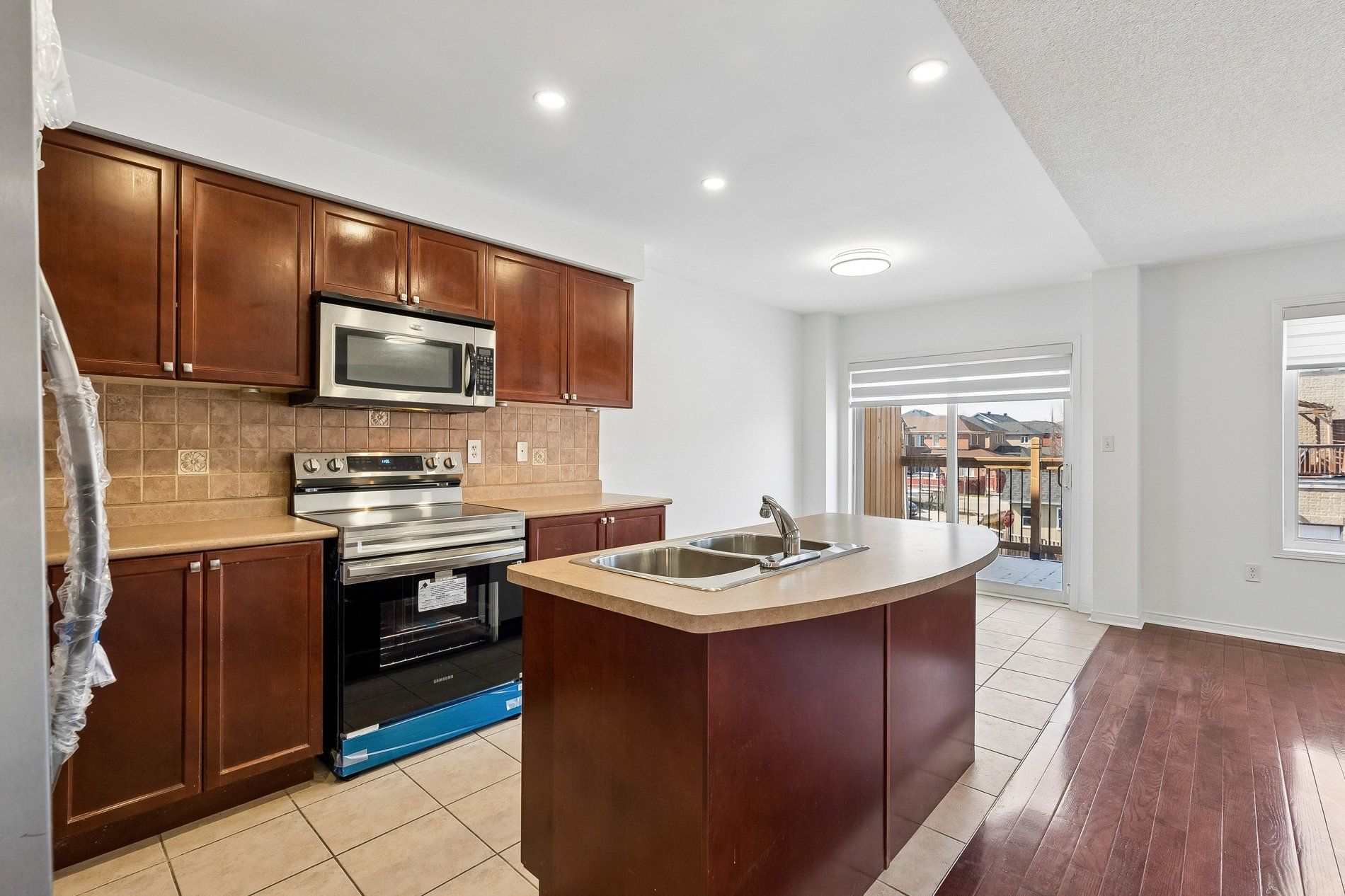 • Eat-in kitchen features a center island and double sink.