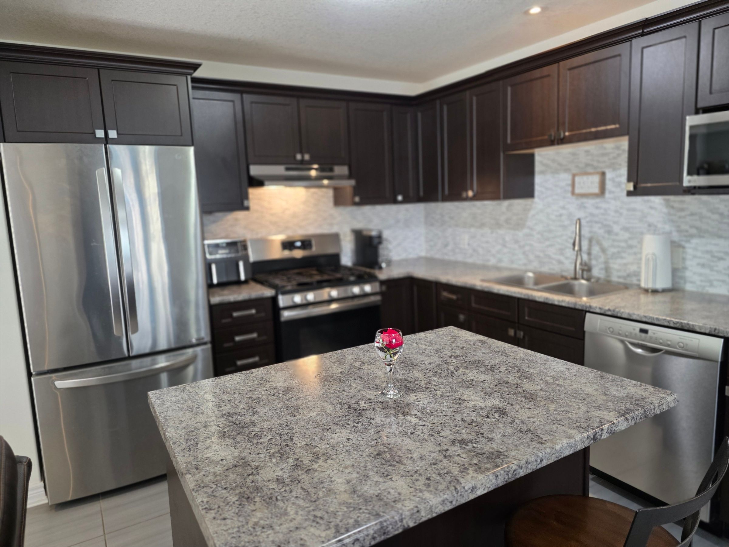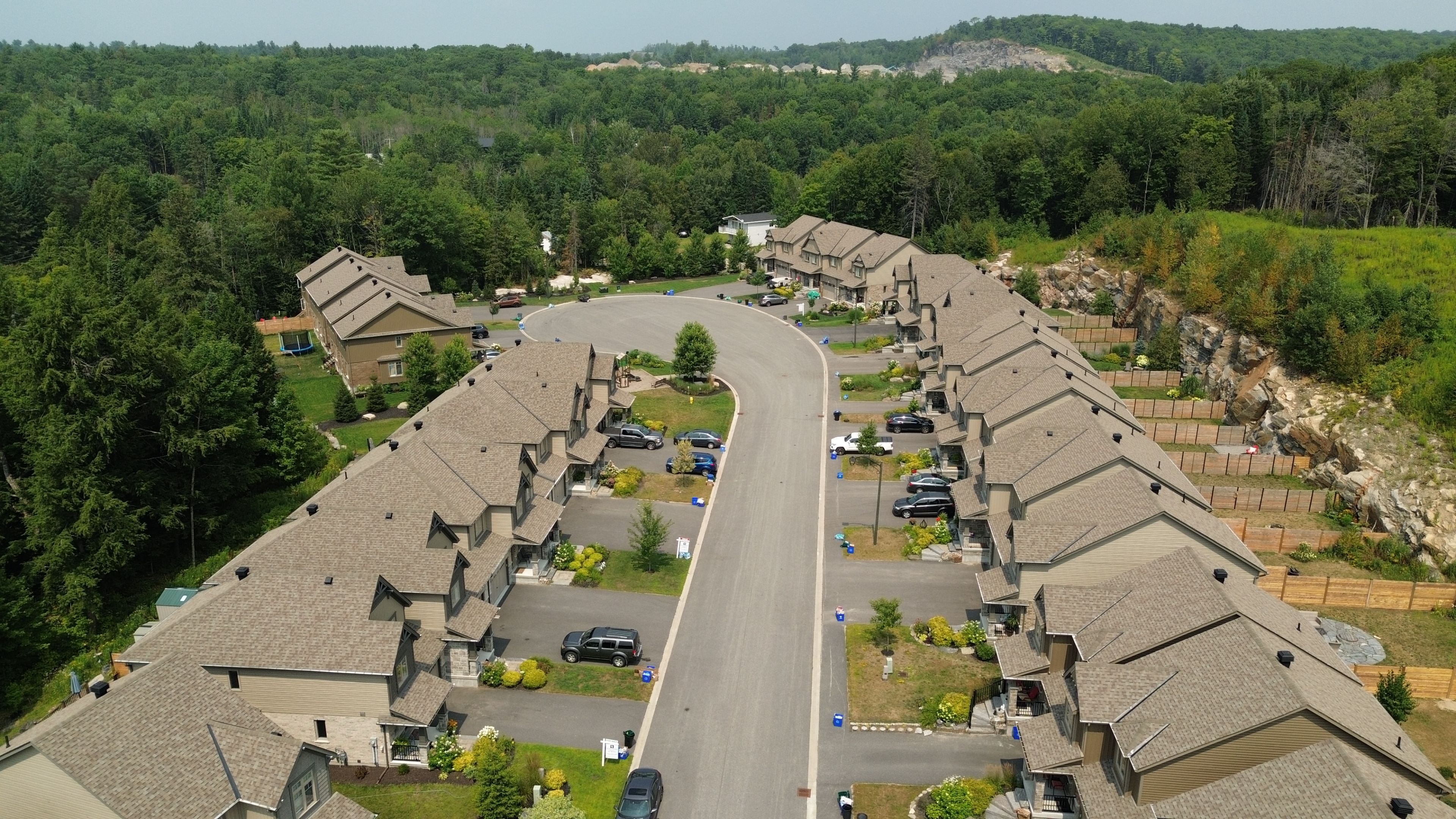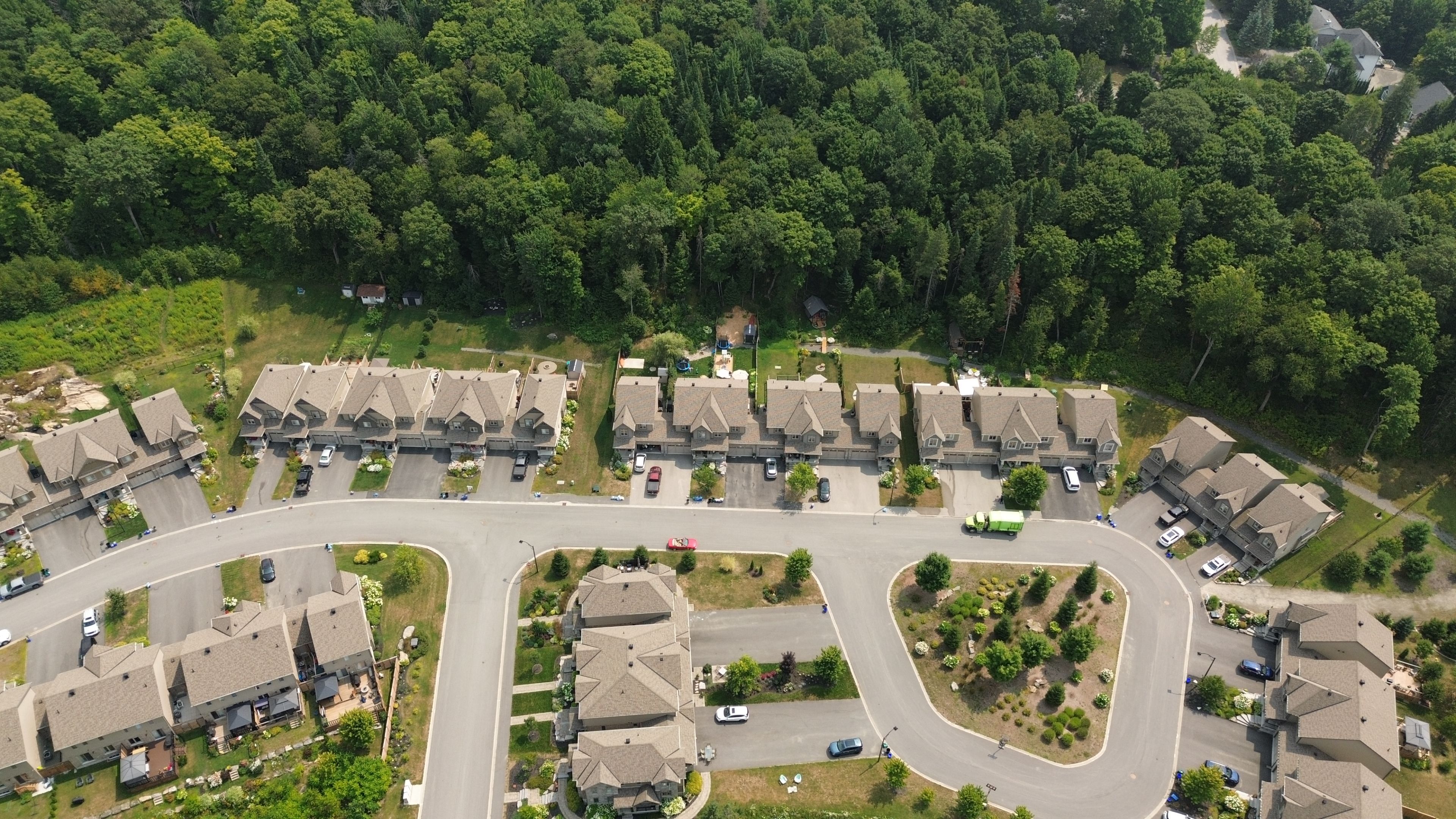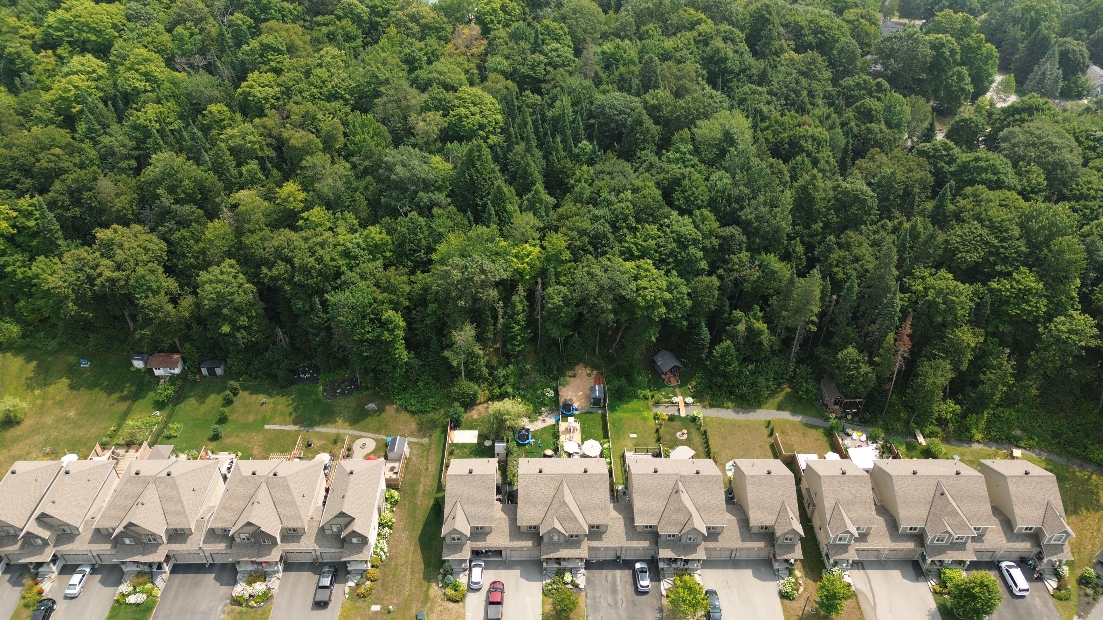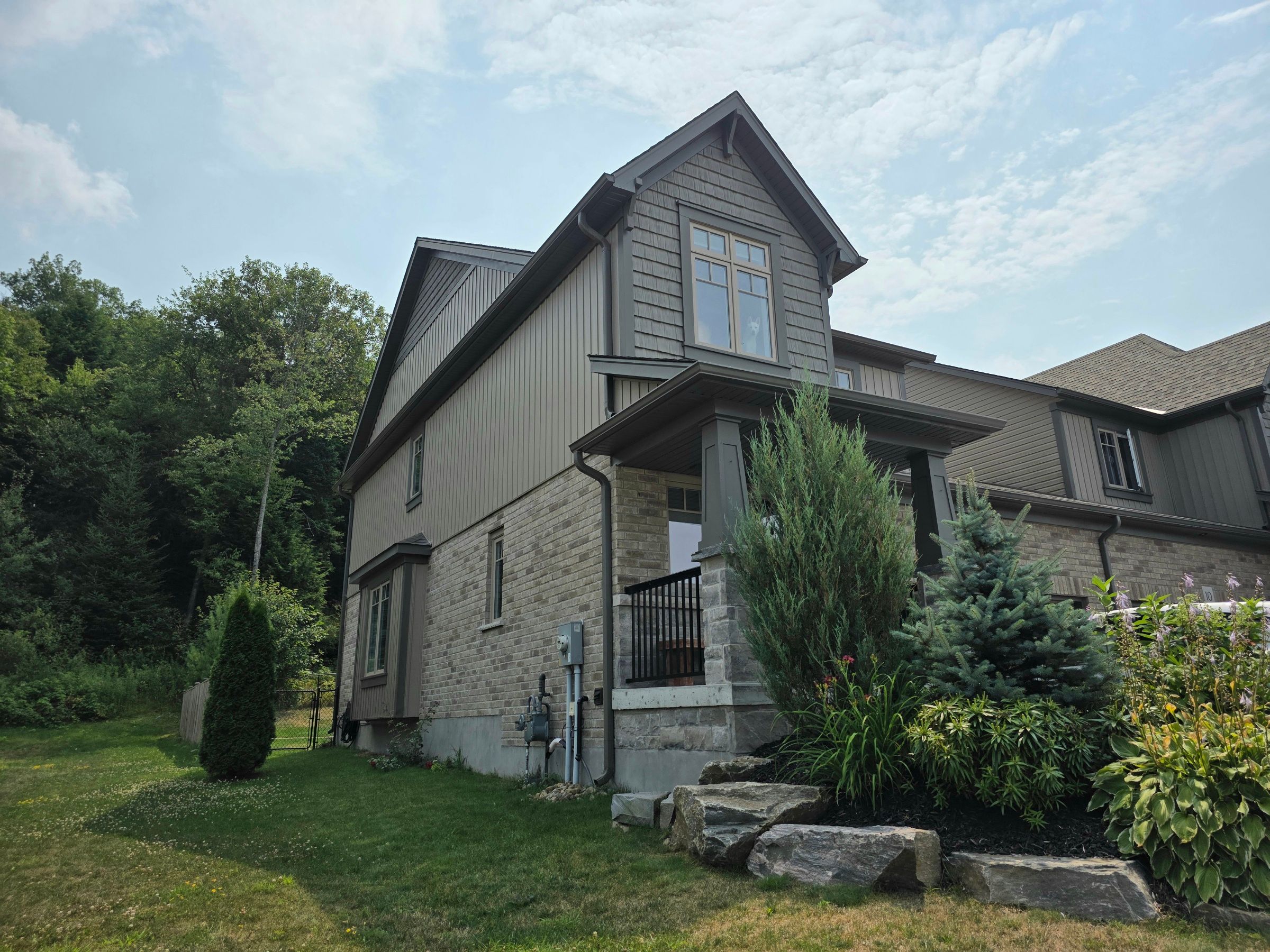 Backing onto peaceful, town-owned green space, this brookside crossing end-unit townhouse offers a rare combination of privacy, style, and convenience. From here, you're just minutes from the hospital, elementary school, playground, huntsville downs golf club, and the breathtaking arrowhead provincial park. Downtown huntsville's shops, dining, and attractions are also within easy reach - making this a home that's perfectly placed for both relaxation and activity. The curb appeal is timeless, with a neutral blend of stone, brick, and vinyl siding. Step inside to discover a bright, airy interior that feels almost like a detached home, thanks to a thoughtful design that shares only a garage wall with the neighbour. The open-concept main floor is ideal for modern living. At its heart, a rich dark wood kitchen features a large island for meal prep, a breakfast bar for casual dining, and ample storage. The living room's sliding glass doors open to a fully fenced backyard complete with a deck and natural gas bbq hook-up - perfect for outdoor entertaining. A welcoming foyer, two-piece powder room, and inside access to the garage add everyday convenience. Upstairs, the primary suite offers a walk-in closet and private four-piece ensuite. Two additional bedrooms share a bright five-piece bathroom, while the mostly finished basement expands your living space with a fourth bedroom, it's own three-piece ensuite, and a dedicated laundry area. Modern comforts are built in, including natural gas forced air heating, central air conditioning, municipal water and sewer, high-speed internet, and curbside waste and recycling pickup. No condo fees, a tranquil setting, and a home designed for both comfort and connection this is an opportunity not to be missed.