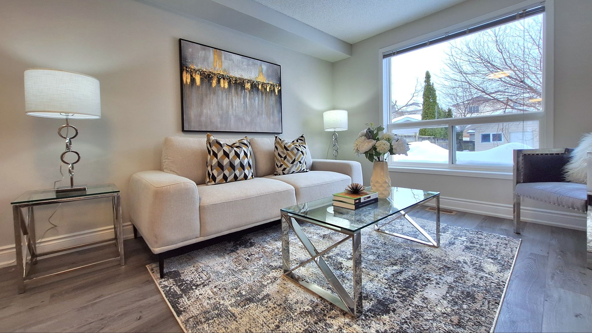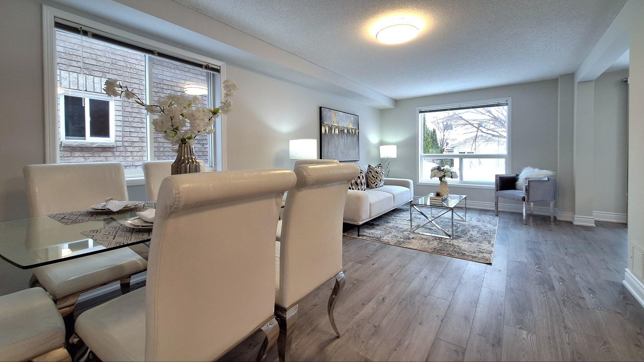 • Spacious open-concept layout with a modern kitchen and stainless steel appliances.