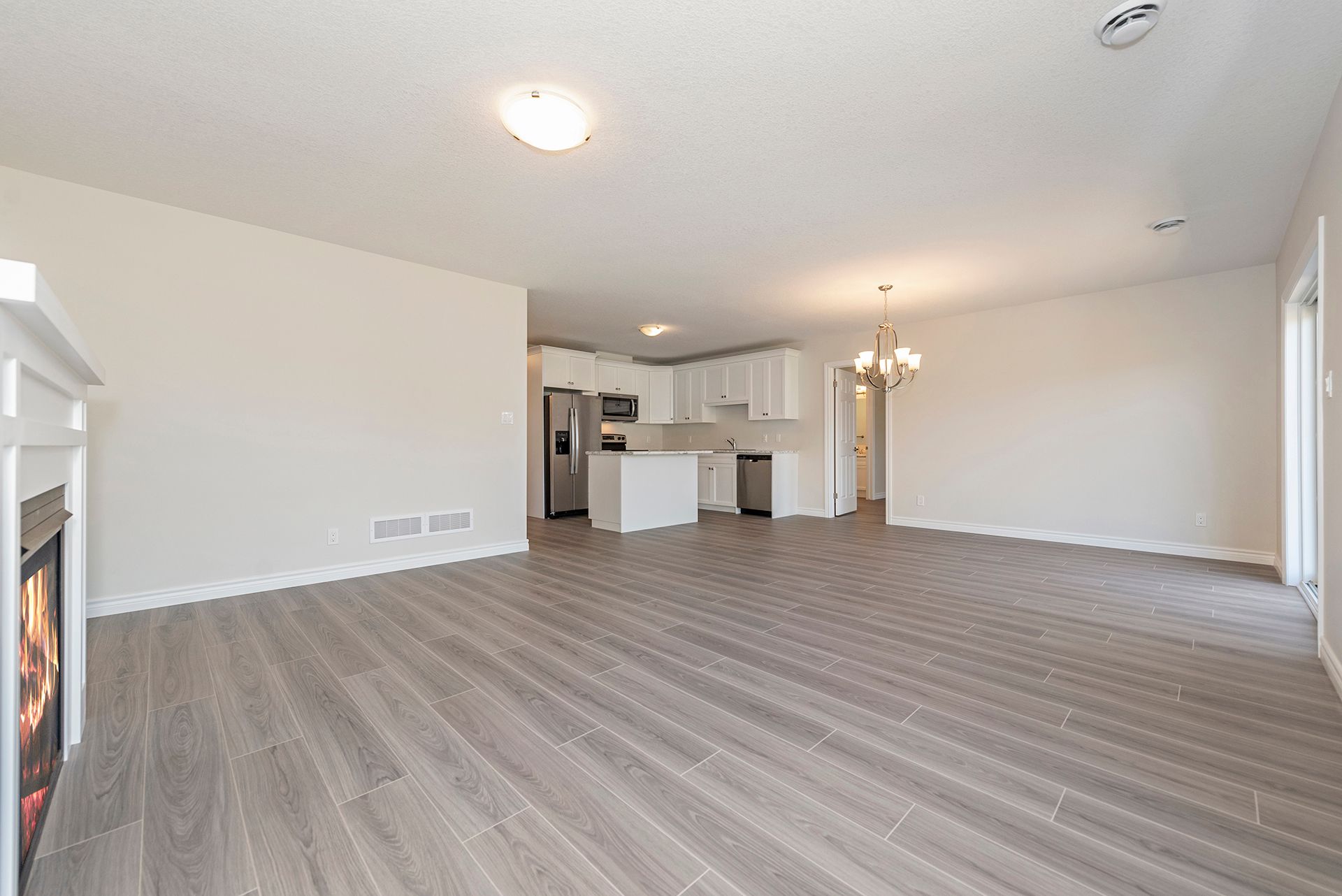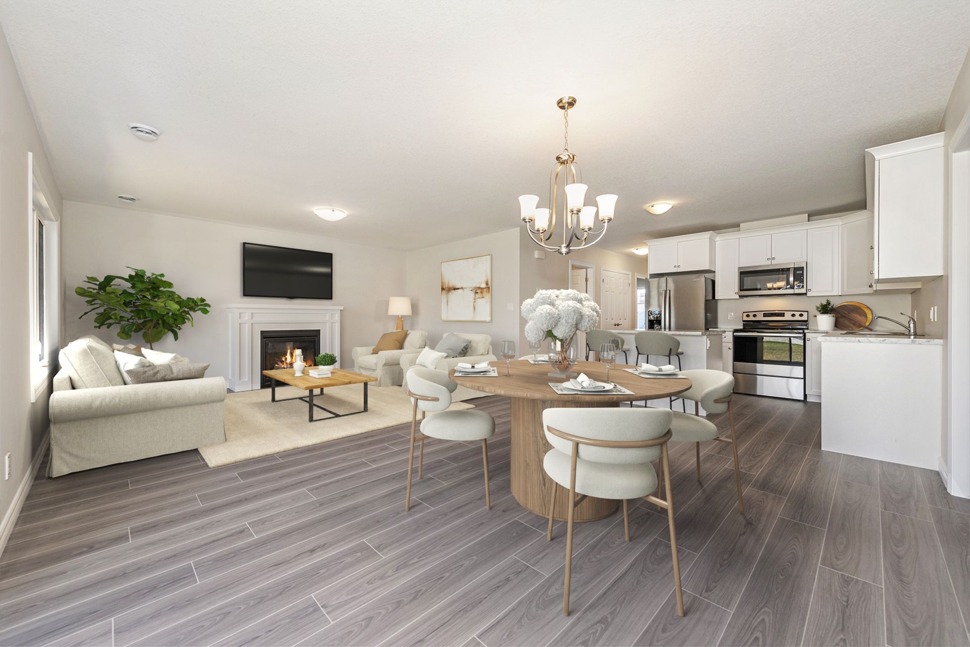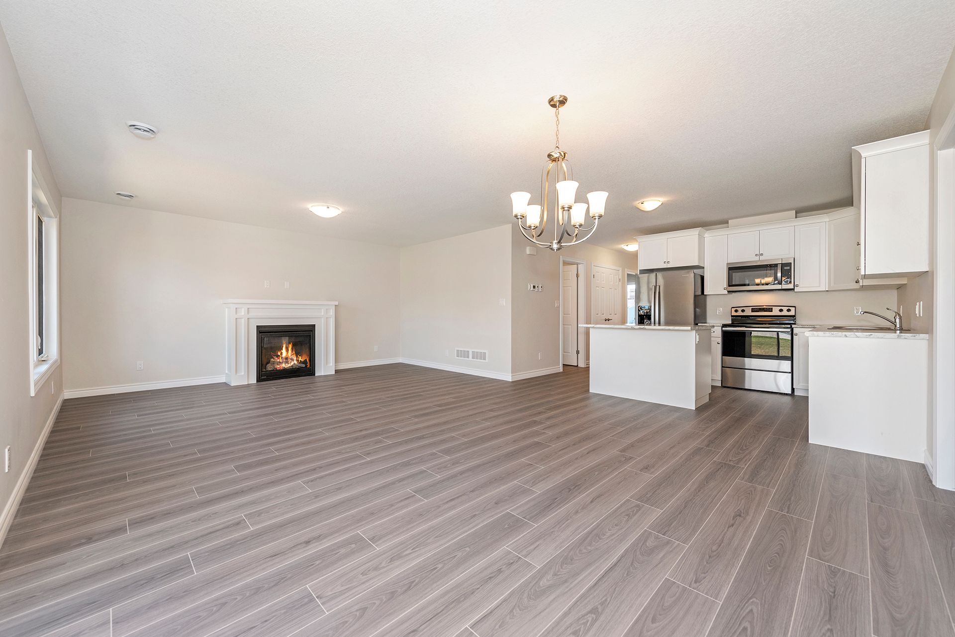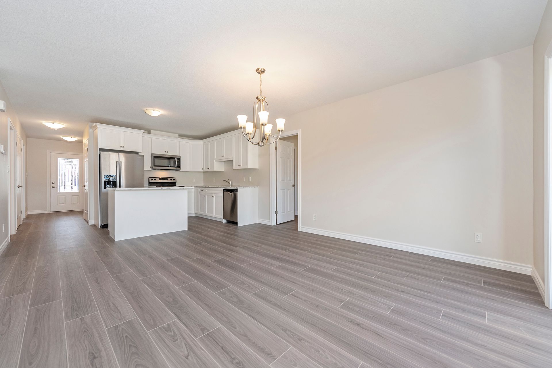 • Open concept living space with modern kitchen featuring stainless steel appliances.
