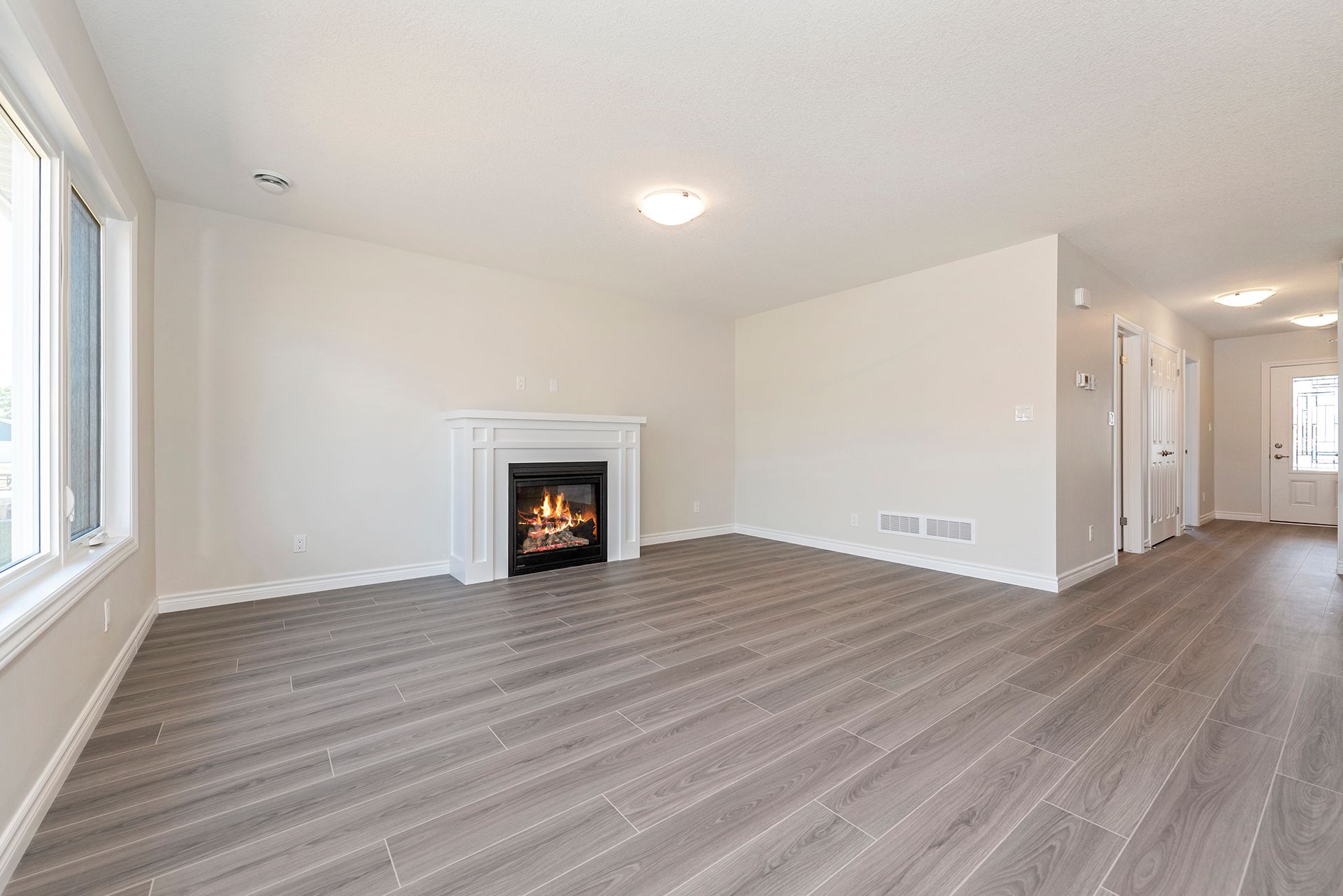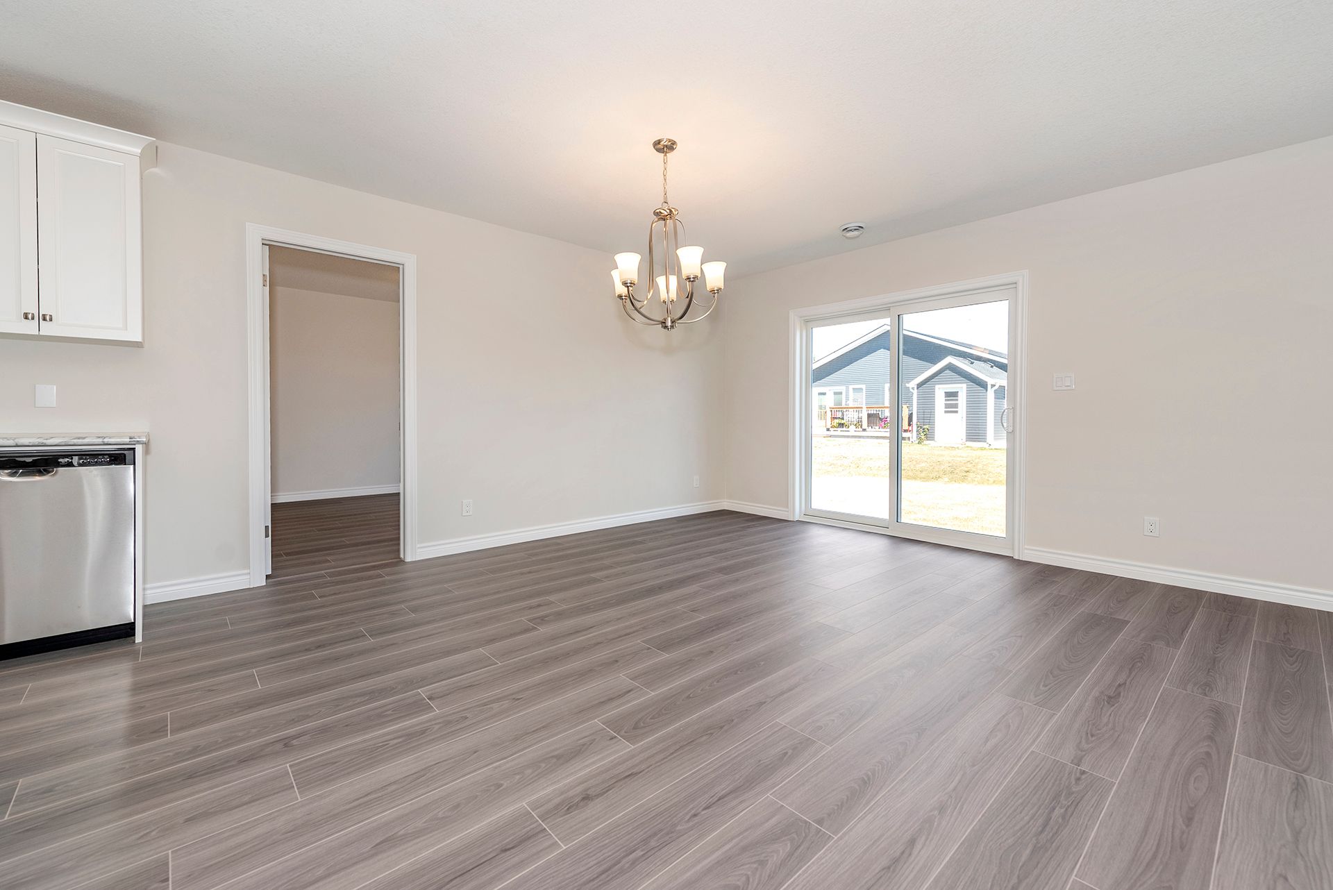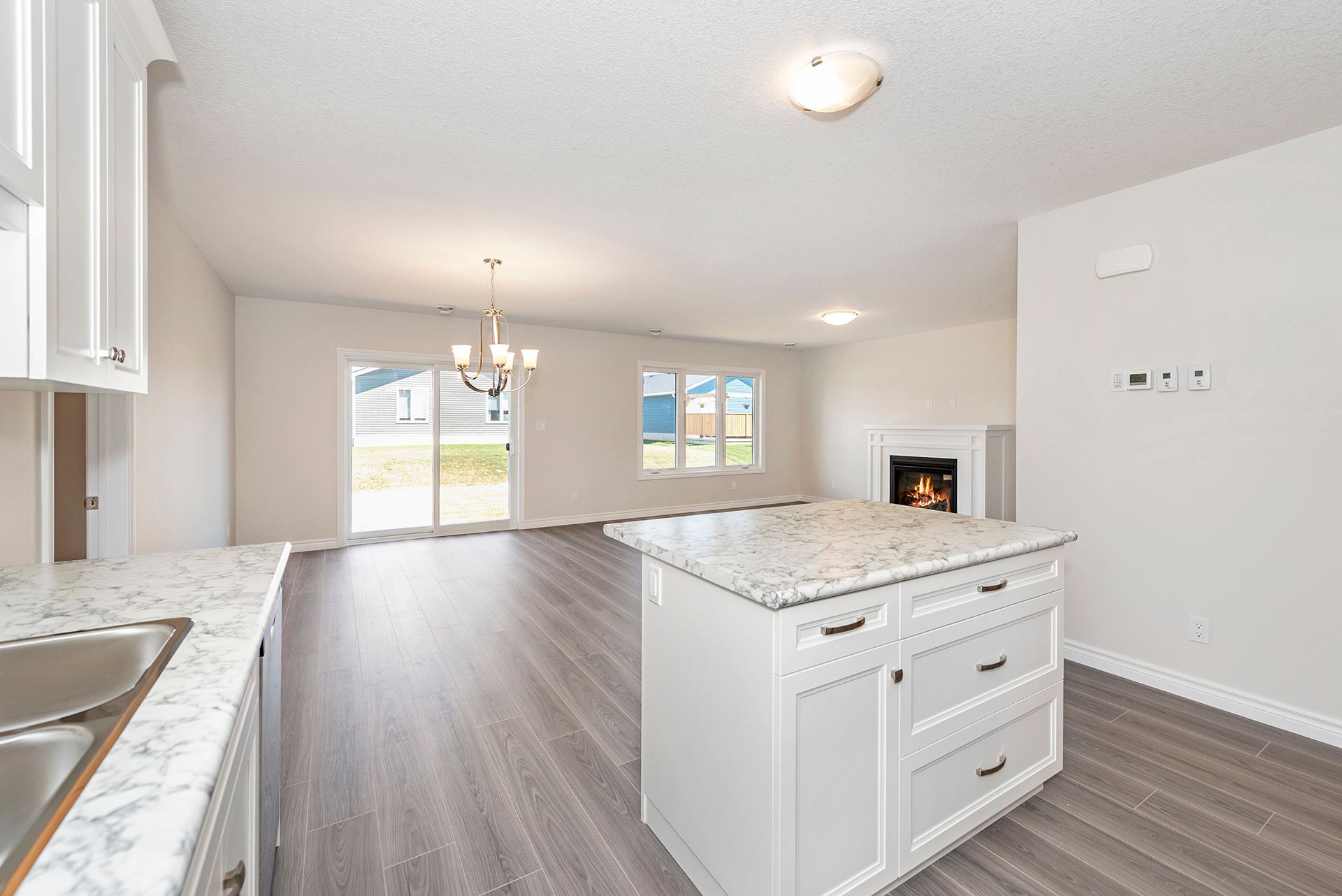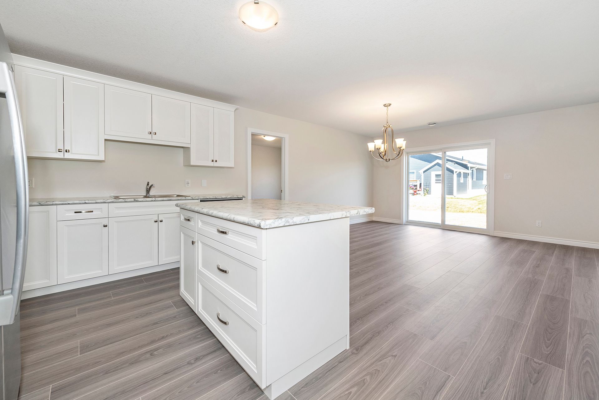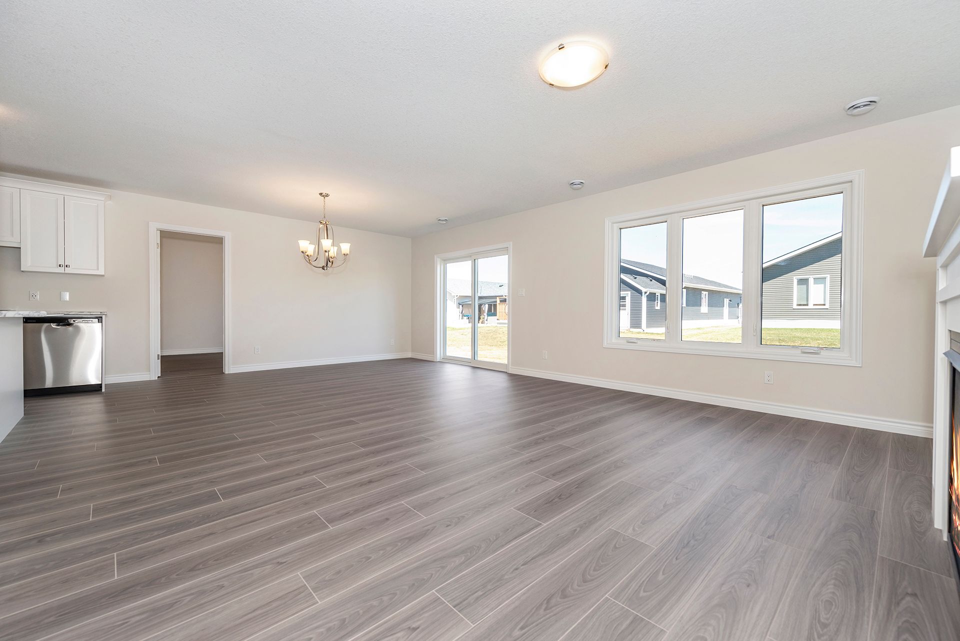 • Open concept living space with modern kitchen featuring stainless steel appliances.