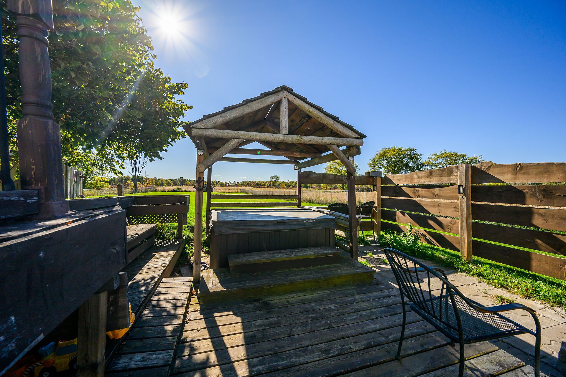 • Entertainment-ready backyard with two-tiered deck and hot tub.