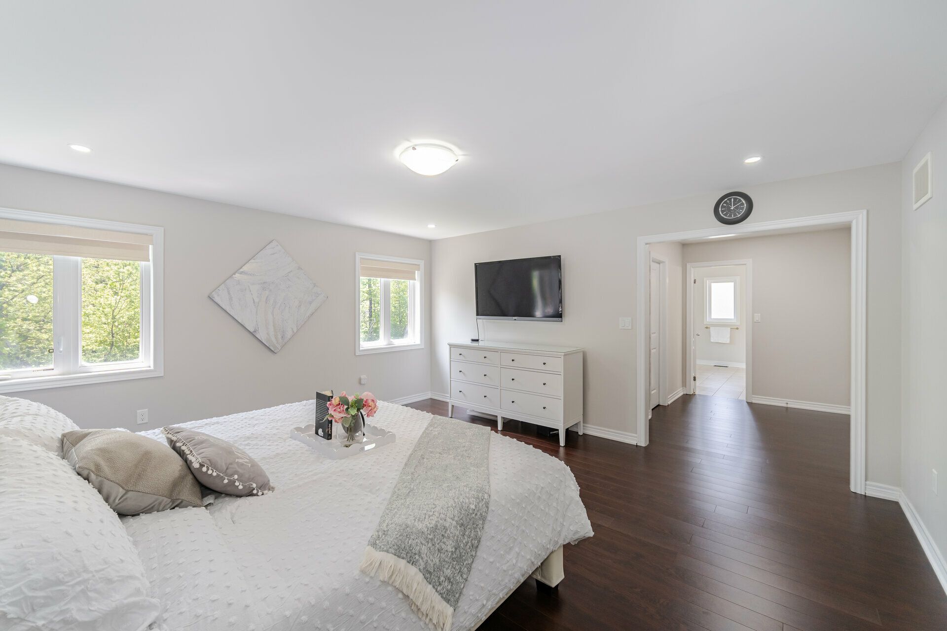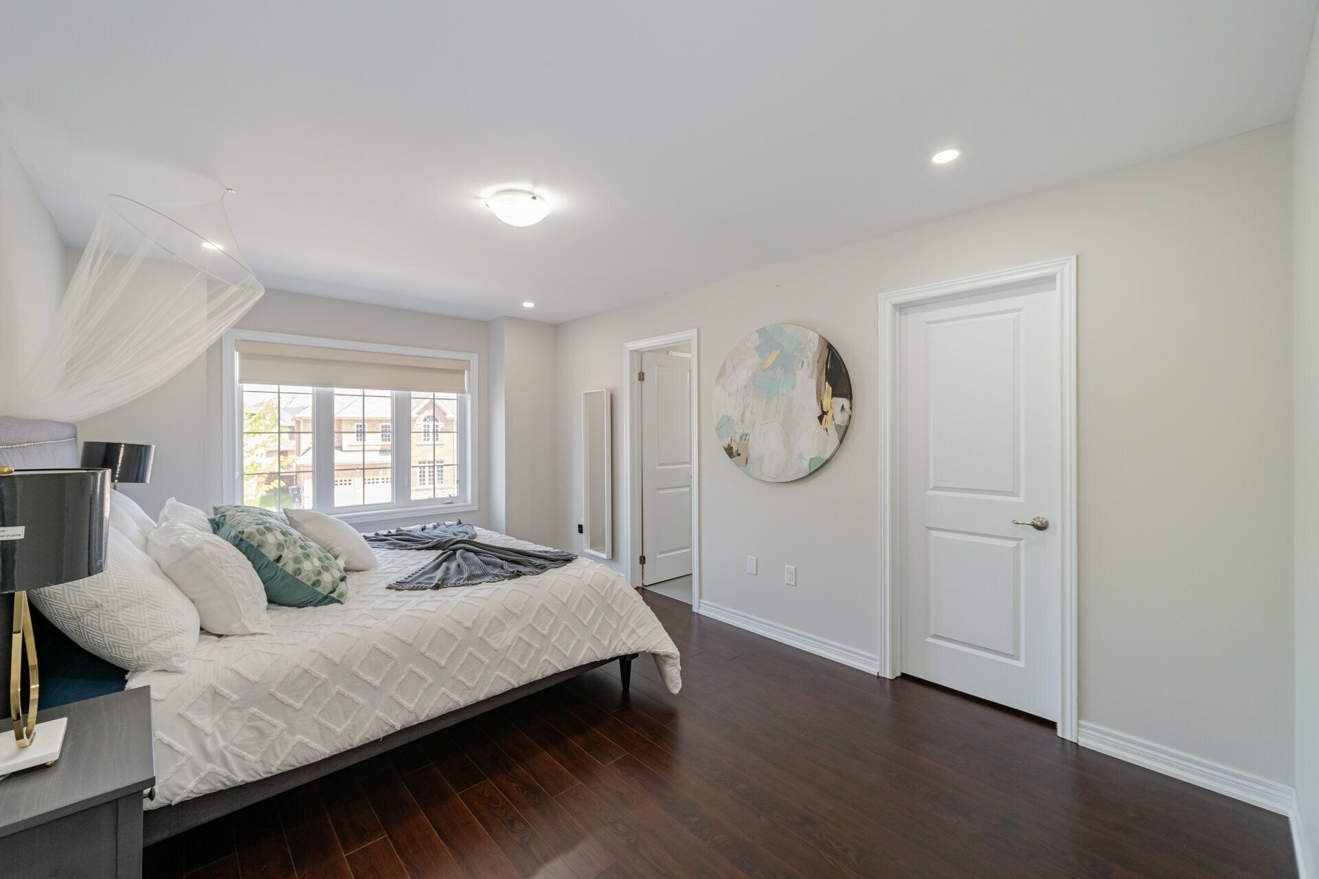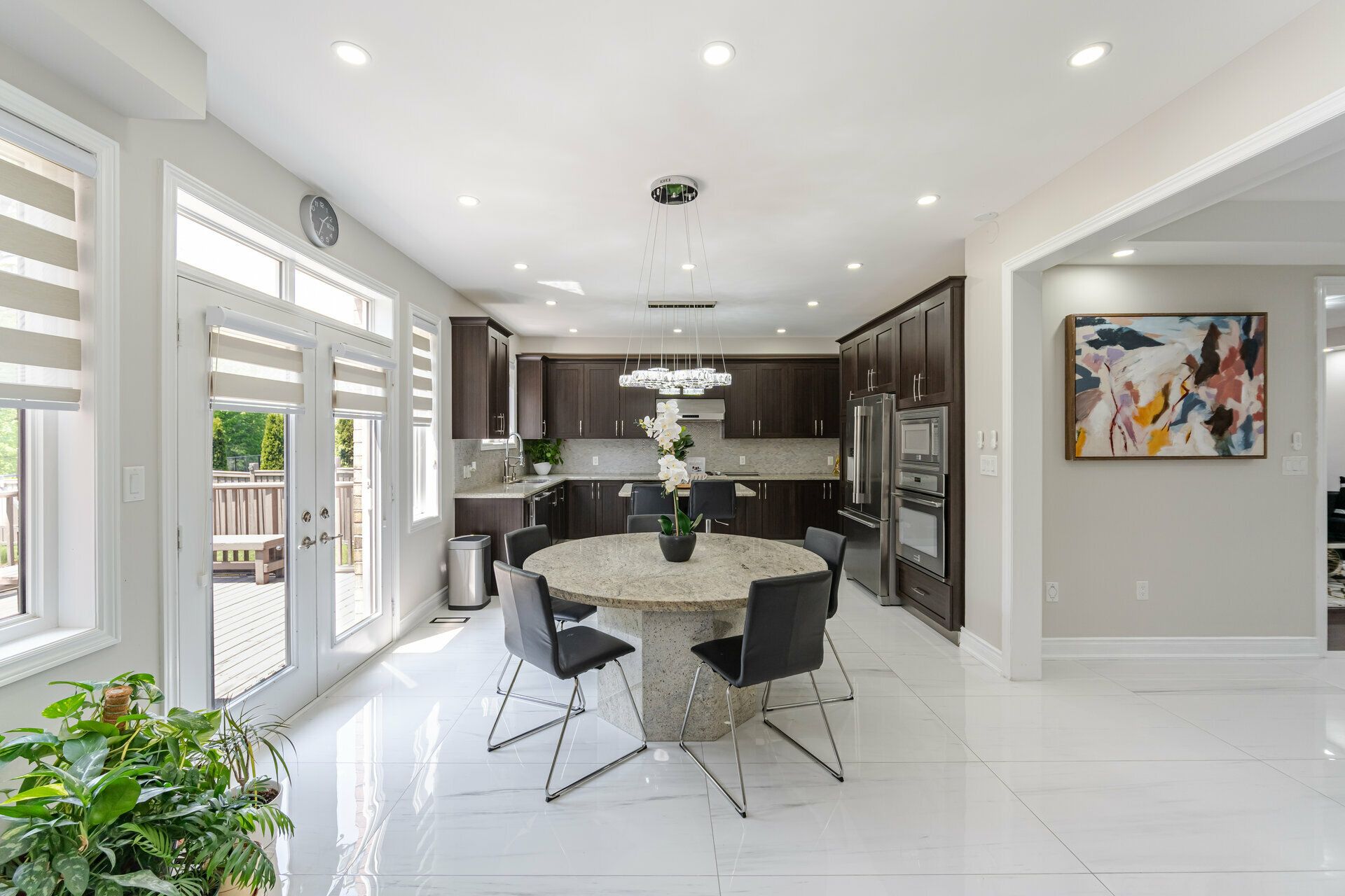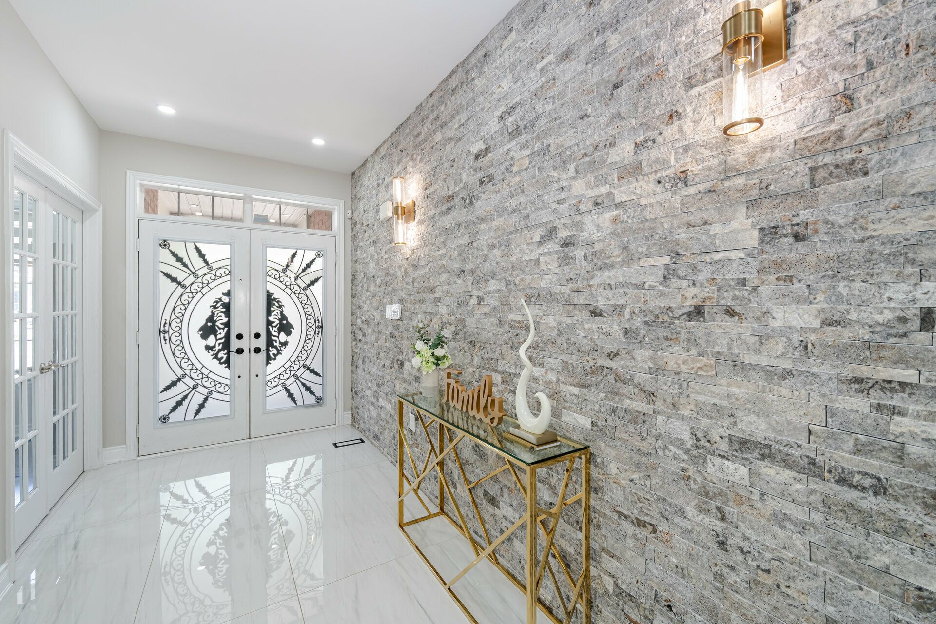 • Welcoming foyer with stylish porcelain tiles and a chic dining accent wall.