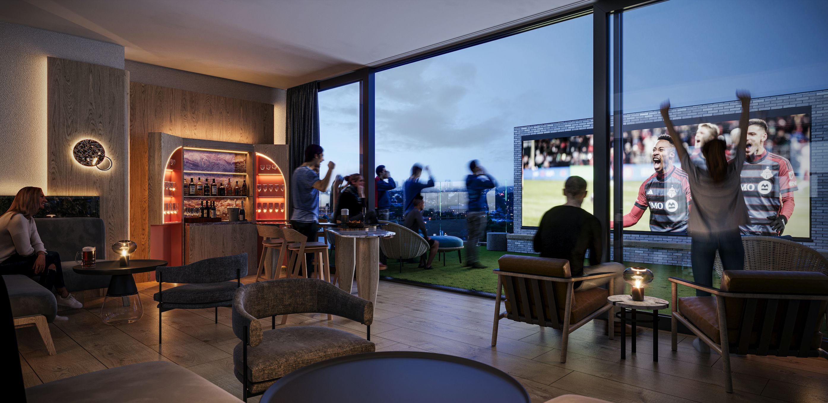 • Impressive rooftop amenities include kitchens, lounge, theatres, and pickleball court.