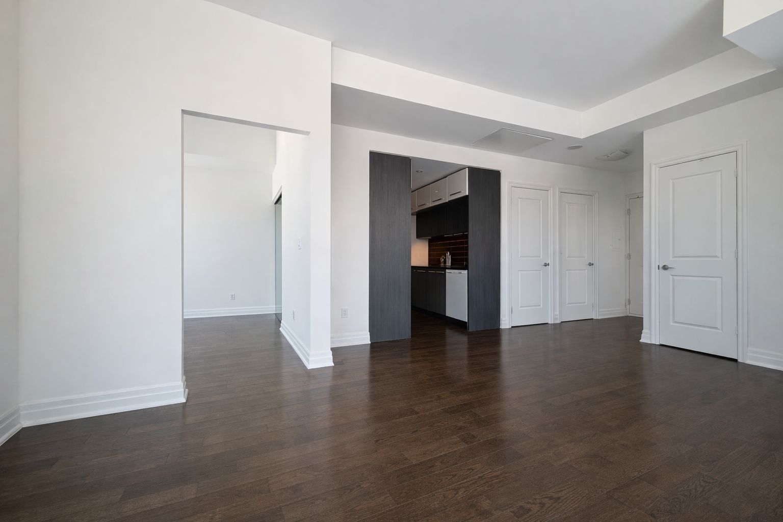 • Open-concept layout with high ceilings and modern kitchen appliances.