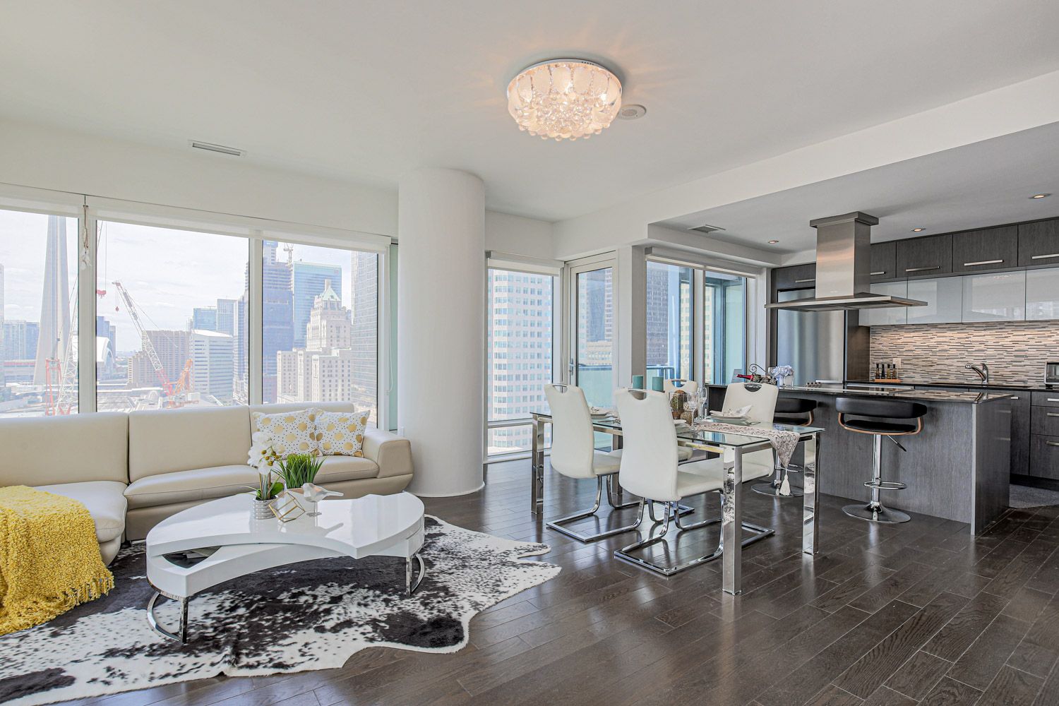 Spectacular 20th floor southwest corner unit at the l tower. Wood floor throughout; good layout combine with living 6 dining and separate kitchen area. Modern kitchen with stainless steel appliances. Open concept 9 feet ceiling, with floor to ceiling windows, rarely offered south west facing unit features open concept 9 feet ceiling heded flrs, functional layout with 2 split bedrooms with more privacy both with gorgeous views, master bedroom has 2 closets. The heart of downtown - core/financial district, 5 minutes to union station, 2 min to dvp, scotiabank arena & st lawrence market