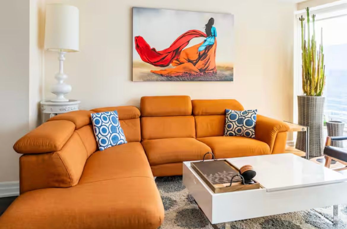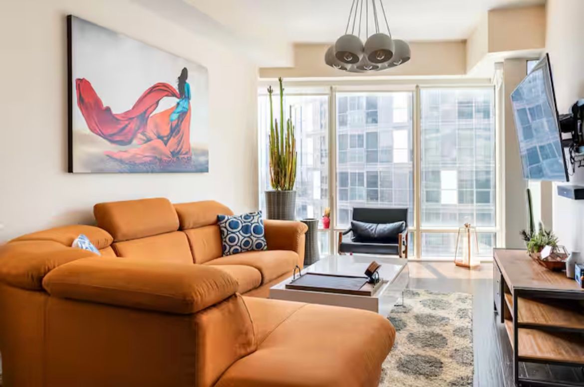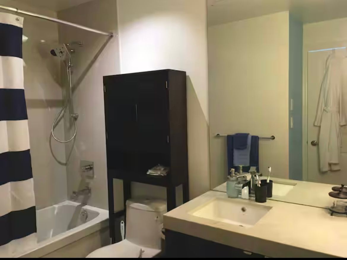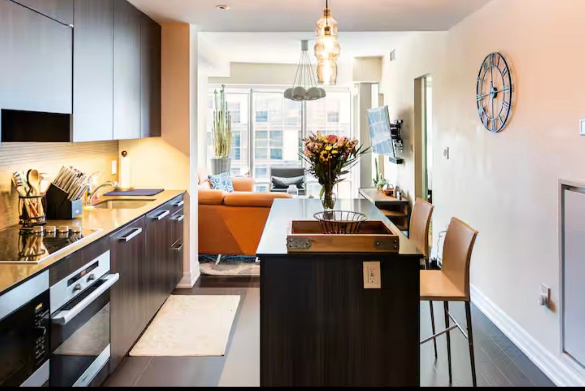 Modern, luxurious & fully furnished condo in heart of downtown toronto at l-tower. Steps away from union station, st. Lawrence market, the waterfront and berczy park you are walking distance from everything at this location. Surrounded by restaurants, pubs, grocery, pharmacies & coffee shops on all sides you will be spoiled for choice on where to go next. Impossible to be bored with tiff, the flat iron, rogers centre minutes away! This luxury building and unit is perfect for the working professional in town on business. The space has a queen size bed, two full baths, full kitchen and a den that can be used for a workspace. The condo has been equipped to be a home away from home with all the everyday necessities you will need. This includes a variety of coffee and tea, cleaning supplies, basic toiletries and cleaning supplies. There is a nespresso machine & keurig with coffee and hot chocolate pods. Ensuite washer and dryer. A balcony with a great view. Lots of plugs throughout the condo that also have usb ports. Lights have dimmers on them. The bed has a mattress pad than can be taken off at your comfort and convenience for a firmer or softer nights sleep. The coffee table top also pulls up to meet you at chest level to eat or work on. A full gym with a yoga room, sauna and pool available on second floor. The pool has a skylight and loungers so you feel like you're outdoors! Though we're in the heart of downtown it is exceptionally quiet in the unit **extras** fully furnished with cleaning service available(wifi + hydro + parking/locker negotiable)