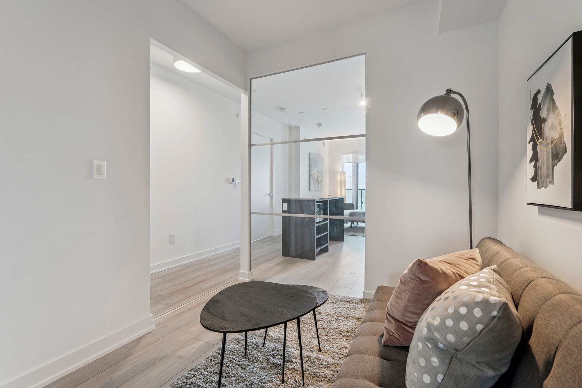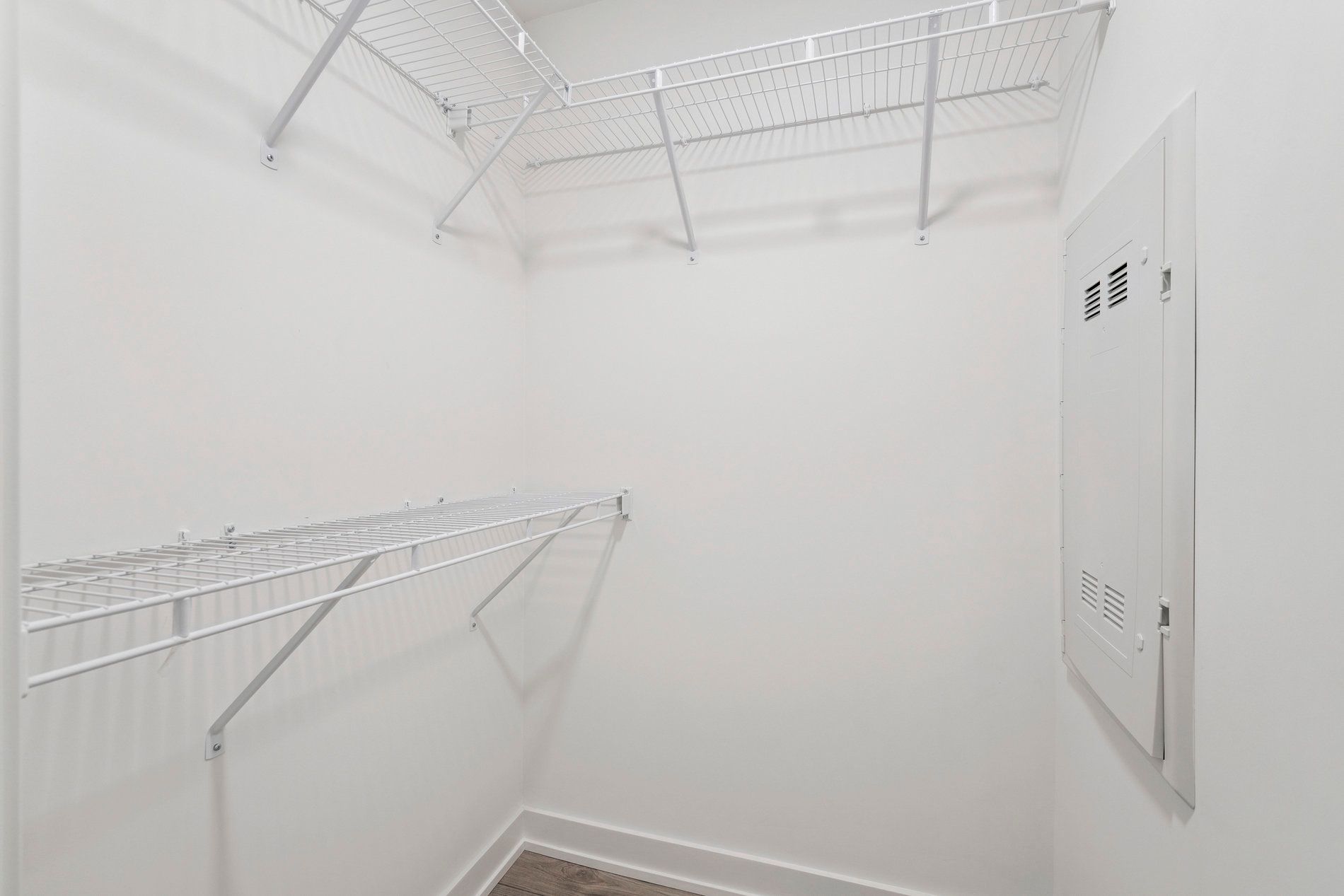 • Pristine suite with wide plank flooring and installed window blinds.