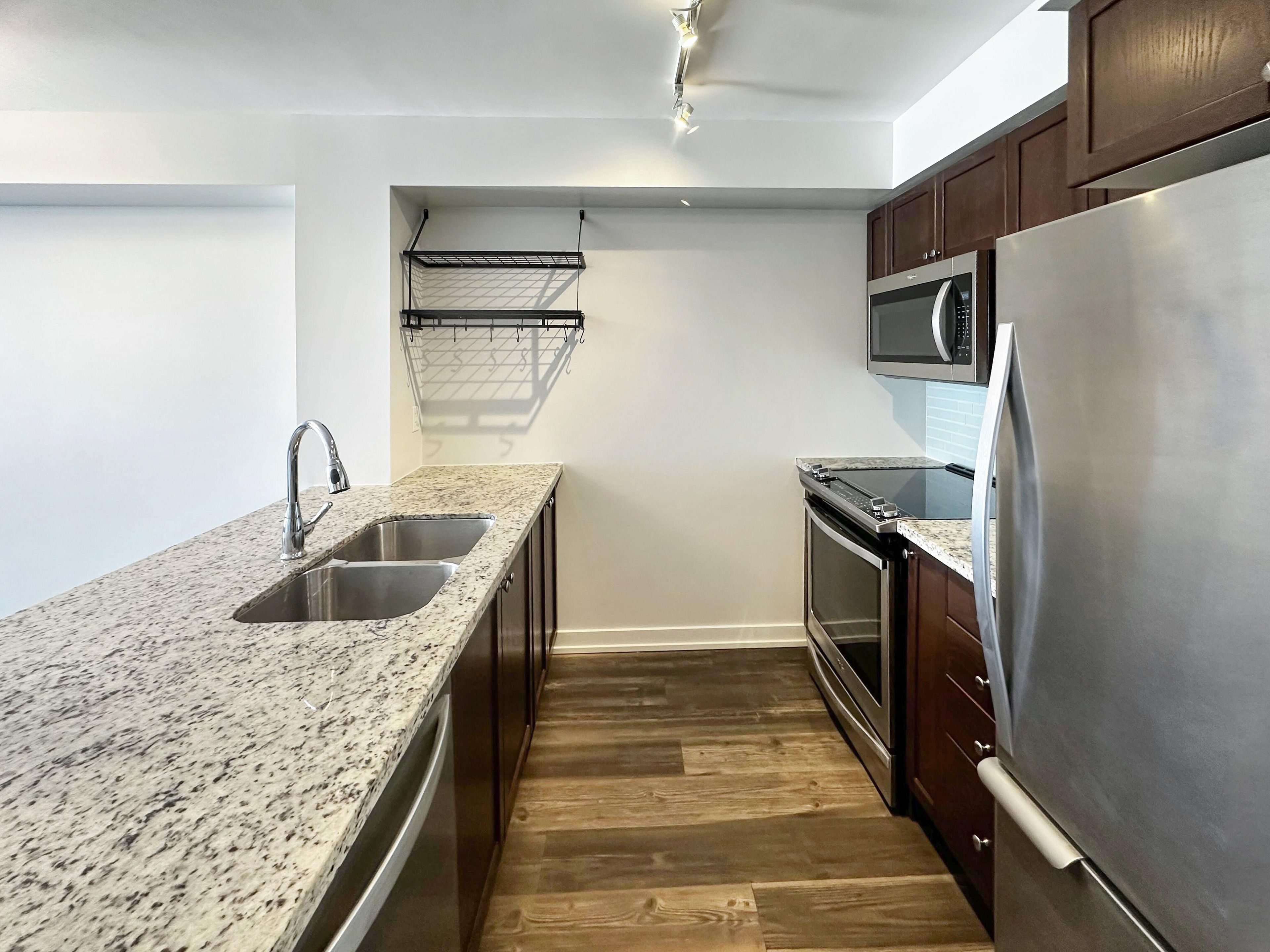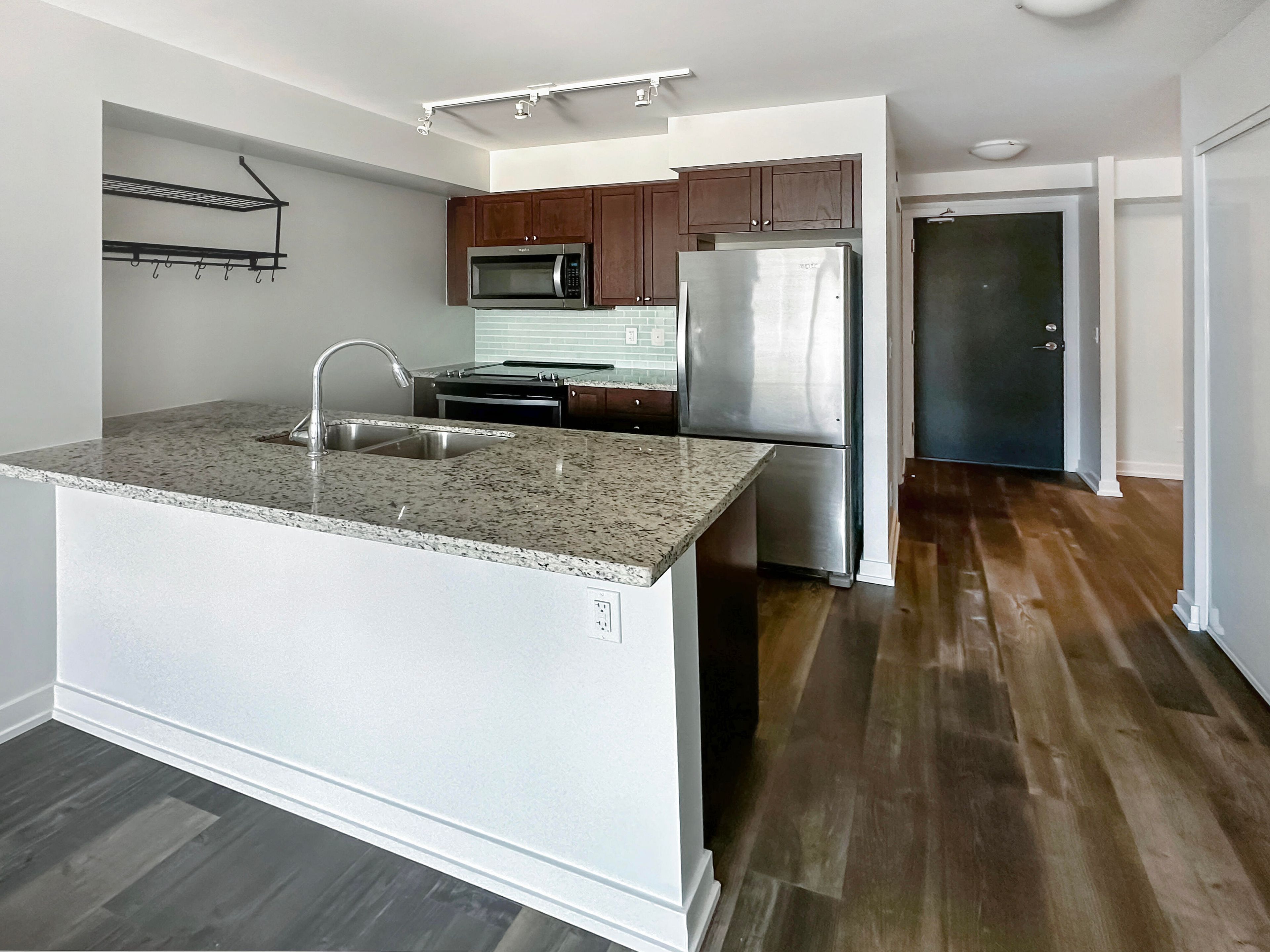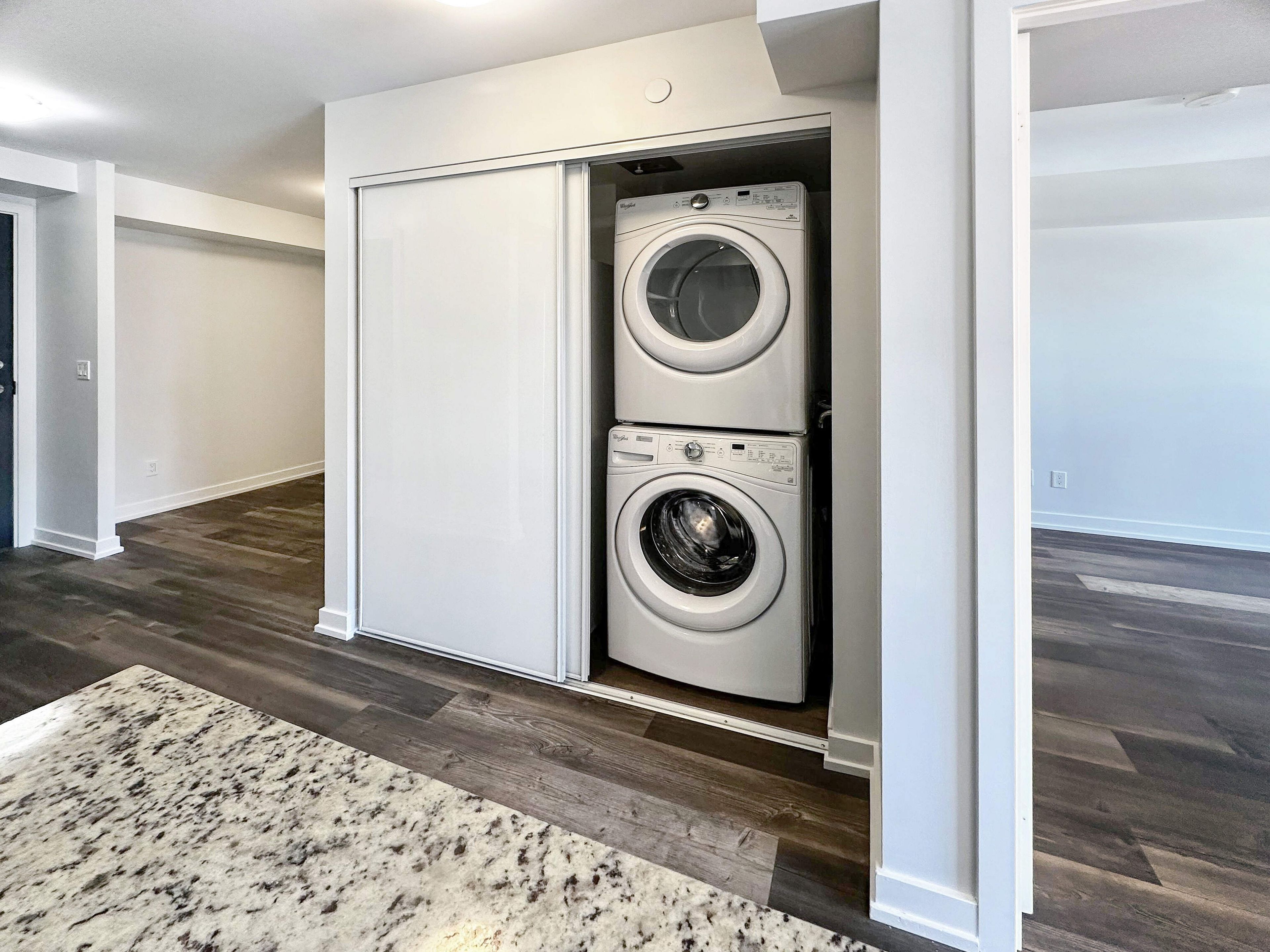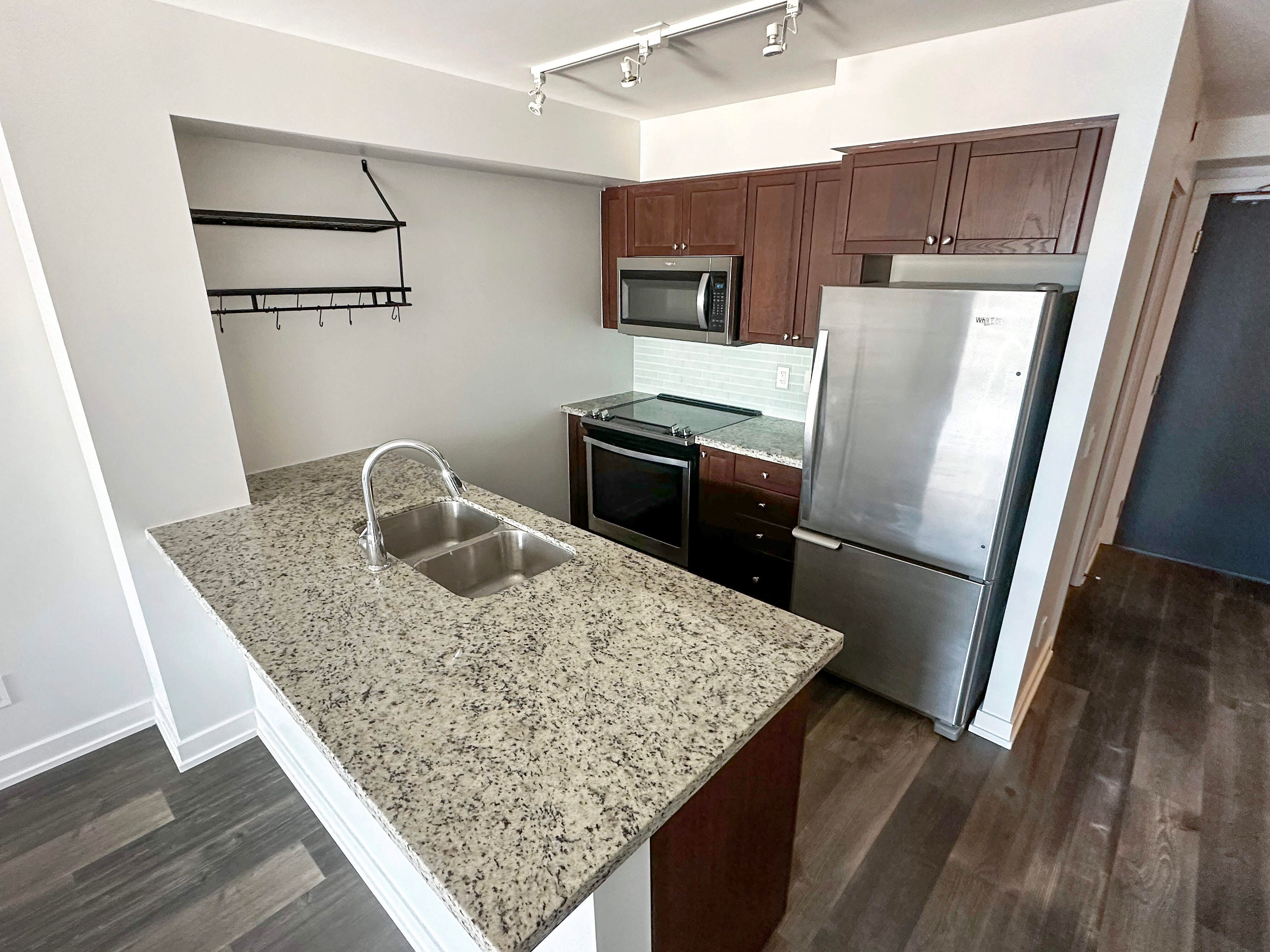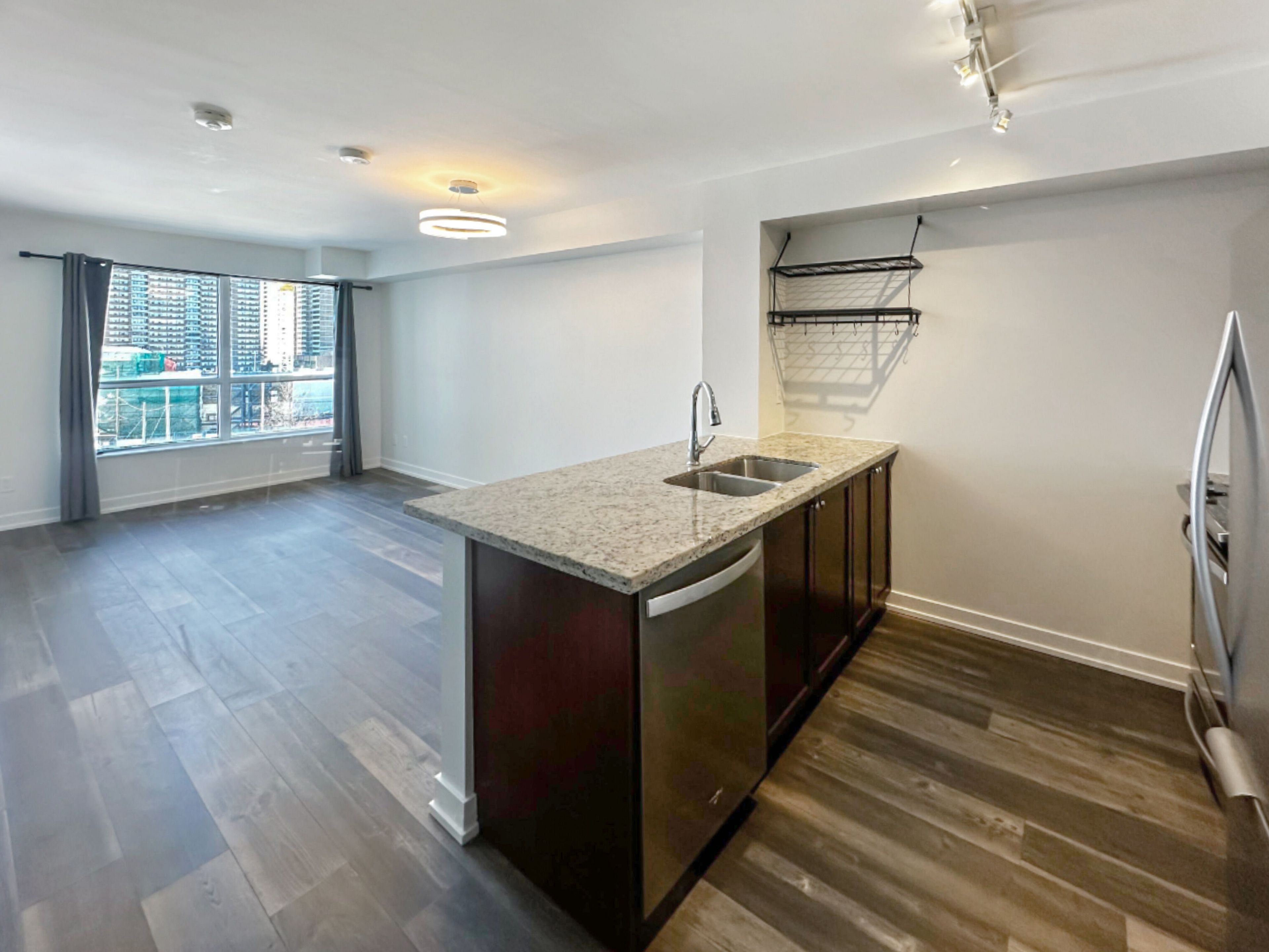 Live at main station condos in the heart of danforth village, a walkable neighbourhood with a strong sense of community where everything you need is just steps away. Grab groceries across the street at shoppers world plaza (metro, shoppers drug mart, and more), hop on the ttc at main station in 5 minutes or catch the danforth go in under 10 for an easy commute downtown. Spend weekends exploring the danforth's diverse mix of eateries, cafés, bakeries, and local favourites like double sushi, anima romana bakery, and red tape brewery, or catch a show at the new comedy club just across the street. For a quieter pace, unwind with a walk or bike ride along nearby taylor creek trails and off-leash parks. At home, enjoy access to a gym, rooftop terrace with bbqs, party room, and meeting space, extending your living beyond your front door. This bright and stylish 1+den offers 618 sq ft plus a west-facing balcony with open city views and sunset skies. Inside, you'll find a modern kitchen with stainless steel appliances and granite counters, luxury vinyl plank flooring throughout, and floor-to-ceiling windows that bring in natural light. The den adds flexibility for a home office, dining area, or guest space. A 4-piece bath and in-suite laundry complete the interior. This unit includes one underground parking space and a storage locker for your exclusive use, conveniently located right beside each other, making loading and unloading simple. Rent is $2,300/month and includes water, underground parking, reserved bike storage, and your private locker - offering exceptional value compared to similar units without these features.