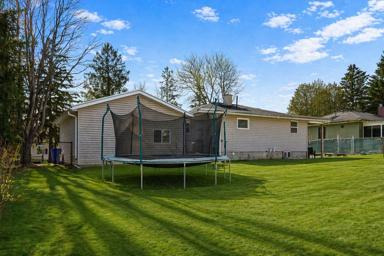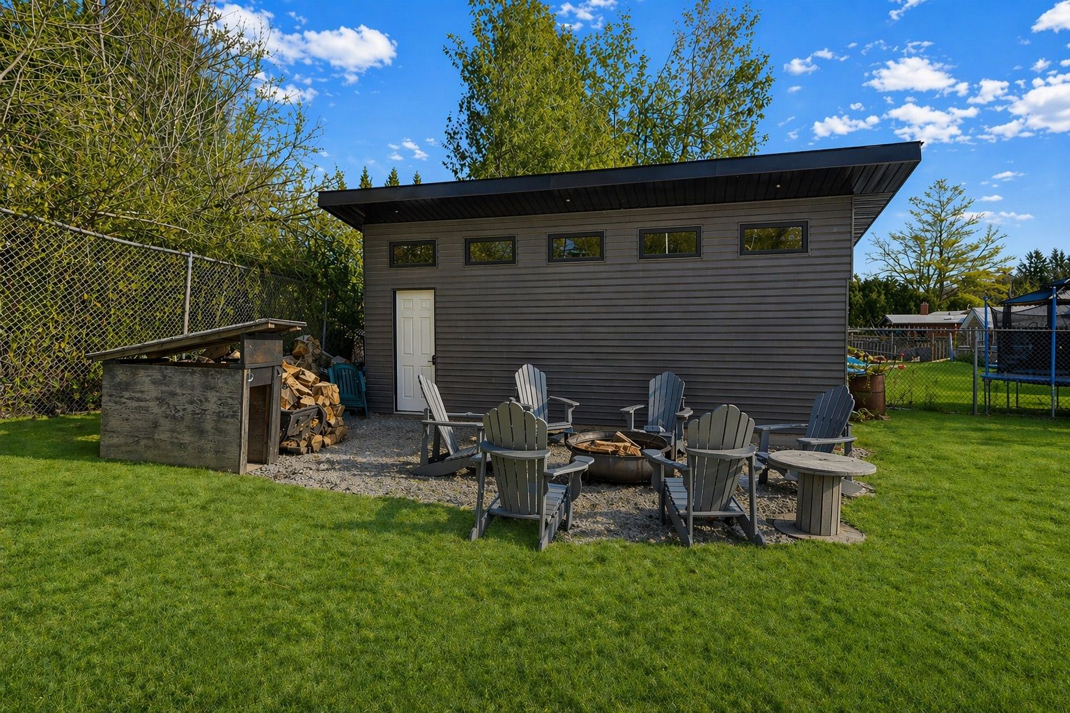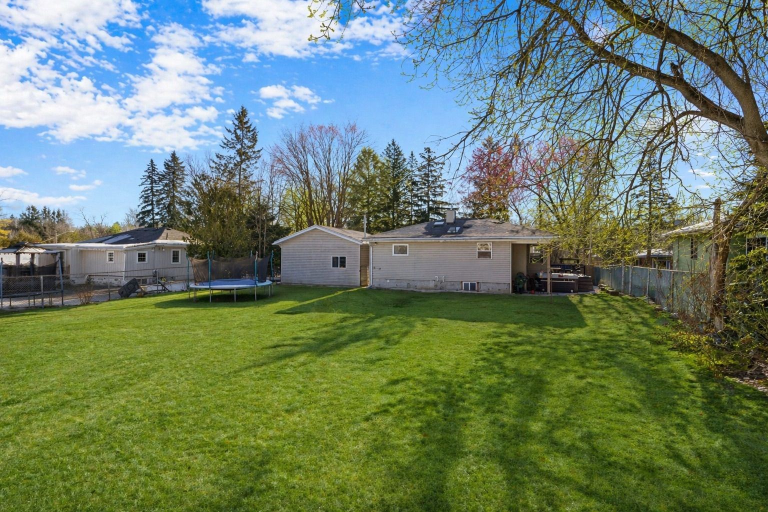 • Spacious fenced backyard with composite deck, hot tub, and firepit area.