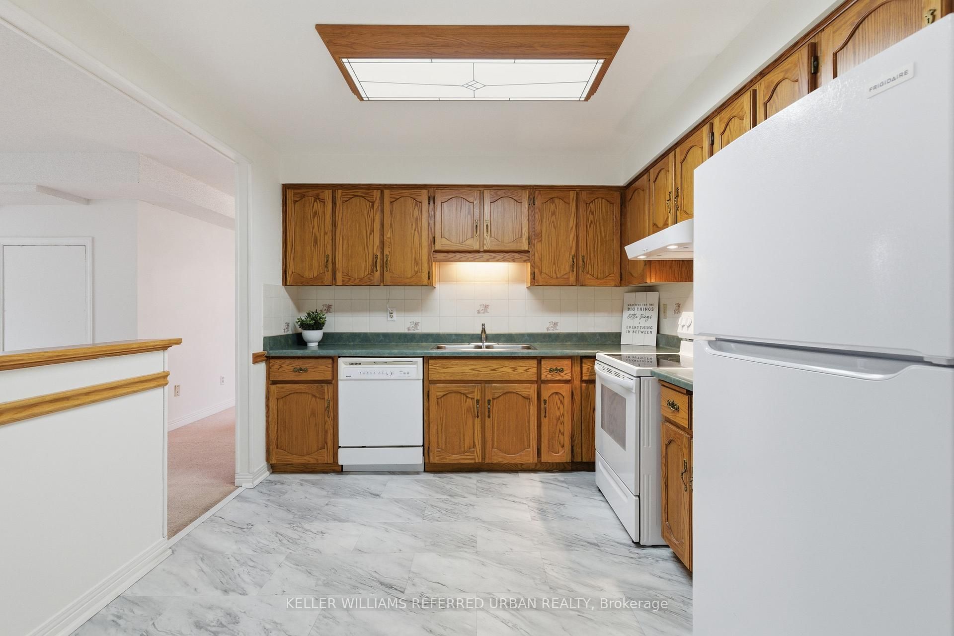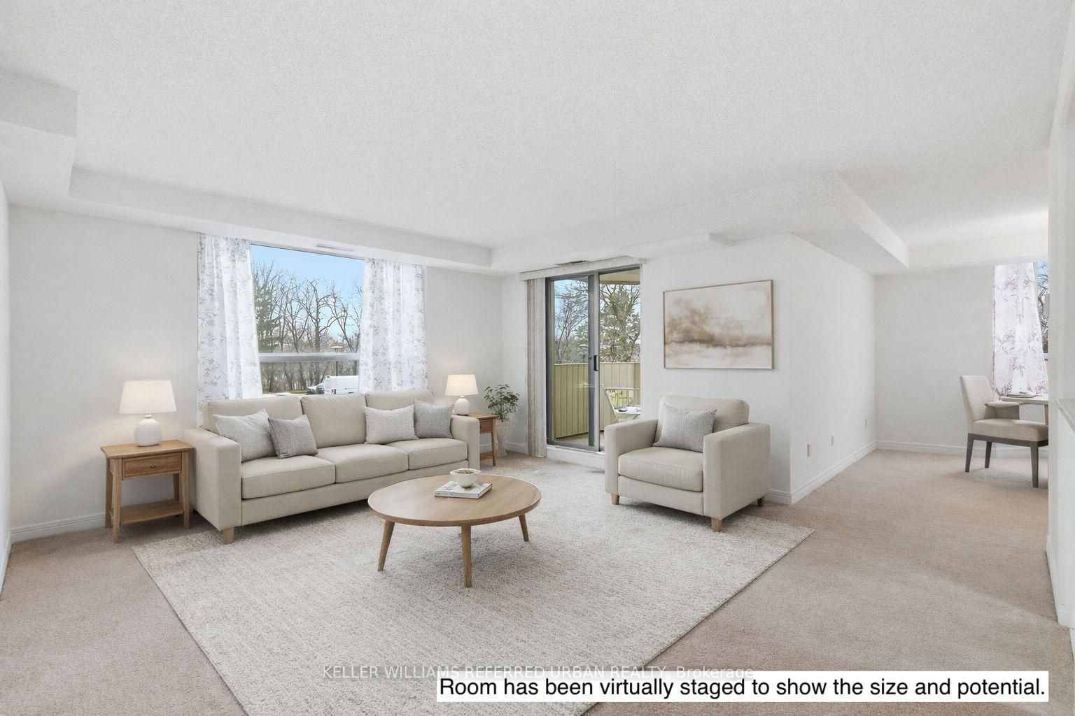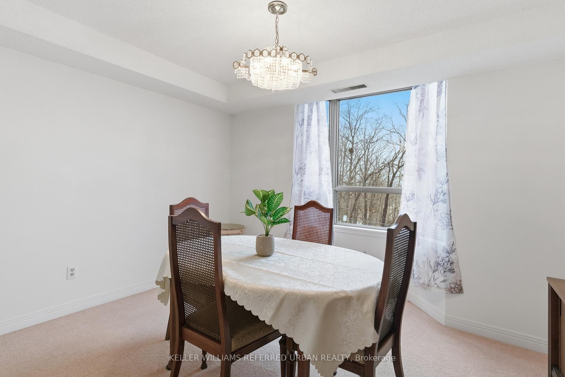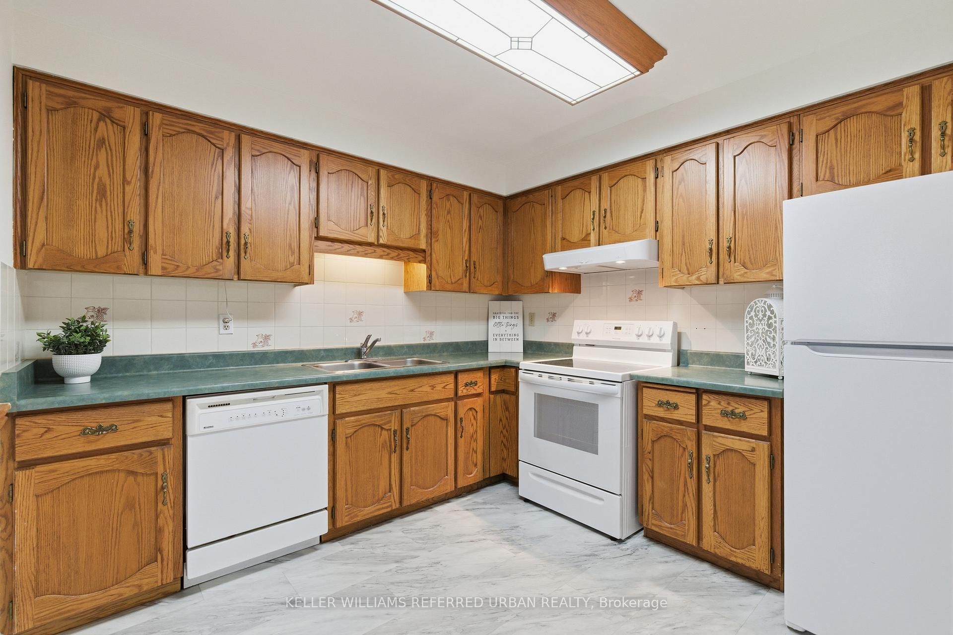 Welcome to 8 village green, stoney creek, located in stoney creek's historic and charming downtown king street area with quaint shops and restaurants. This well-maintained condominium apartment offers comfortable and spacious living (approx. 1200 sf) in a desirable, wellmanaged community, popular with seniors and downsizers. Featuring 2 oversized bedrooms and 2 full bathrooms, a separate dining room for entertaining, and a bright and roomy living area with walk-out to a private balcony large enough for a patio set: this home is ideal for relaxed everyday living and great for someone who wants a smaller space and no snow to shovel! Residents enjoy excellent building amenities including a workshop, library, exercise room, and party room with kitchen area. Convenient underground parking spot right near the elevator entry. Located close to shopping, parks, transit, major highway access, centennial parkway, the battlefield house and park, devil's punchbowl and waterfall, and the bruce trail . The suite overlooks the back of the building where there is serene greenspace and trees for privacy. Absolutely ideal for downsizers who still want space and a separate dining area, first-time buyers who want a large condo, or anyone seeking lowmaintenance, easy and enjoyable condo living. Lovingly cared for and maintained the condo has been freshly painted with new modern laminate floors in the hallways (2026).