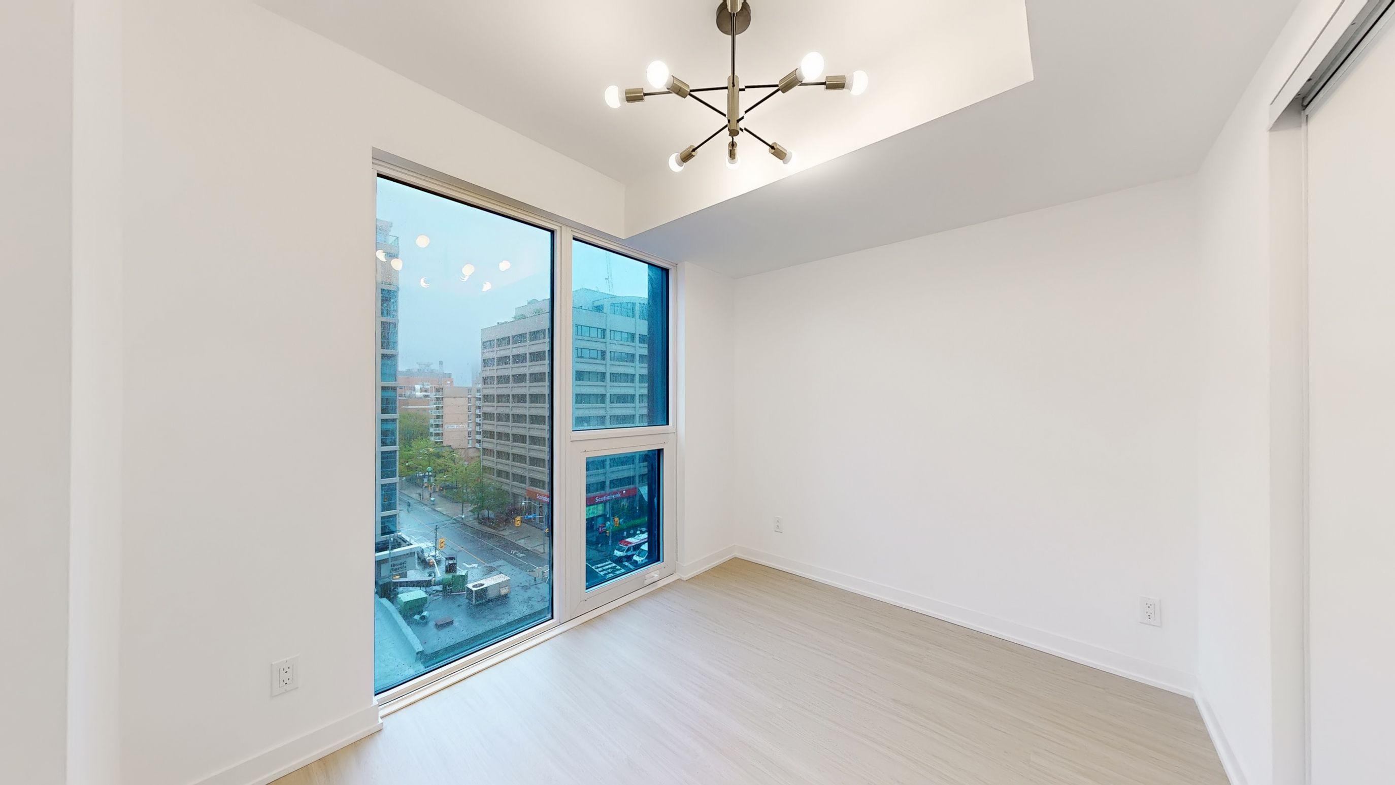 • Floor-to-ceiling windows flood the space with natural light.