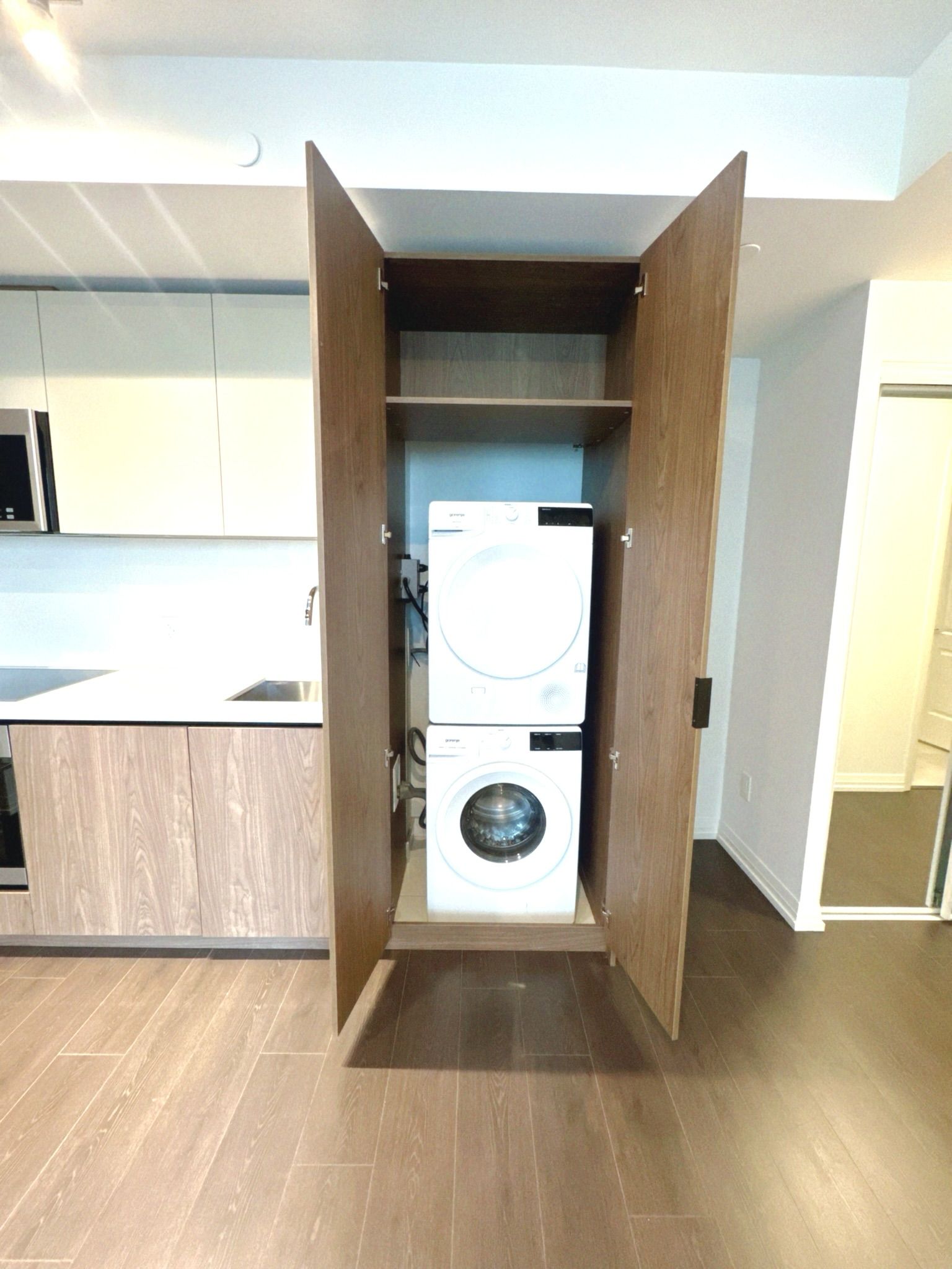 Exceptional rental opportunity on the 47th floor of the theatre district condos. This immaculate 2-bedroom, 2-bathroom suite offers a premium urban living experience with spectacular west-facing sunset views. The modern layout features floor-to-ceiling windows, high-quality laminate flooring, and a sleek kitchen with built-in appliances and quartz countertops. Perfect for professionals, this location boasts a near-perfect walk score-steps to st. Andrew station, the financial district, and king west dining.