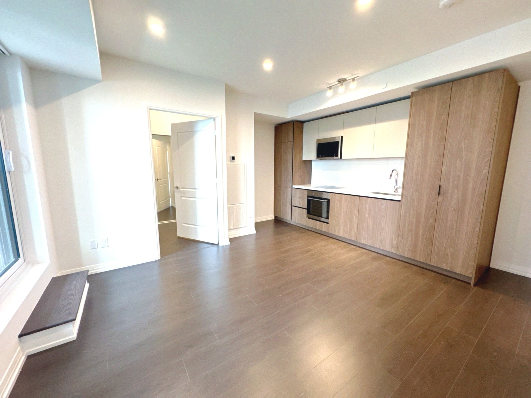 • Modern layout with floor-to-ceiling windows and laminate flooring.