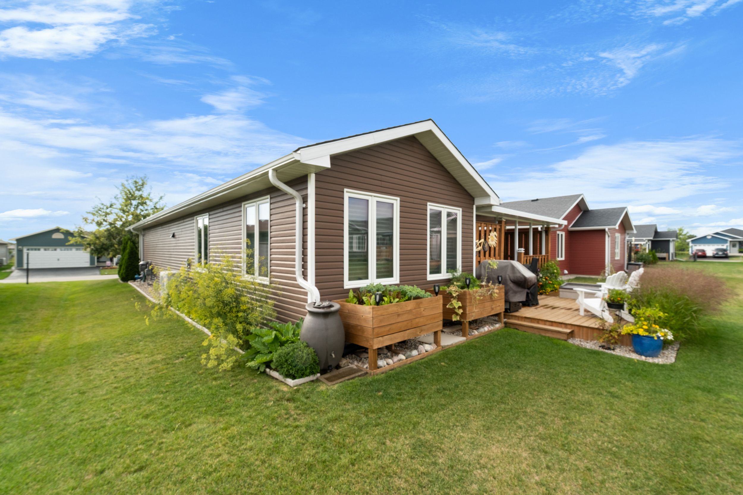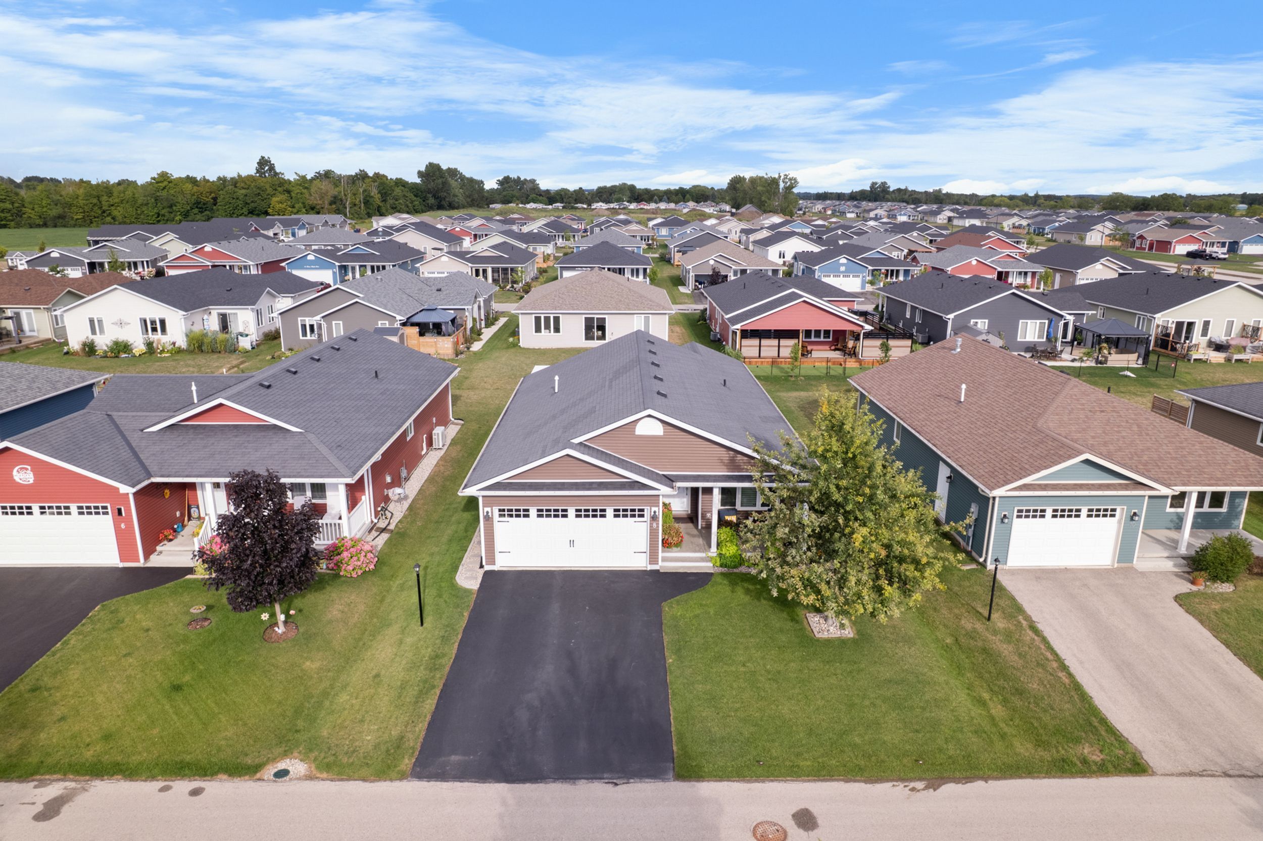 Tucked in the quiet north end of parkbridge's 55+ community, bluffs at huron, this rare upgraded 1,409 sq ft watersedge home proves that downsizing never has to mean dealing things back. The warm chocolate brown exterior sets the tone-distinctive, rich, and just bold enough to stand out. Upgraded flooring leads into a bright contemporary kitchen. Crown moulding, 2 lazy susans, and the tiled backsplash paired w/ a sleek stainless backsplash behind the natural gas stove is a dream for enthusiastic chefs. Custom quartz peninsula lengthened for additional prep space, makes the kitchen a true gathering spot with dining and nearby sitting area. The warm sunroom is complete with a cozy electric fireplace, offering a relaxing place to unwind. Tucked-away primary, has a large walk-in closet, 3-piece ensuite, complete with upgraded vanity w/ stone counters, and heated mirror, for a touch of everyday comfort. Second bedroom works great as a den, too, conveniently near the 4pc bath, at the front of the house. Convenience in the laundry room, w/ upgraded upper & lower cabinetry, and a must-have deep laundry sink- great for clothes & pets! Full 2-car garage off the laundry has been thoughtfully improved, w/ upgraded garage door w/ windows, and epoxy-finished floor -- a bright & polished space. Even the crawlspace has been improved & insulated to function strategically as cool storage, even lit w/ upgraded lighting. Outside, the impressive 12' x 20' deck w/ privacy fence has a permanent strictly sunrooms' awning that offers the potential to add walls for a more enclosed sun porch in the future. A second 12' x 10' lower deck brings you closer to the beautifully landscaped surroundings. Finally, location. Windward way north is one of the community's most desirable pockets with the convenience of straightforward access in and out, no winding crescents, just an easy drive home. A rare blend of thoughtful upgrades valued at over $55,000, this next chapter will feel like the right move.